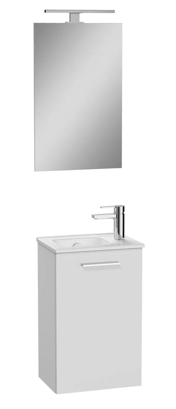 Sisältäen: allaskaappi 40cm altaalla, peili ja LED-valaisin IP44. Kaapin syvyys on vain 28cm, joten tuote sopii hyvin pieneen (erilliseen) vessaan käsienpesua varten. Kosteudenkestävä melamiinipinnoitettu kalustelevy, runko ja ovi kiiltävä valkoinen, 1kpl softclose-ovi, kromattu vedin, valkoinen ylivuotosuojalla varustettu Vitra-posliiniallas (390x280mm), oikeakätinen VitrA Hygiene-antibacteria lasitteella.