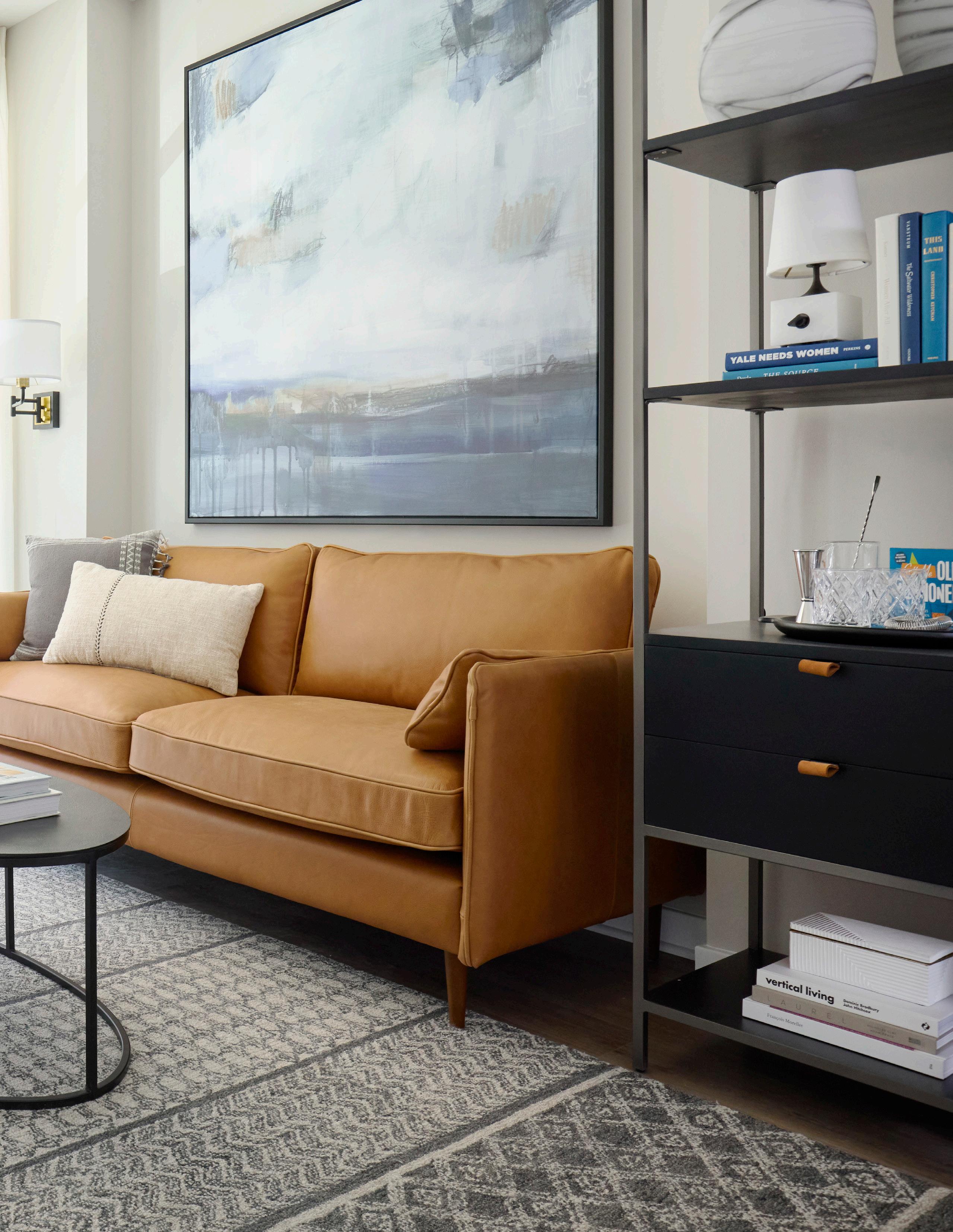 Style: Peaceful sanctuary, connecting residents to nature. Inspired by the owner’s vision of a park-like setting with trails and native landscaping, the interiors reflect a natural theme. A warm, earthy palette of umber, grays, blues, and greens is accented by bronze, black, and copper, and grounded in natural materials like wood, leather, jute, and linen.