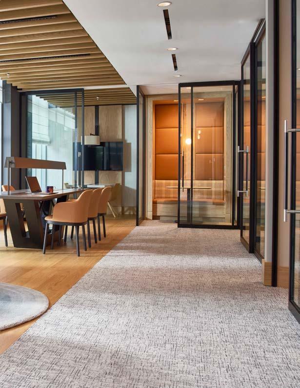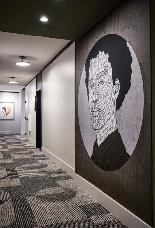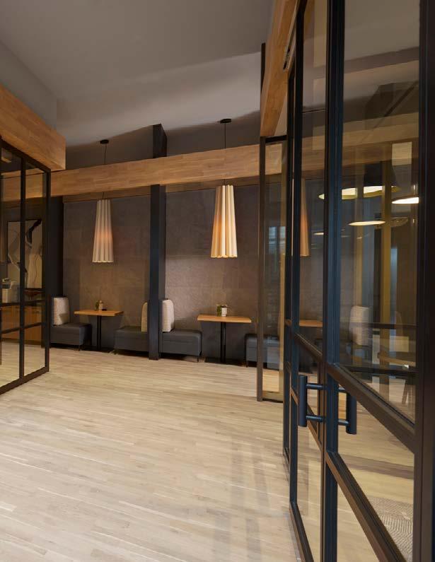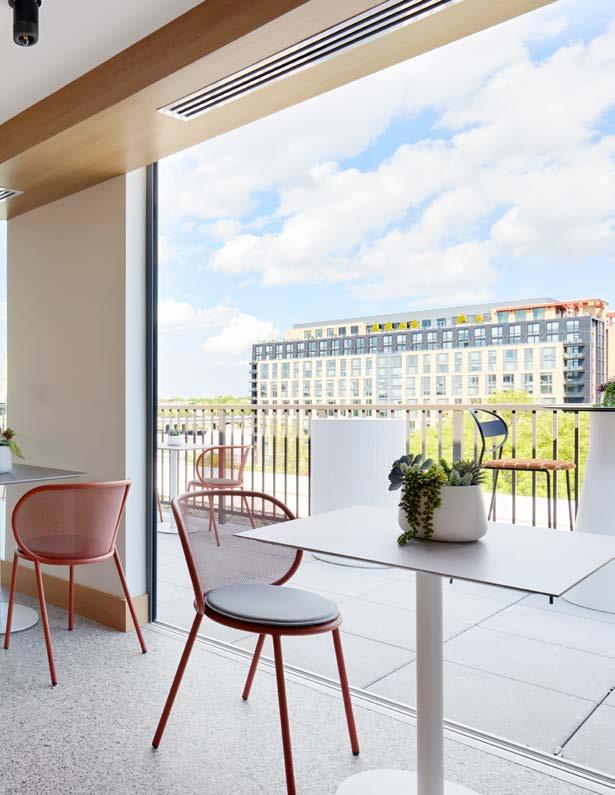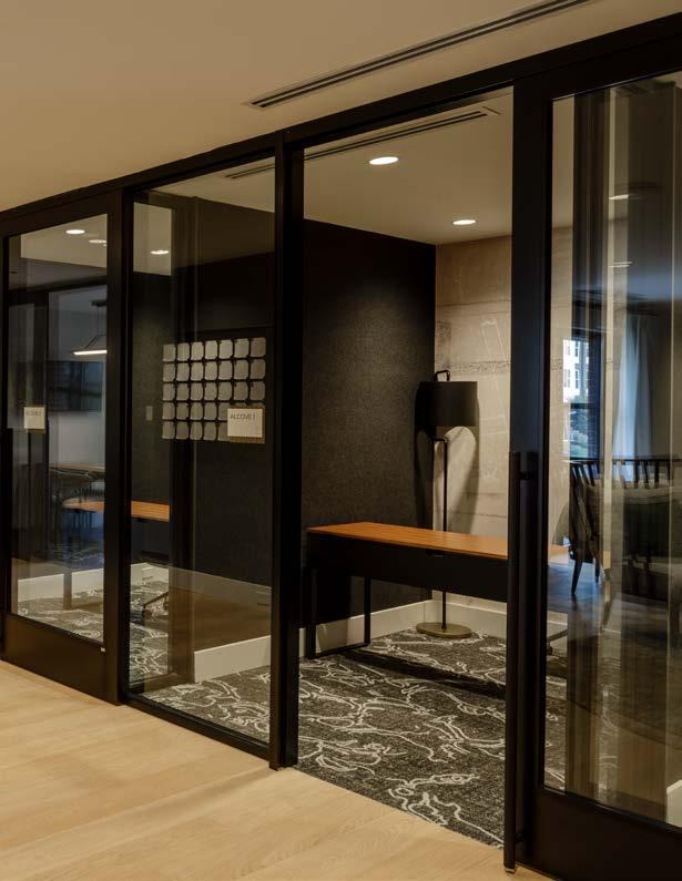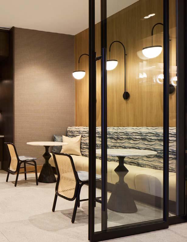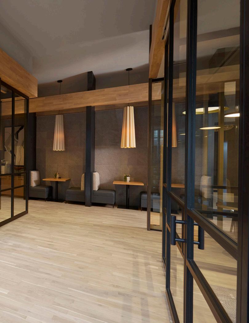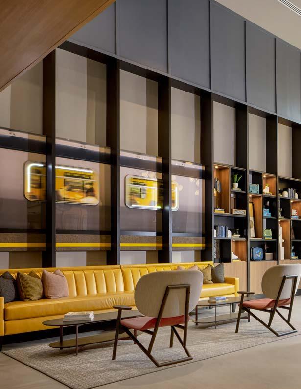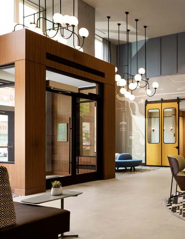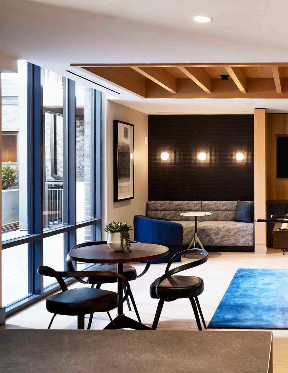 Style: Blends playful vintage charm with sleek contemporary style. A vibrant color palette, anchored by black, white, and warm wood tones, is brought to life with standout touches like lockable subway doors. Full-height glass, soaring ceilings, and views of the courtyard create a bright, airy space that connects effortlessly to both the city and nature.