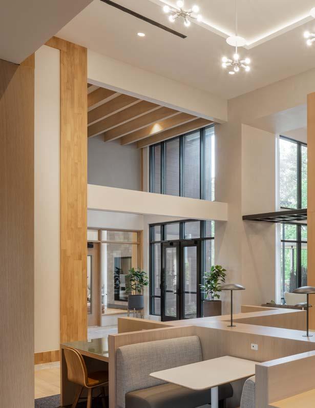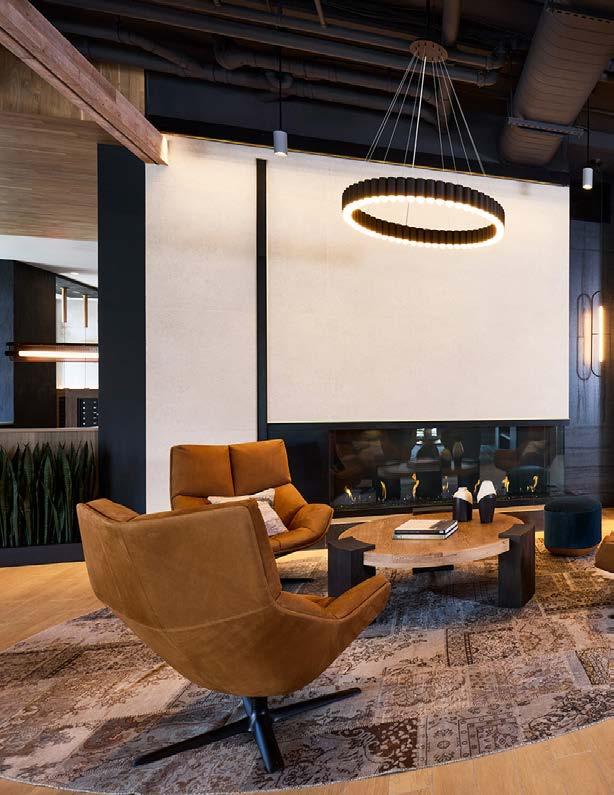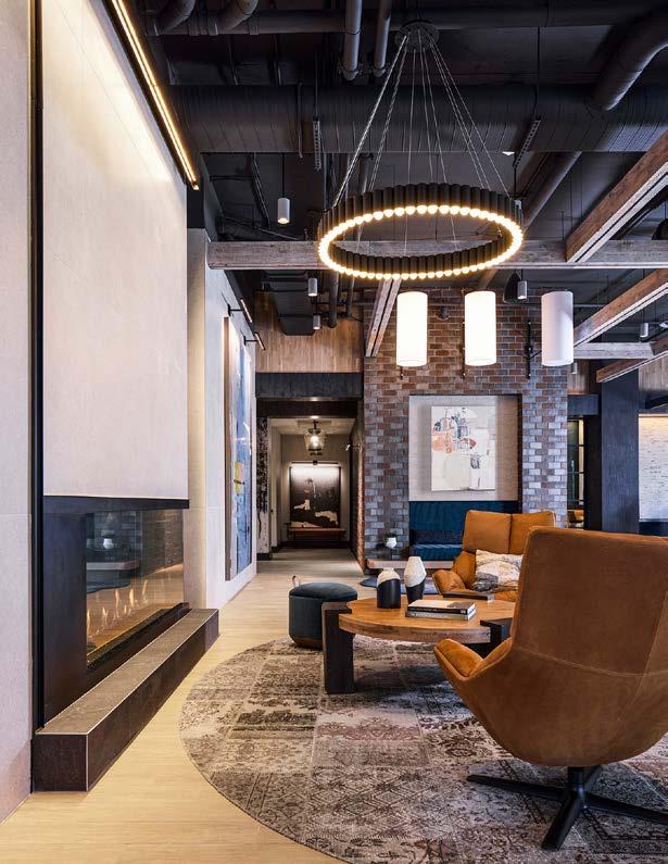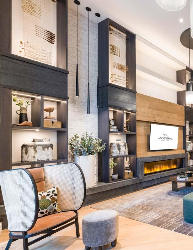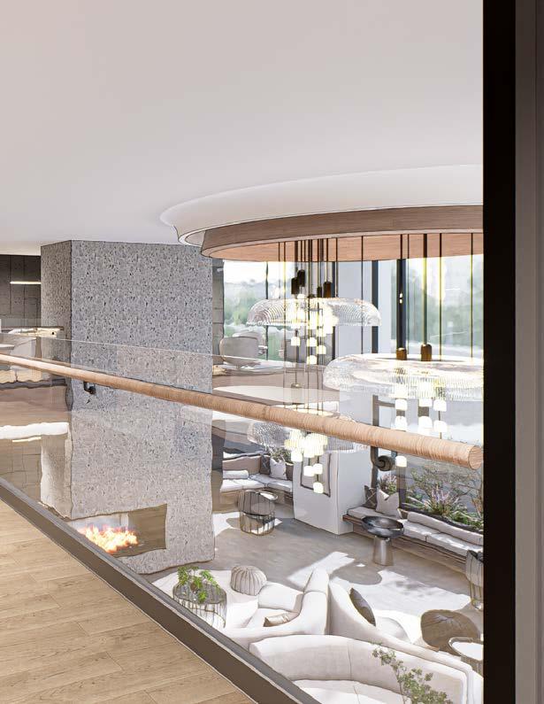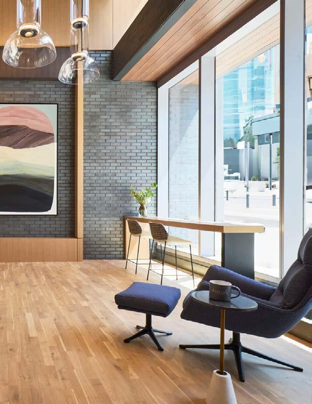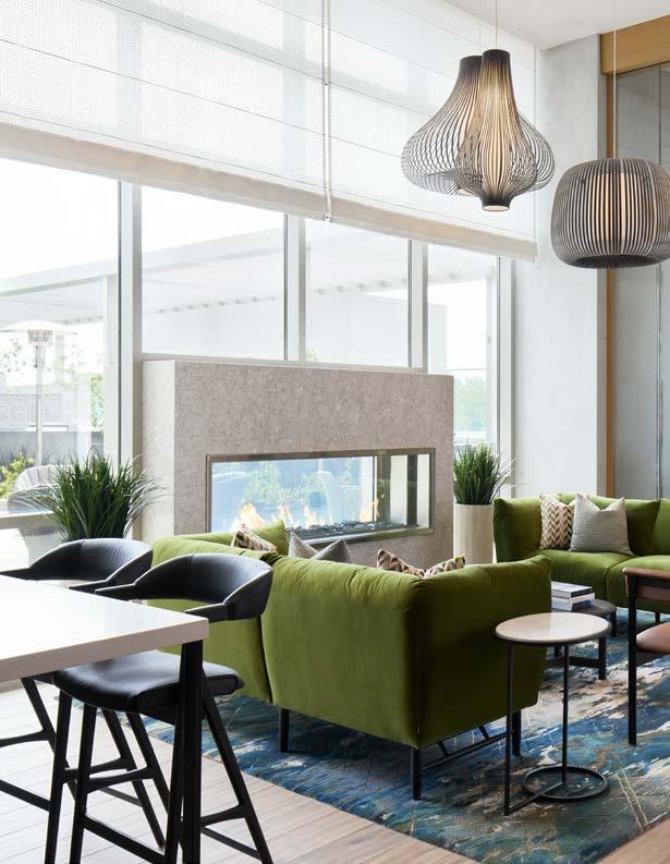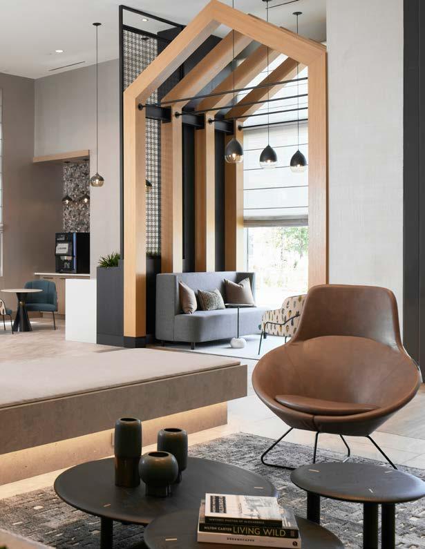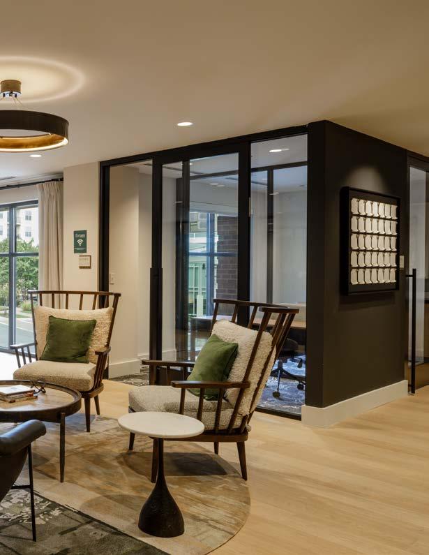 Style: Blends curated comfort with purposeful luxury, offering remote workspaces. The interior design promotes happiness and wellness through light-filled spaces, natural greenery, sustainable finishes, and thoughtful details. A welcoming fireplace and bubbling water feature set the tone, creating a serene, nature-connected environment that builds community and elevates everyday living.