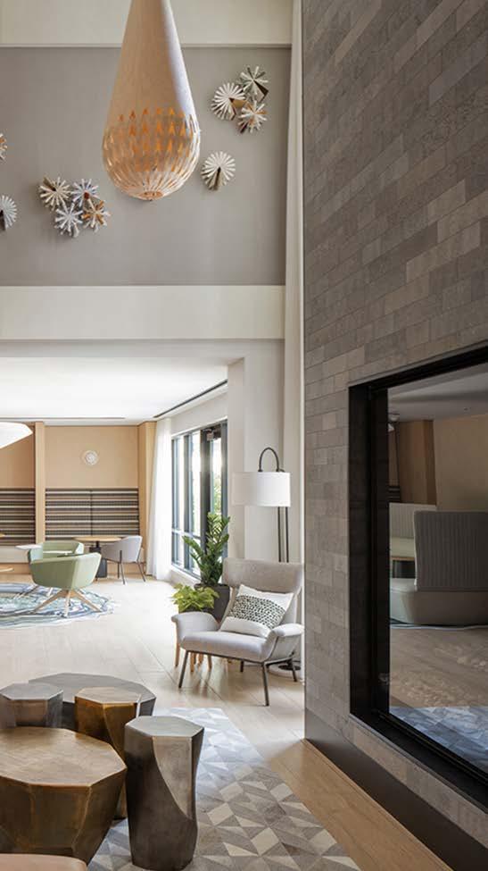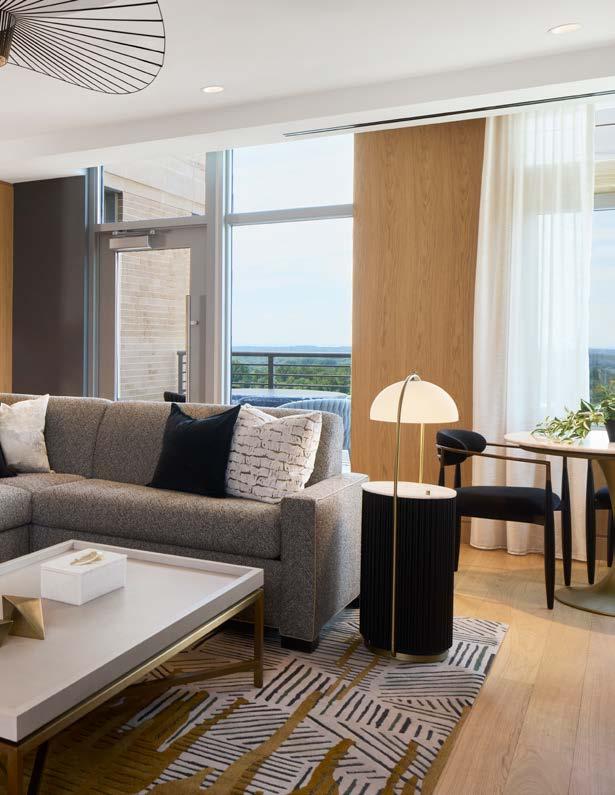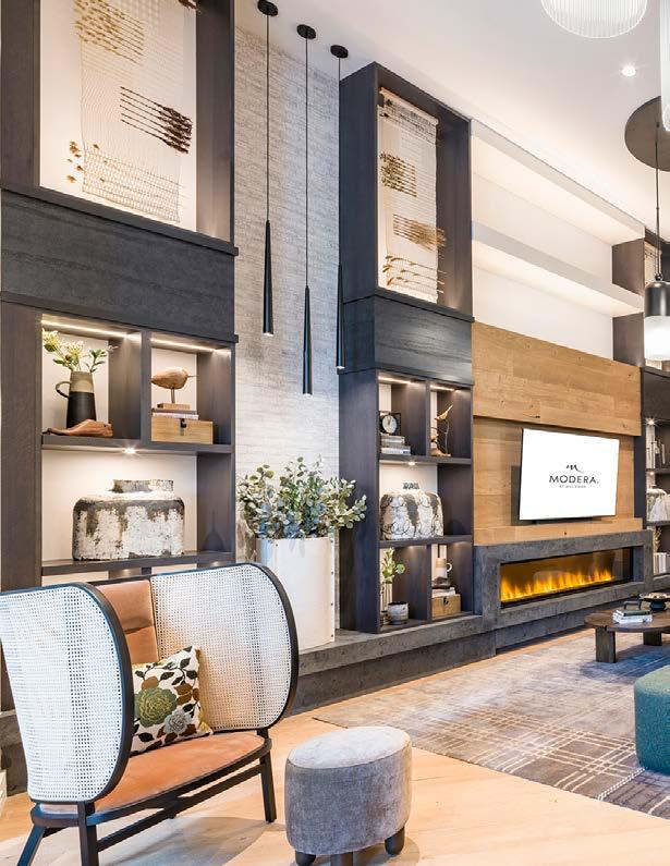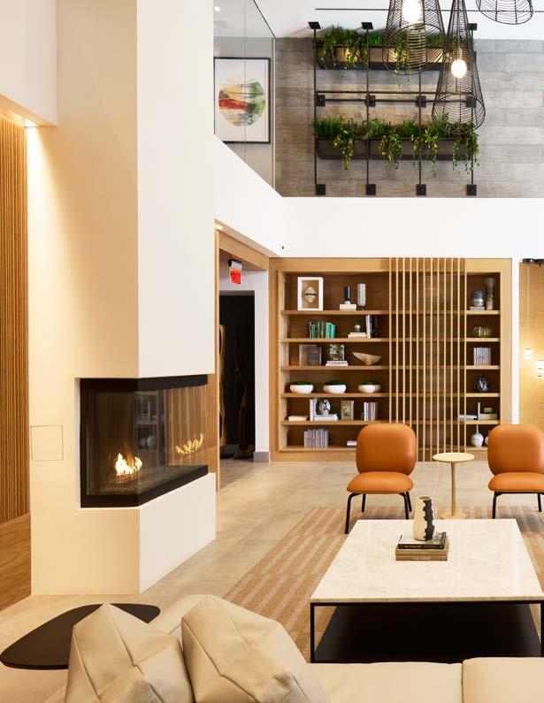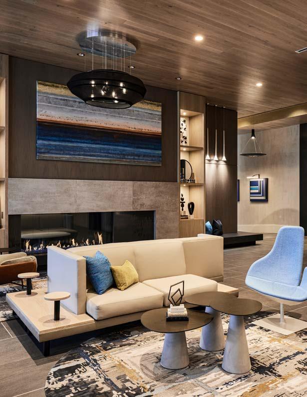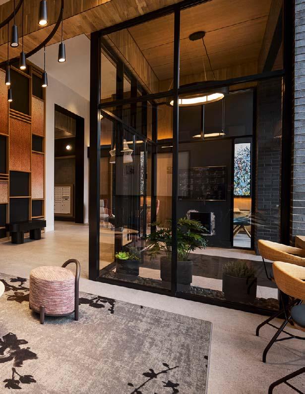 Style: Blending curated comfort with purposeful luxury, offering remote workspaces. The interior design promotes happiness and wellness through light-filled spaces, natural greenery, sustainable finishes, and thoughtful details. A welcoming fireplace and bubbling water feature creates a serene, nature-connected environment that builds community and elevates everyday living.