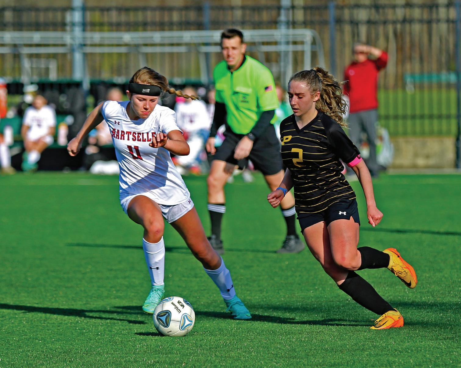 PHOTO BY JIM MEADOWS Anna Katherine Hopkins and a Hartselle player battle for the ball in the Morgan County Tournament finals last Saturday