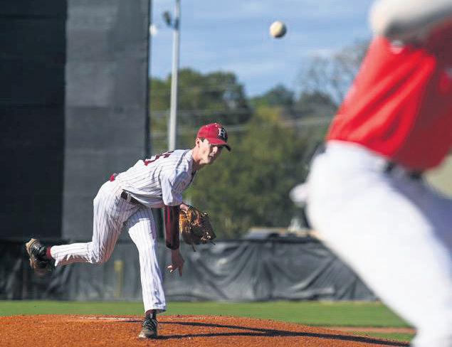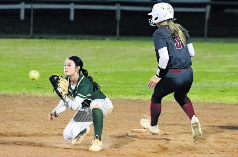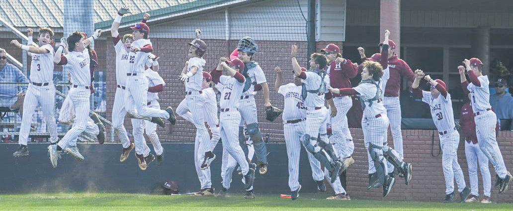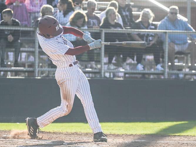 PHOTOS BY JERONIMO NISA Clockwise from top, Hartselle’s Brody Leathers hits a single against Decatur; Hartselle’s Cade Miles (3) throws to first to complete a double play after forcing out Decatur’s Bradin Dupper at second during the game in Hartselle April 4; Steele hits a grand slam; Steele, second from left, celebrates with his team after his two run home run against Decatur; Hartselle’s Nic Chumley on the pitcher’s mound against the Red Raiders.