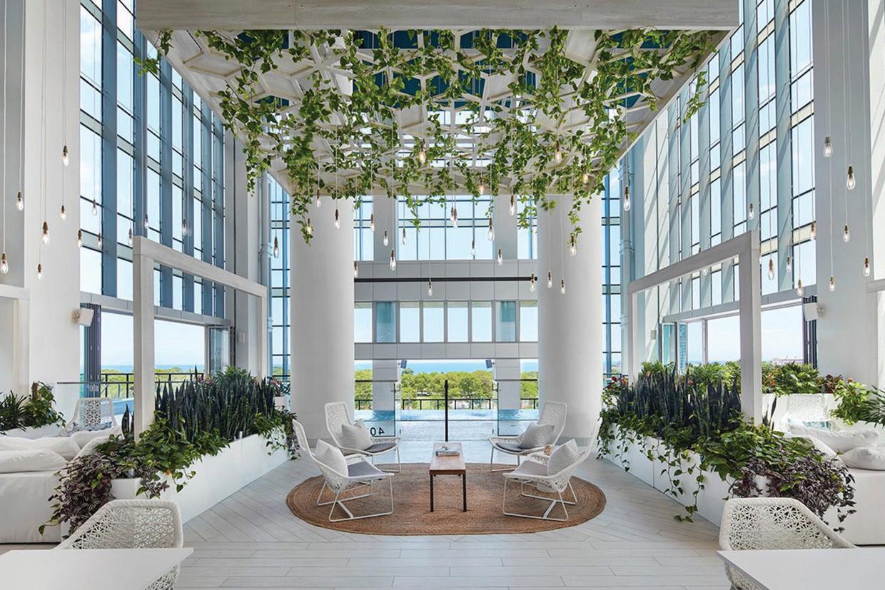 The Essex on the Park winter garden and pool space, which opens up to Grant Park to the east and visually connects to the historic hotel to the south, recalls the days when mid-century travelers sunbathed on the rooftop pool
