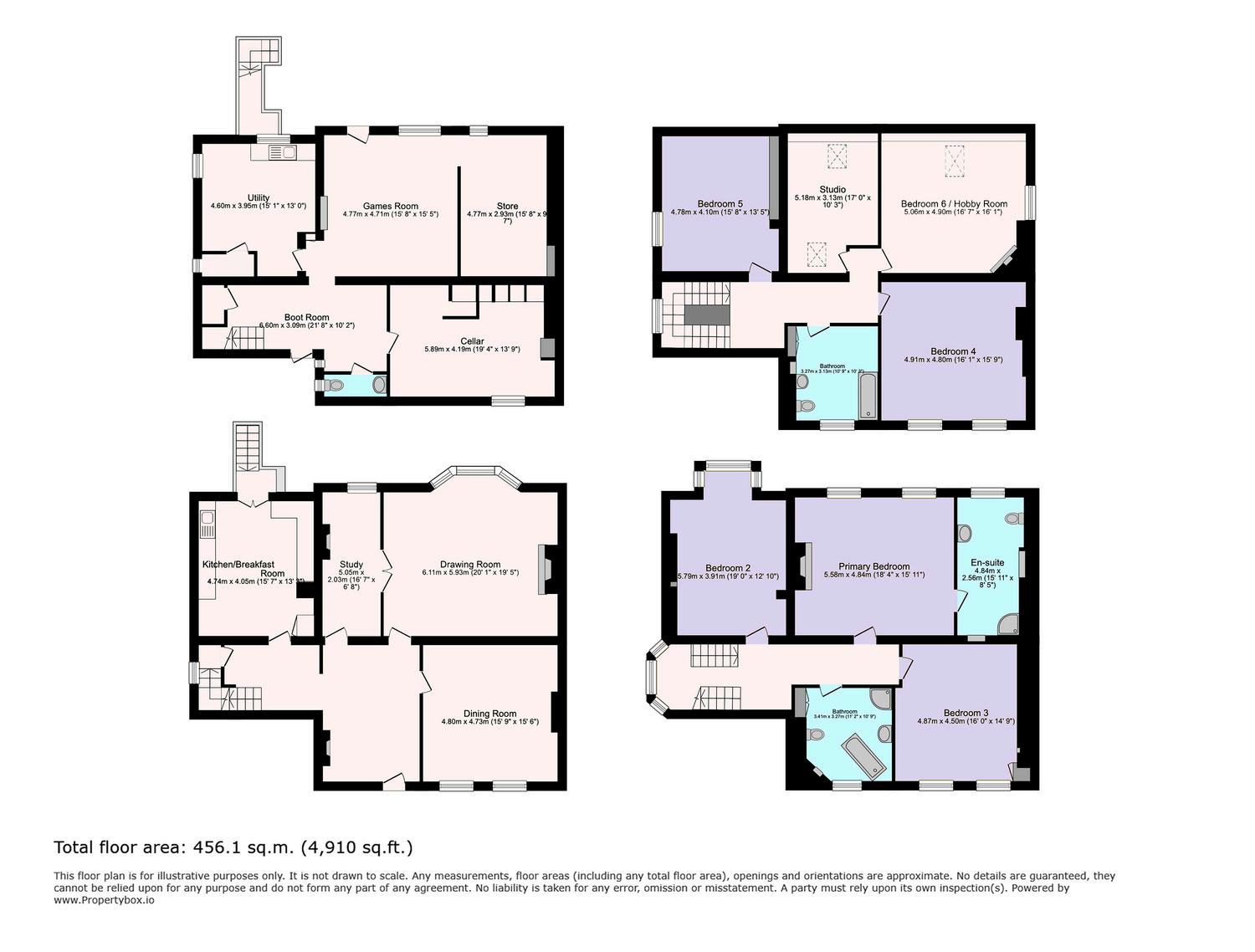 The ground floor is both impressive and inviting, with a welcoming entrance hall leading to a series of well-proportioned reception rooms including a drawing room, dining room, study and kitchen. The upper floors provide five-six versatile bedrooms, including a principal suite, alongside well-appointed bathrooms and a flexible hobby room. Below, there is a dry cellar, boot room, utility, storage and generous stone-flagged spaces.