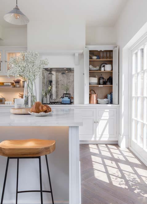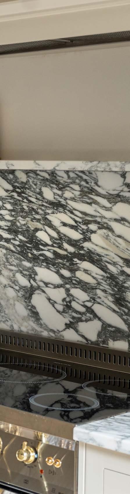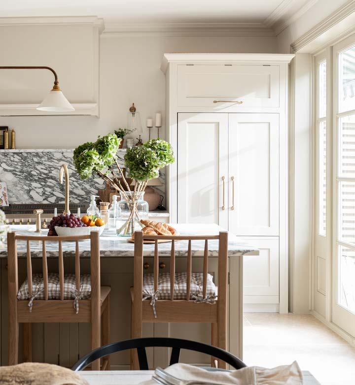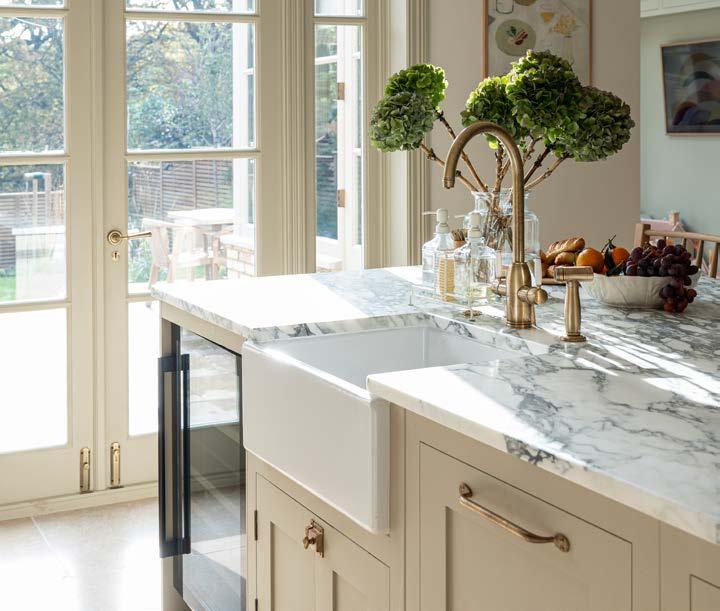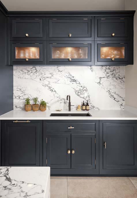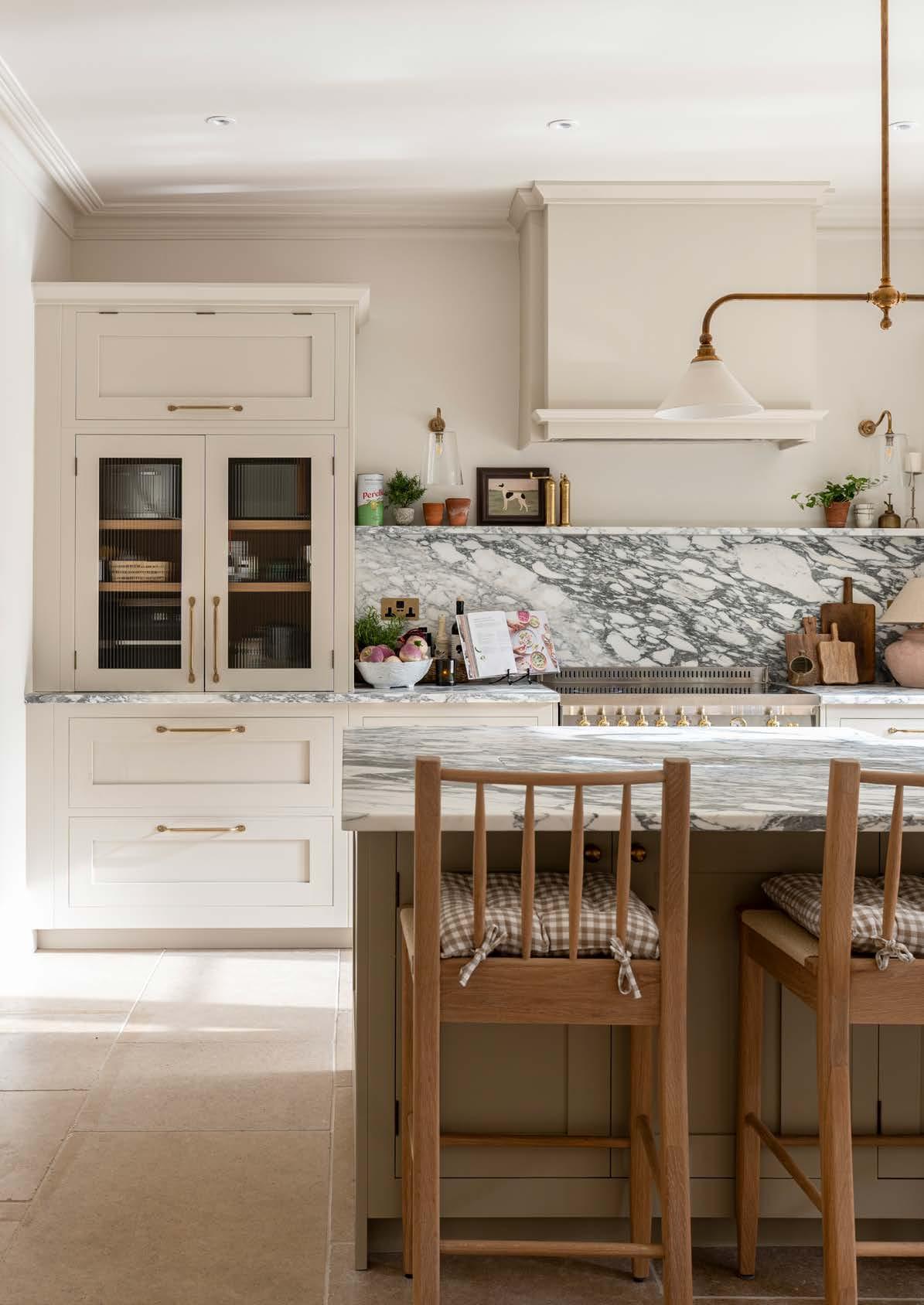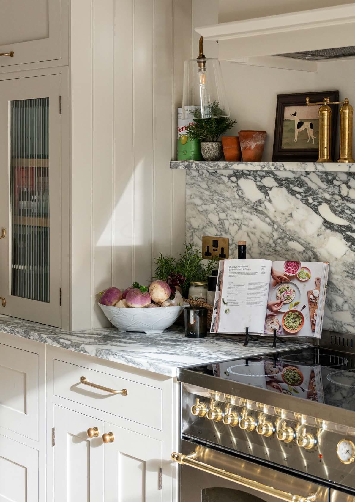 natural drama of the Arabescato Vagli marble splashback to shine. Echoing the curves of the island, the marble frames the range cooker with striking symmetry. Dark-framed reeded glass doors conceal a breakfast larder beyond, adding a touch of contrast to this beautifully balanced design.
