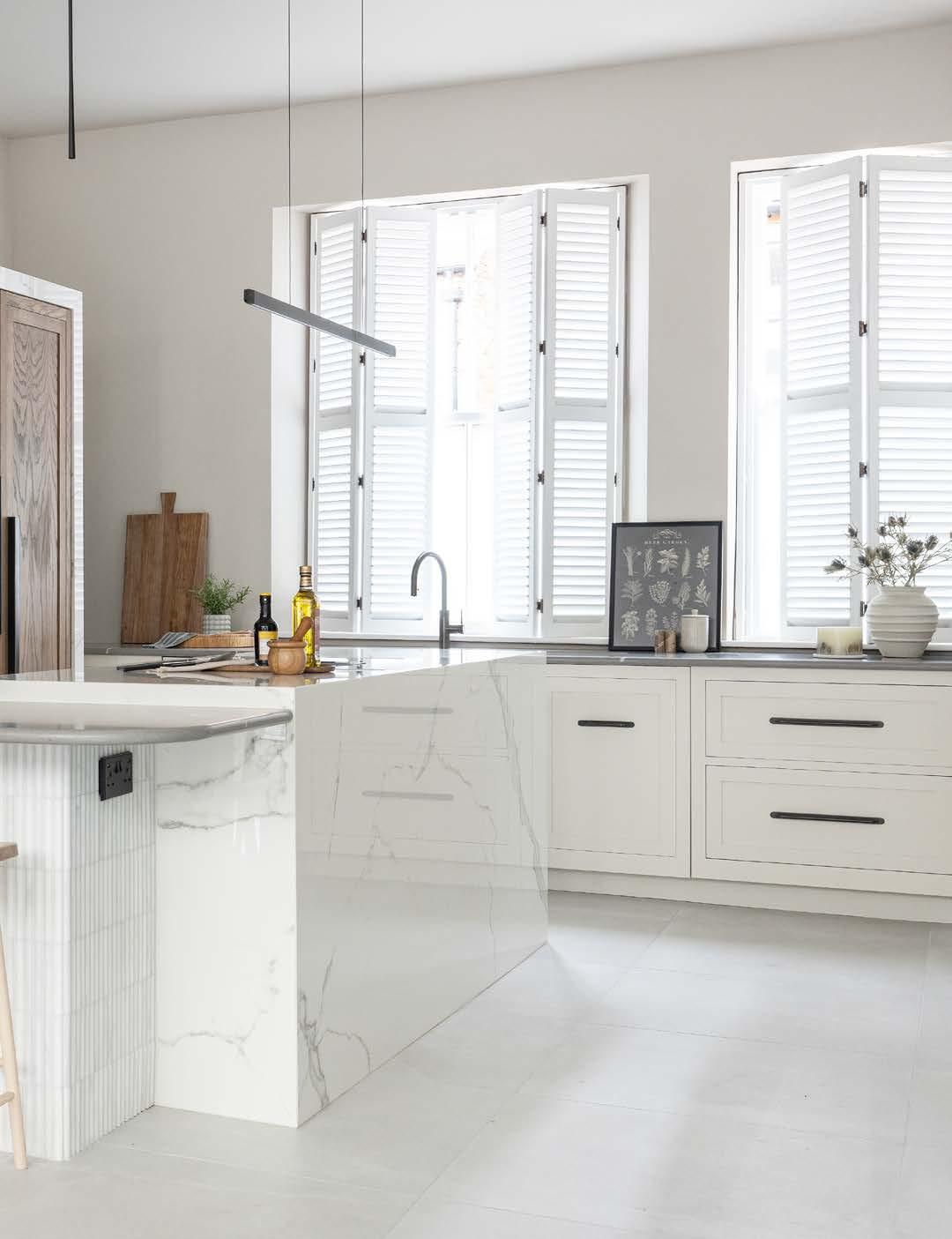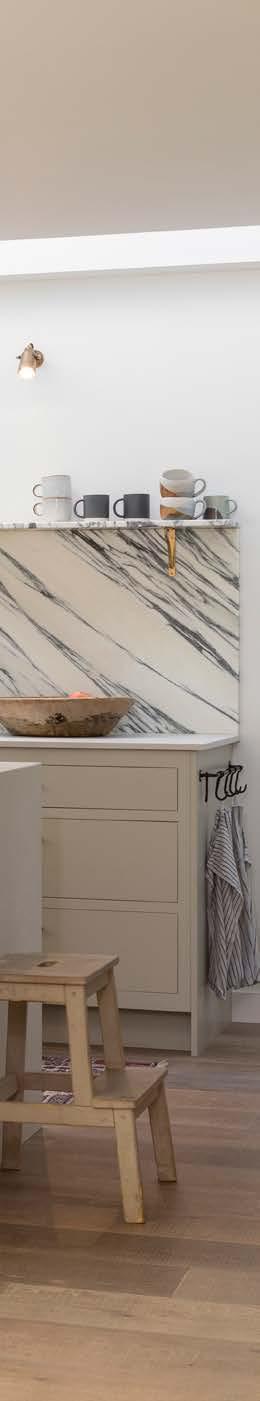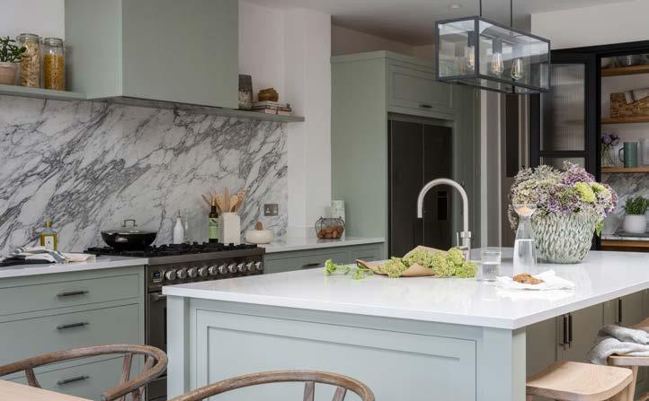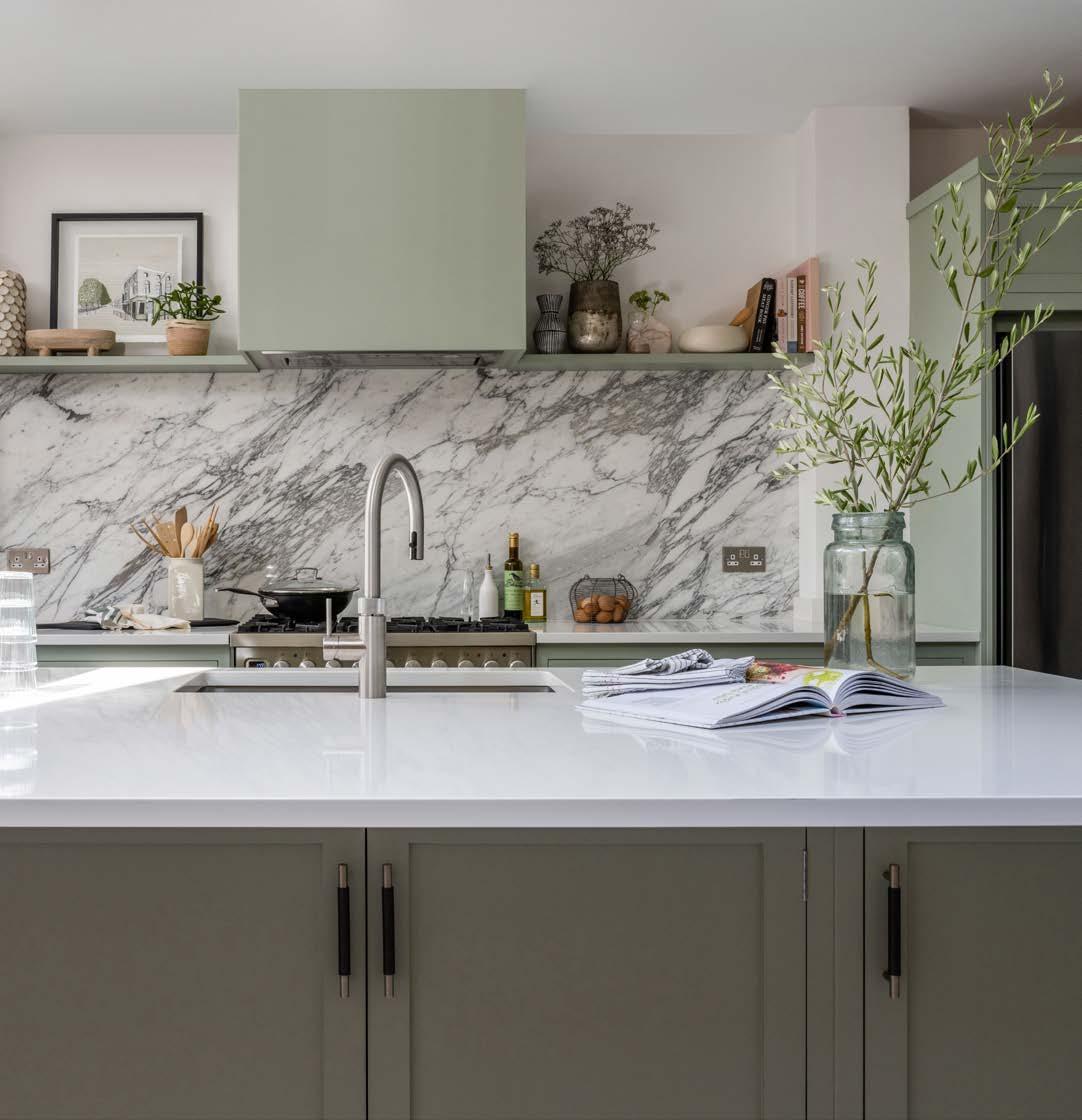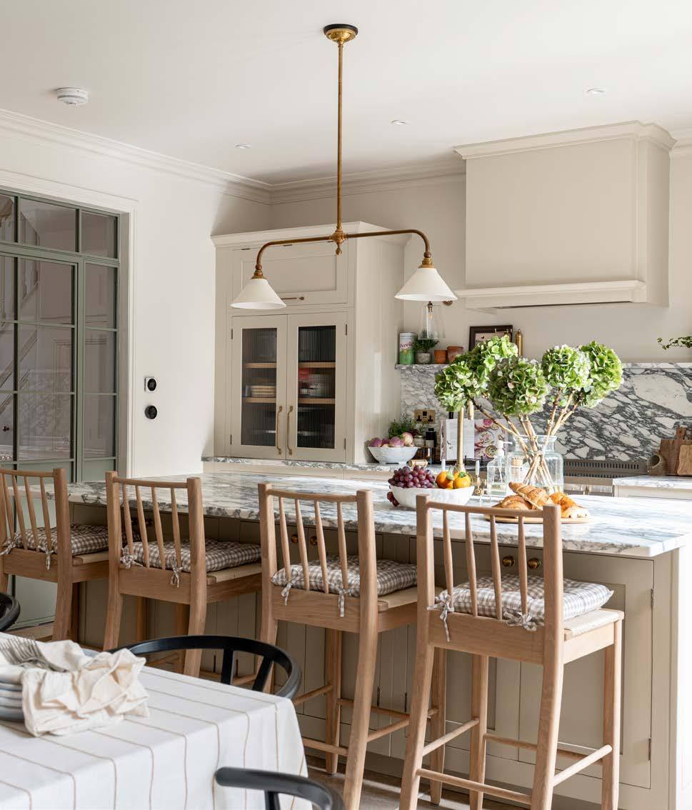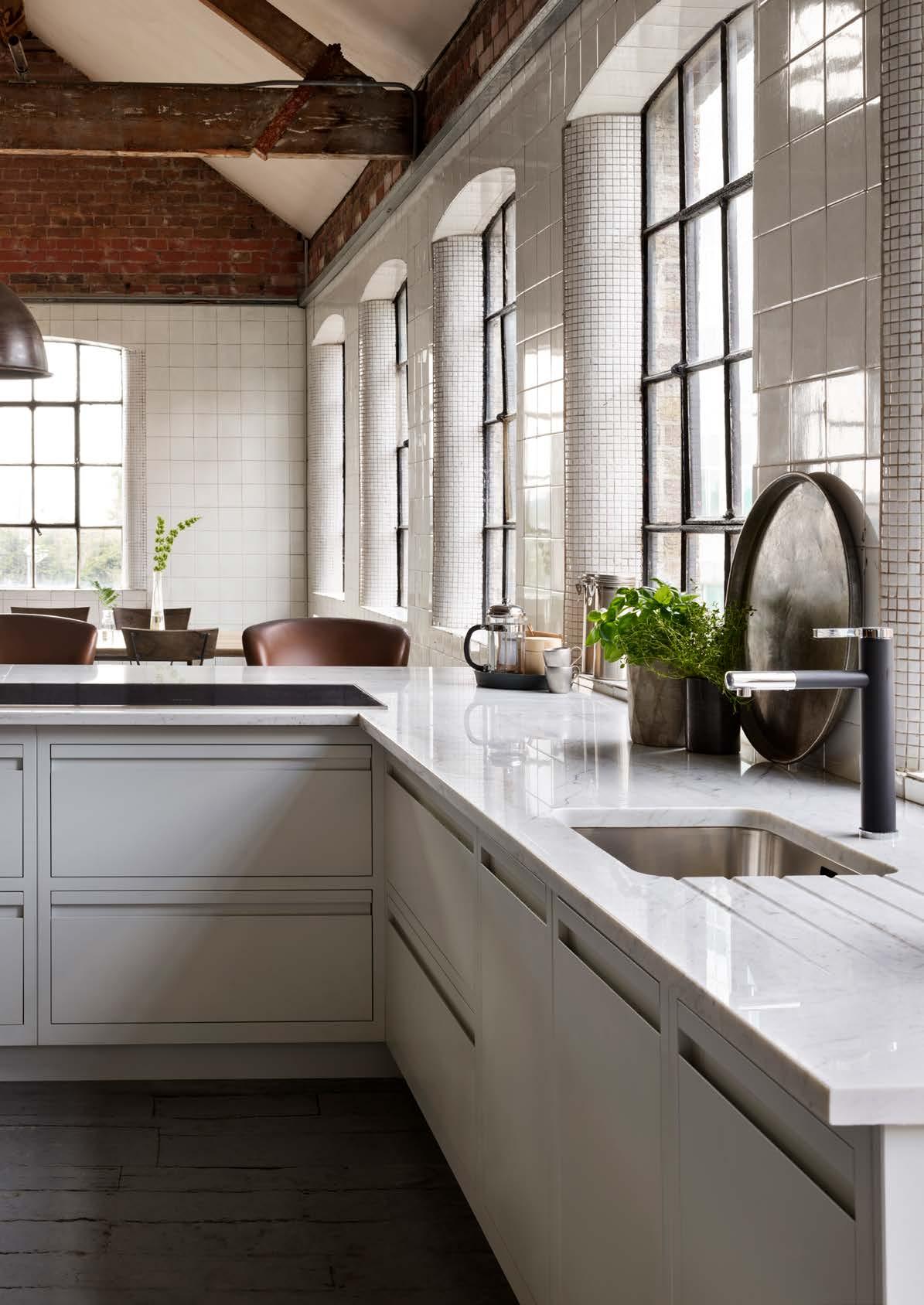 natural drama of the Arabescato Vagli marble splashback to shine. Echoing the curves of the island, the marble frames the range cooker with striking symmetry. Dark-framed reeded glass doors conceal a breakfast larder beyond, adding a touch of contrast to this beautifully balanced design.