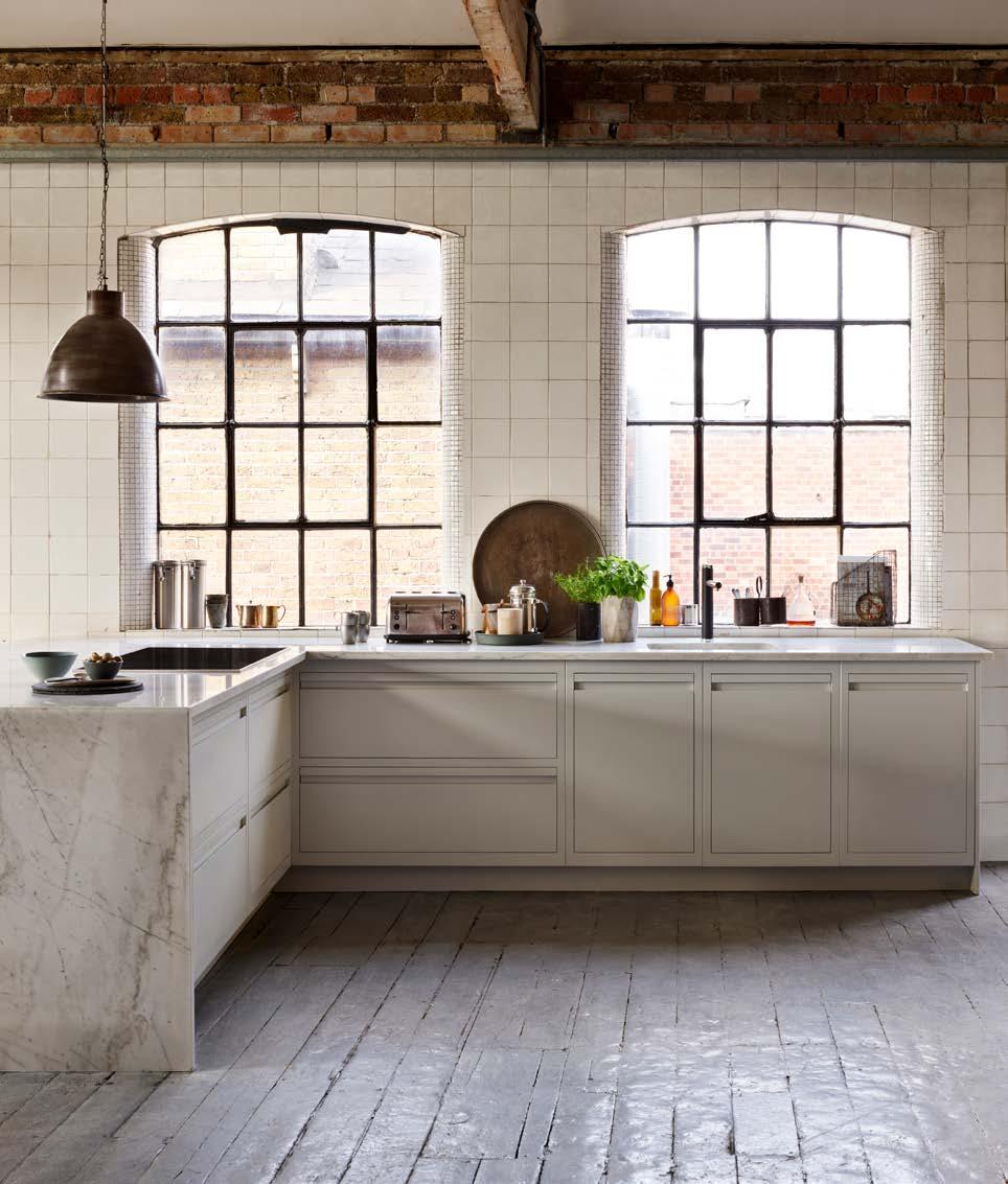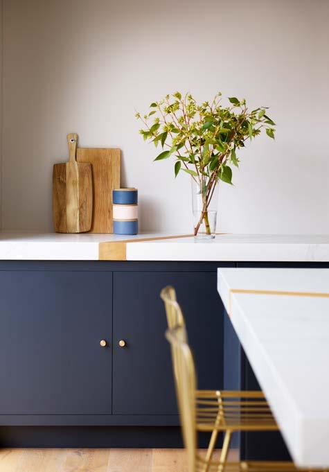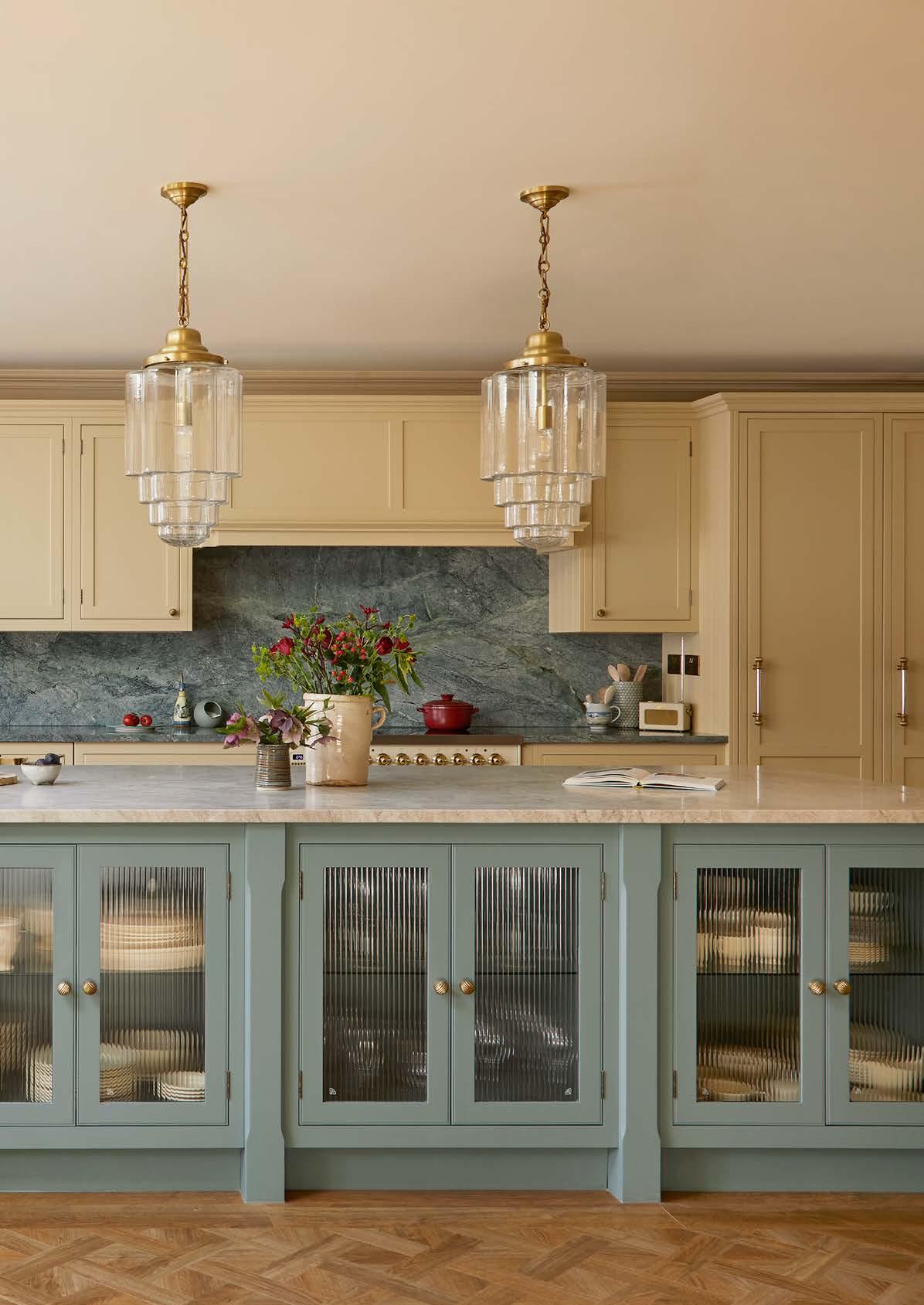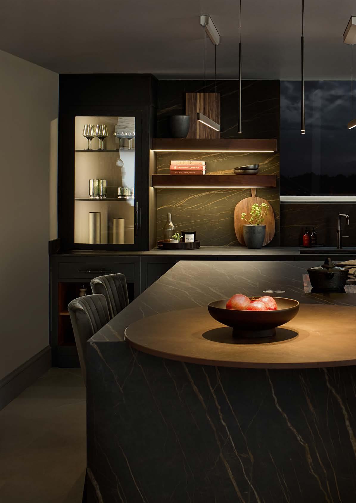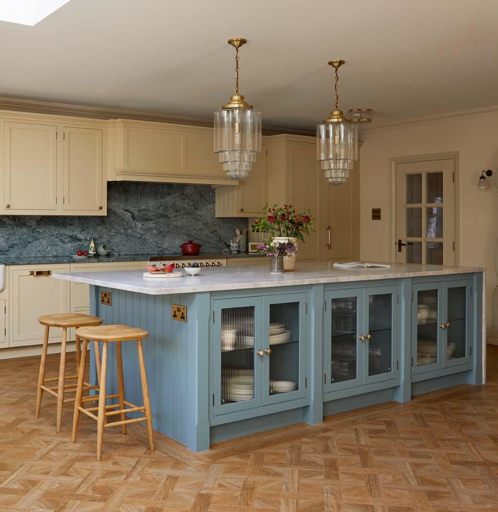 natural drama of the Arabescato Vagli marble splashback to shine. Echoing the curves of the island, the marble frames the range cooker with striking symmetry. Dark-framed reeded glass doors conceal a breakfast larder beyond, adding a touch of contrast to this beautifully balanced design.