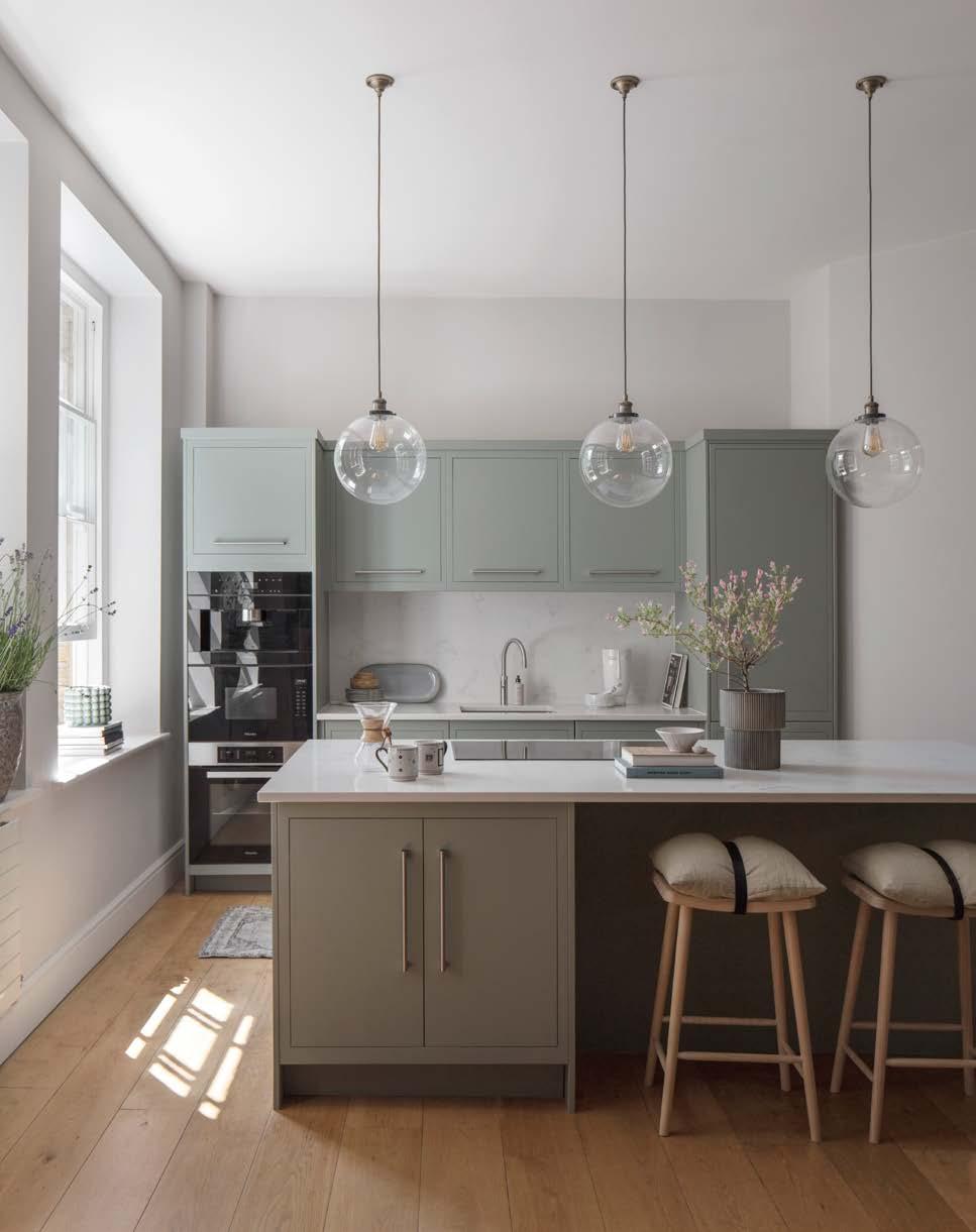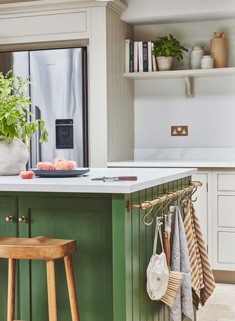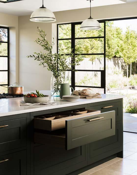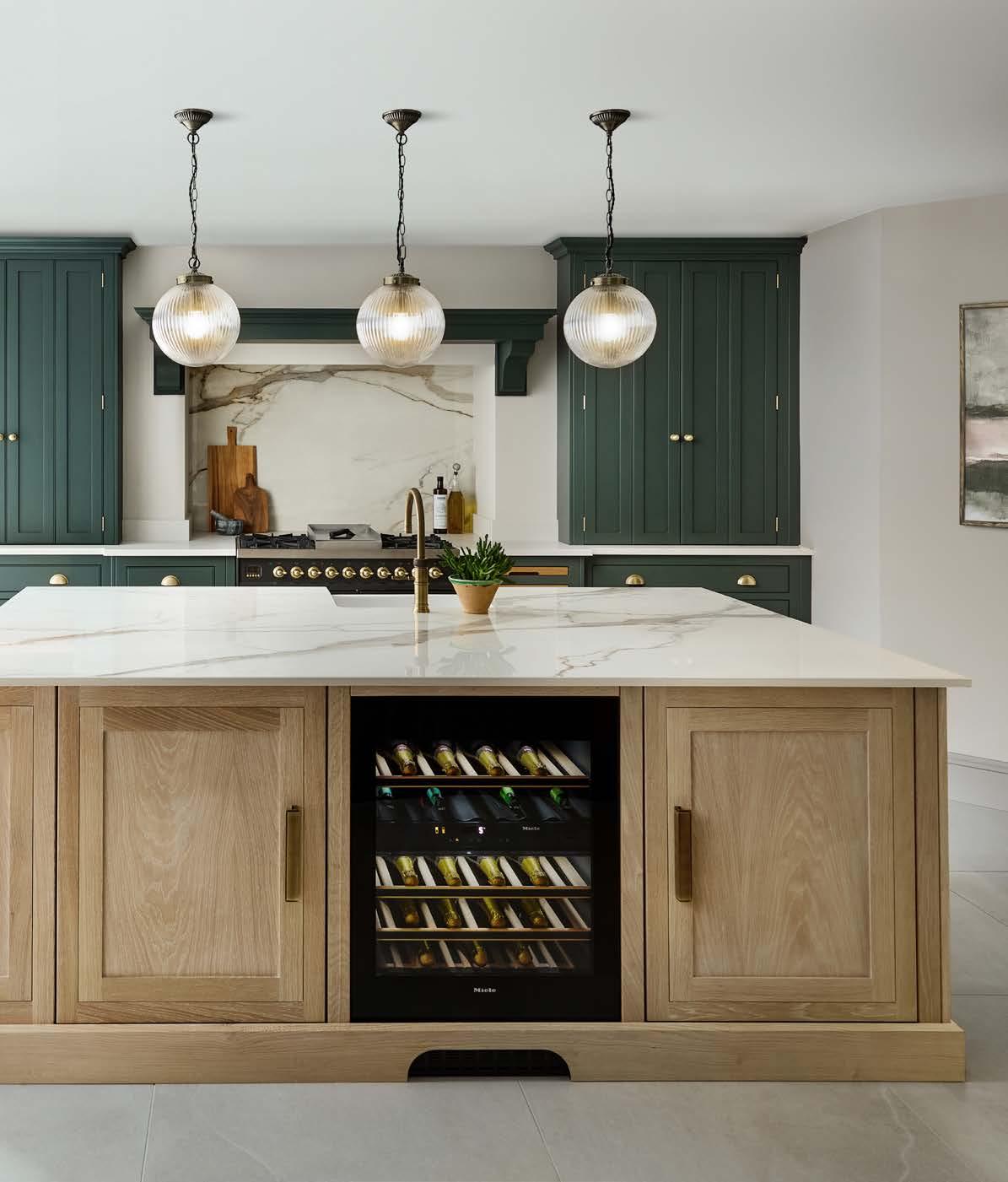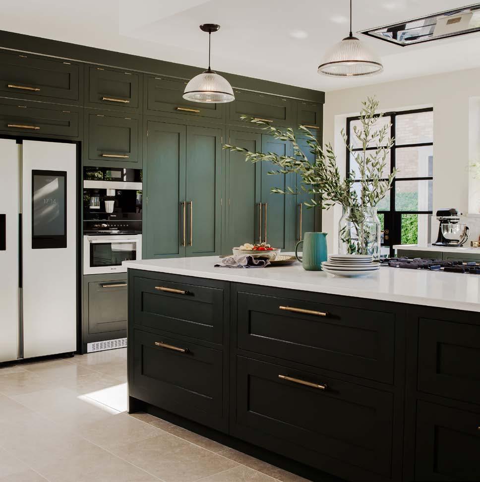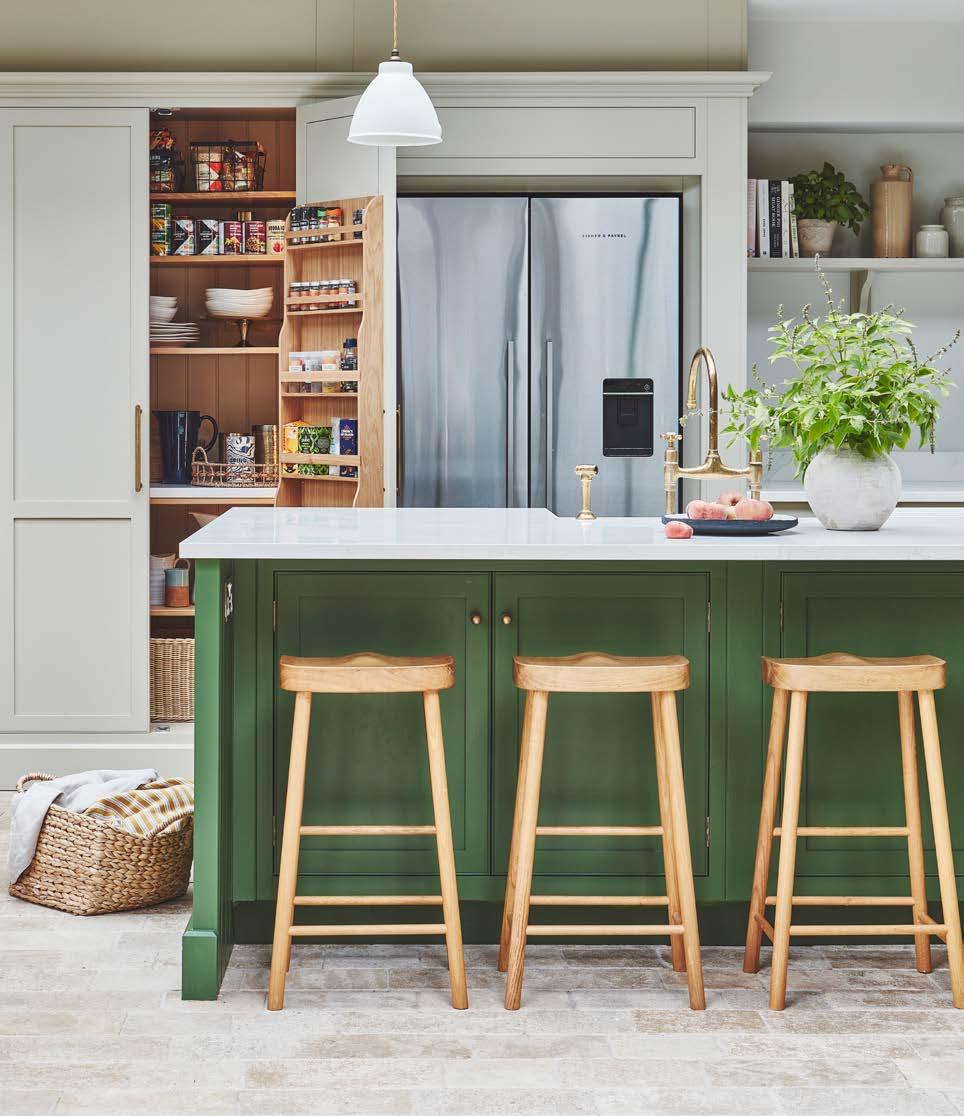 “This Shaker kitchen is perfectly balanced with a statement island creating a division between the food preparation area and a sociable dining space. With ample storage in the island, including drawers for storing serveware, floor-to-ceiling units and a pantry larder, this space is just as organised behind the rich green cabinetry.”