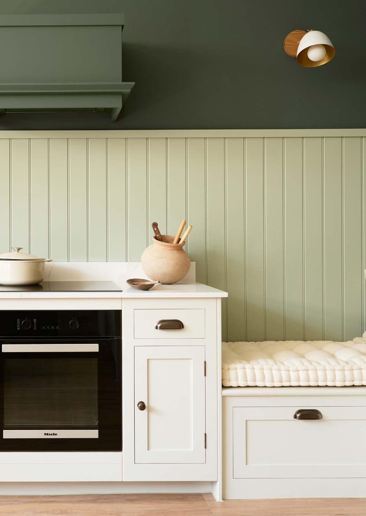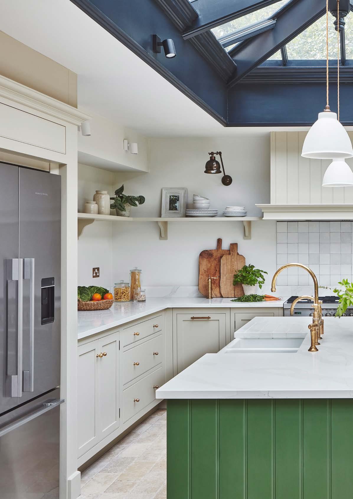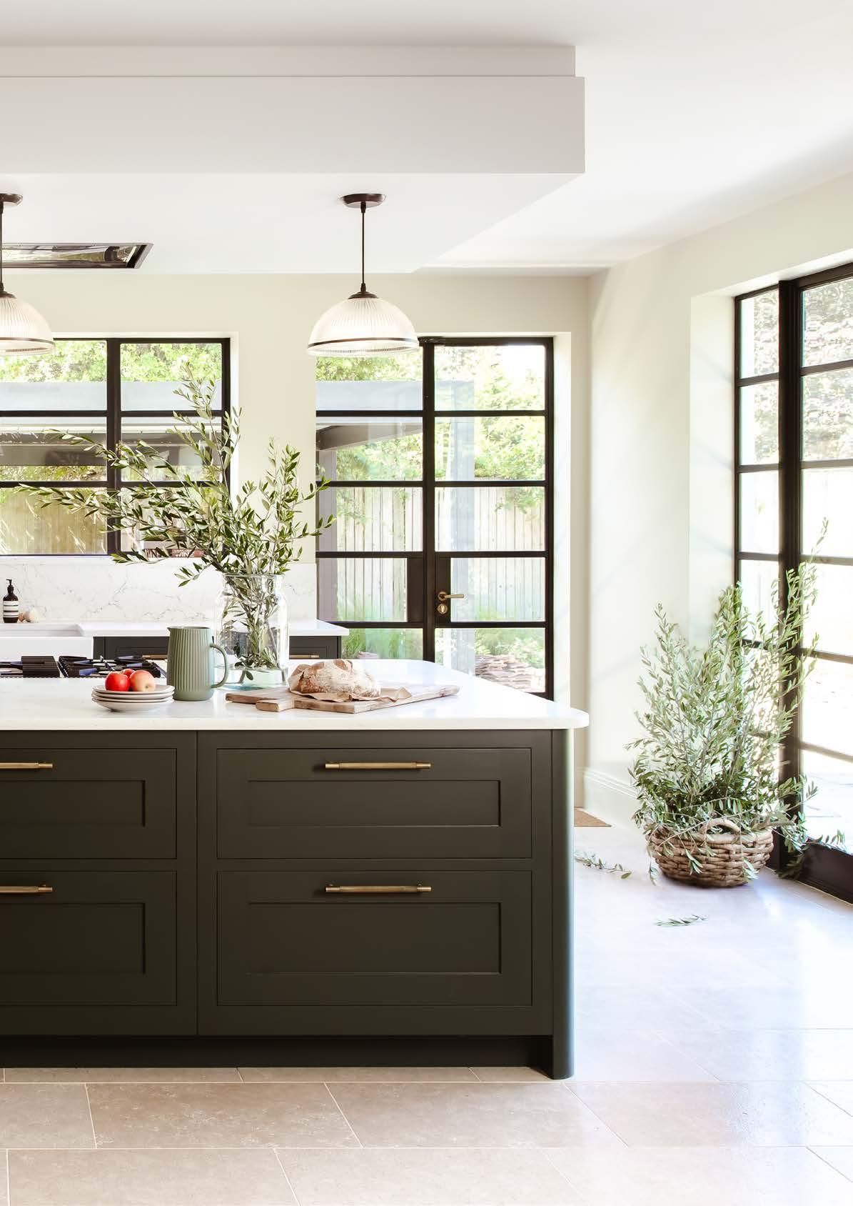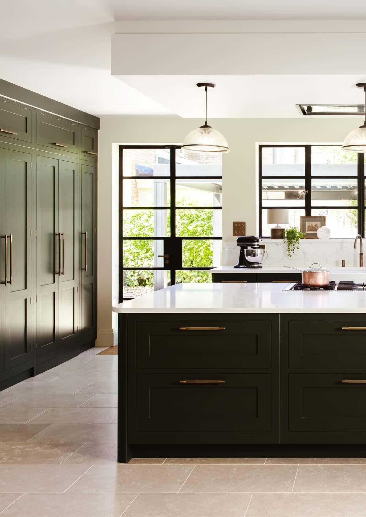 This Arbor kitchen balances individuality with understated elegance. The eye is immediately drawn to the striking green island at the centre of the room, a vibrant pop of colour against the perimeter cabinetry hand-painted in the soothing neutral shade, Vanilla.