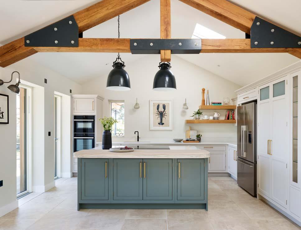 Every element has been chosen to reflect the family’s lifestyle. Natural oak shelves introduce warmth and offer space to showcase treasured pieces, while the Belfast sink and vaulted ceiling add a traditional edge. Black metal pendants over the island bring a touch of contrast and modern refinement, tying together a space where function and feeling are perfectly in tune.