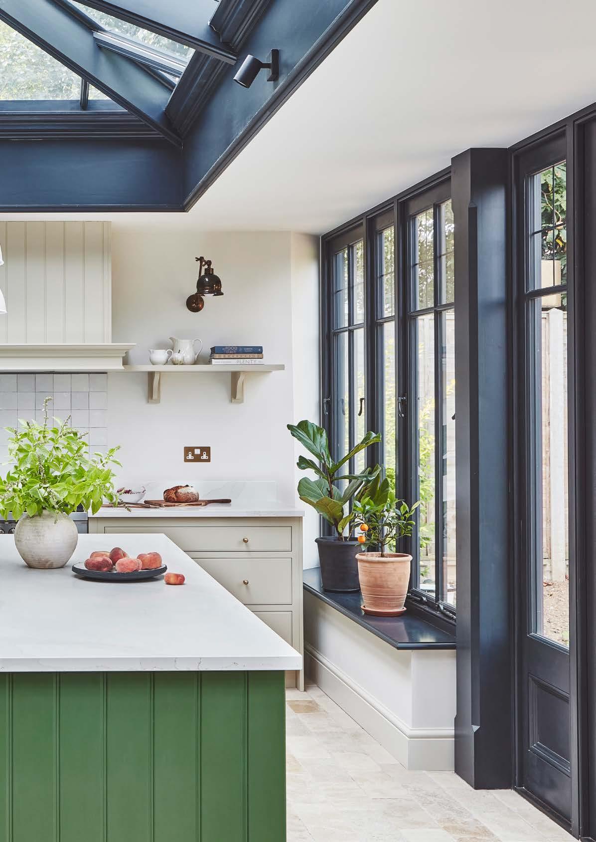 The L-shaped layout places nature front and centre, framing unobstructed views of a leafy orangery garden through chic French doors. Furnished with bar stools, the central island offers an inviting spot for people to sit and gather, before following the open plan flow through to the adjacent dining area for dinner.
