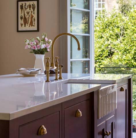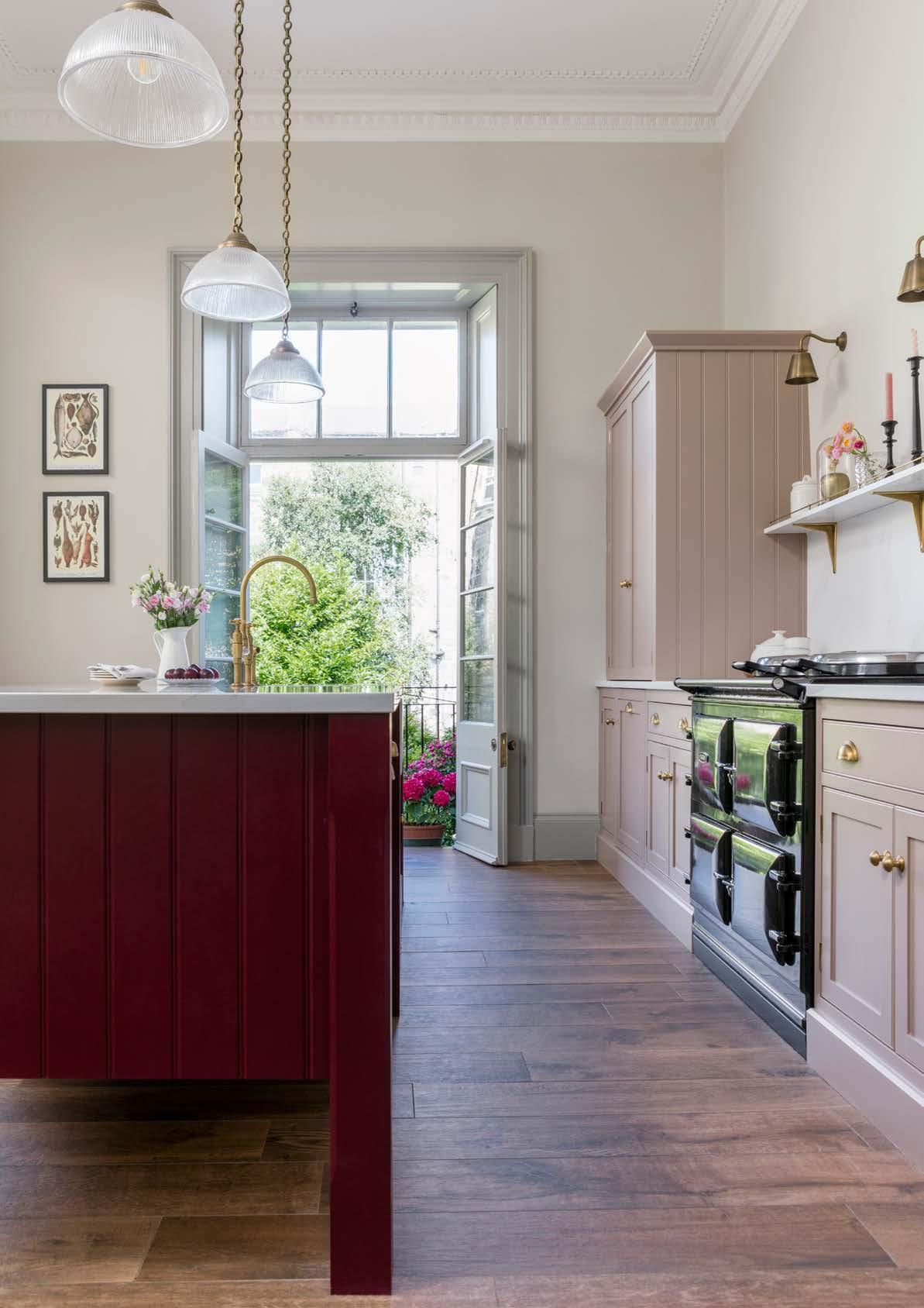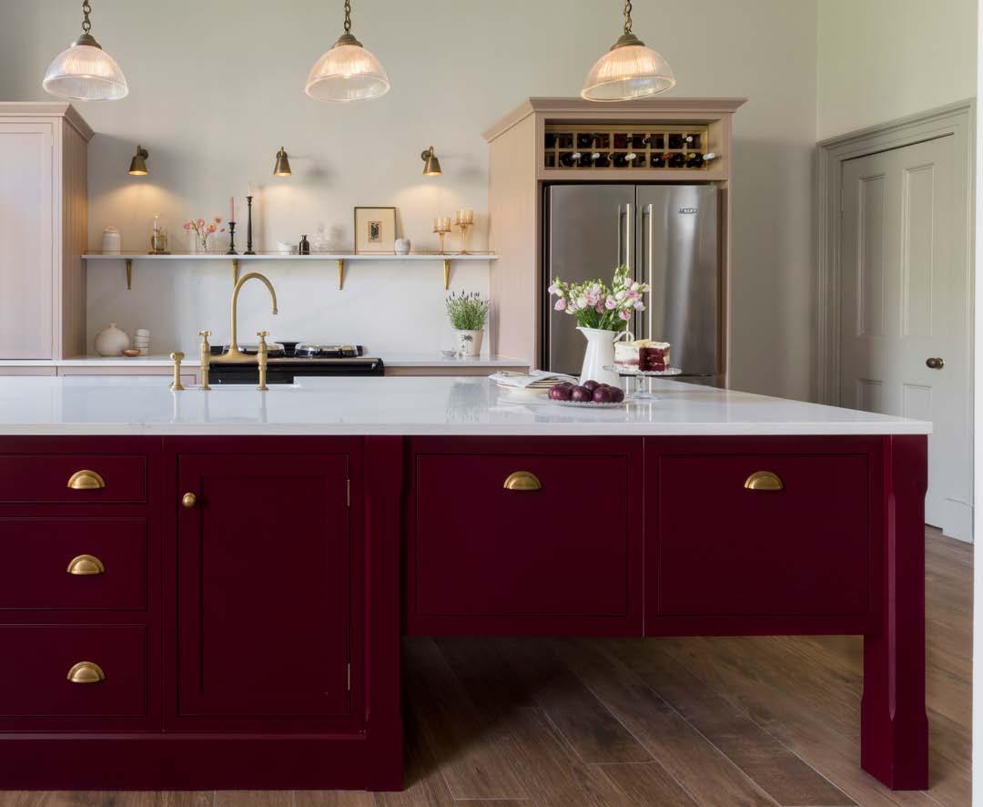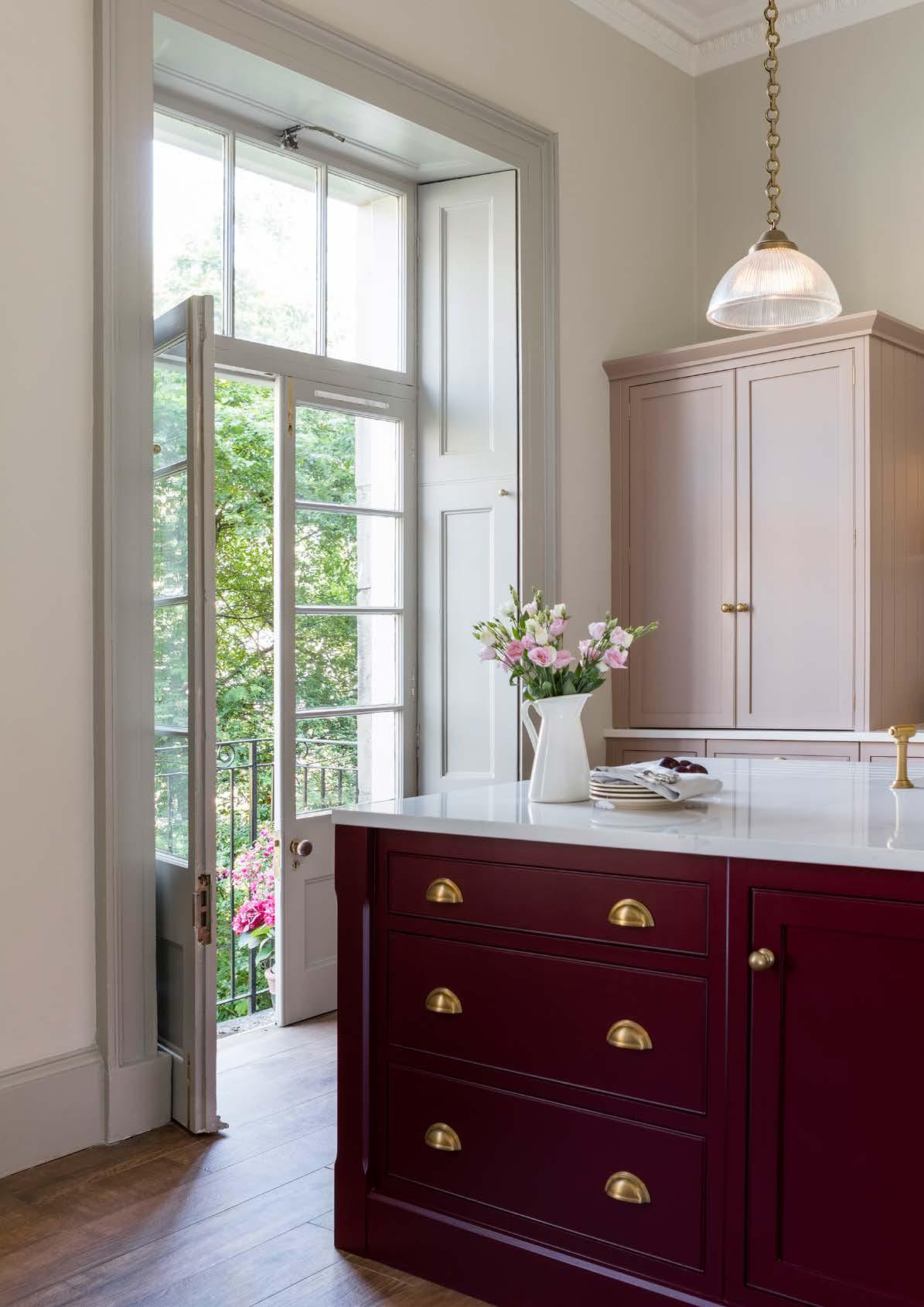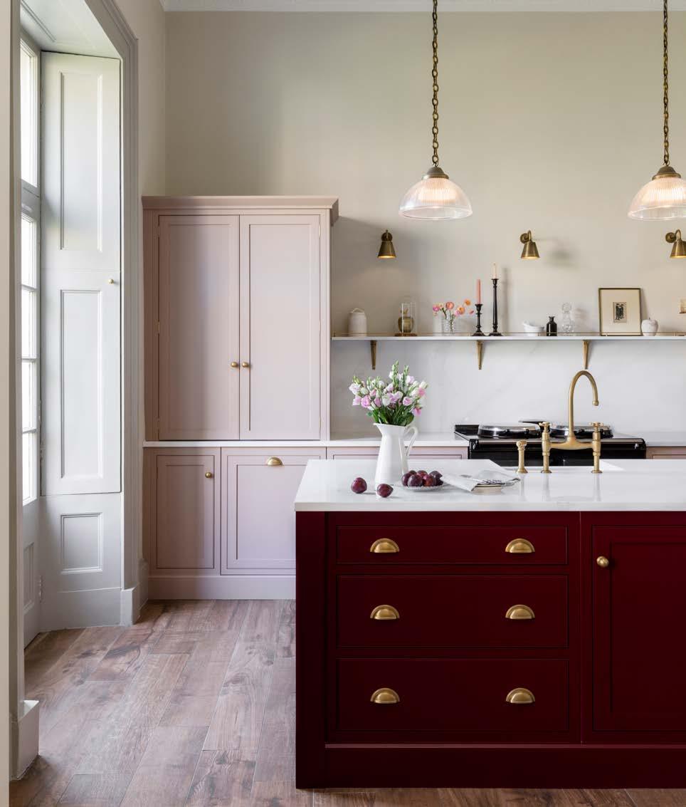 Old-world charm flourishes throughout this kitchen. Hand-painted in Harvey Jones Claret, the kitchen island catches the eye as a statement centrepiece, forming a joyfully confident contrast to the tranquil surrounding colour scheme. Touches of delicate blush pink introduce a delightfully feminine dimension.