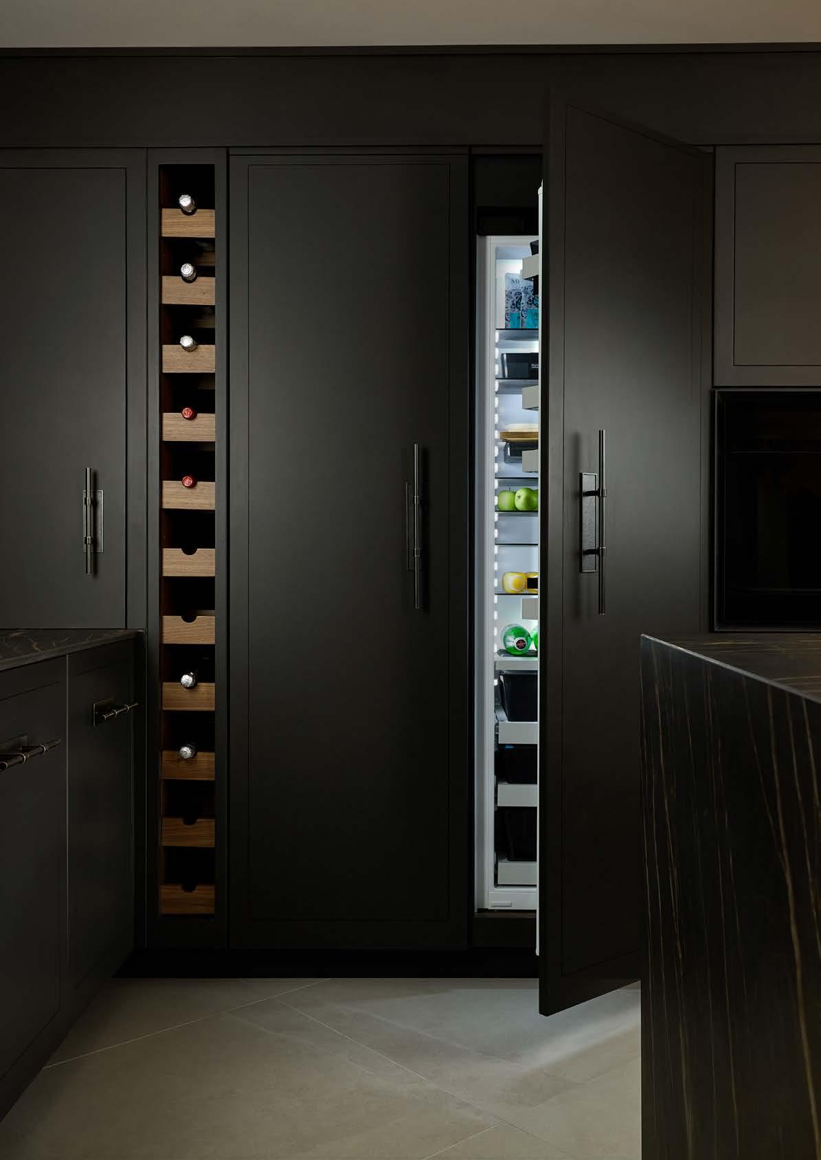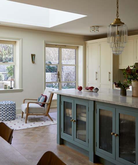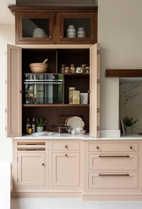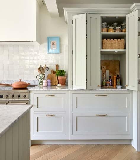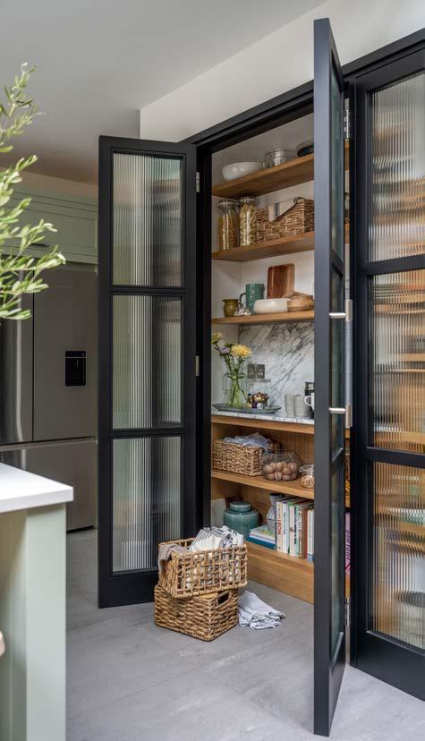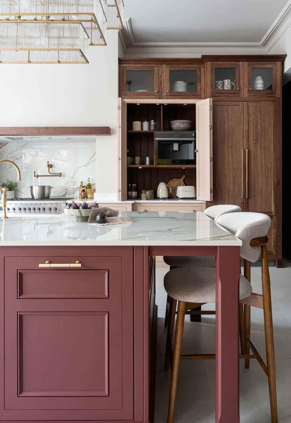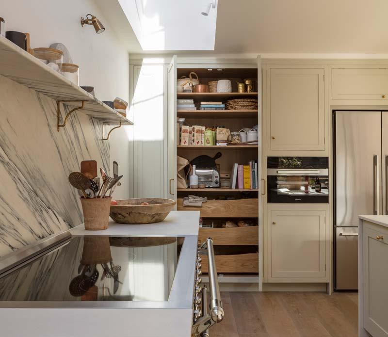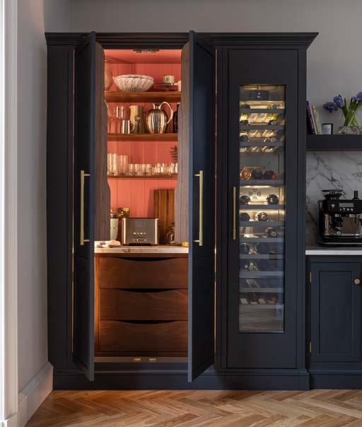 The flow of the finished kitchen lends itself to effortless entertaining. Doubling as an elegant drinks cabinet, the pantry larder is a standout feature, revealing a playful flourish of colour when opened. Meanwhile, appliances are situated on either side of the island, enhancing functionality in line with the aesthetically balanced design.