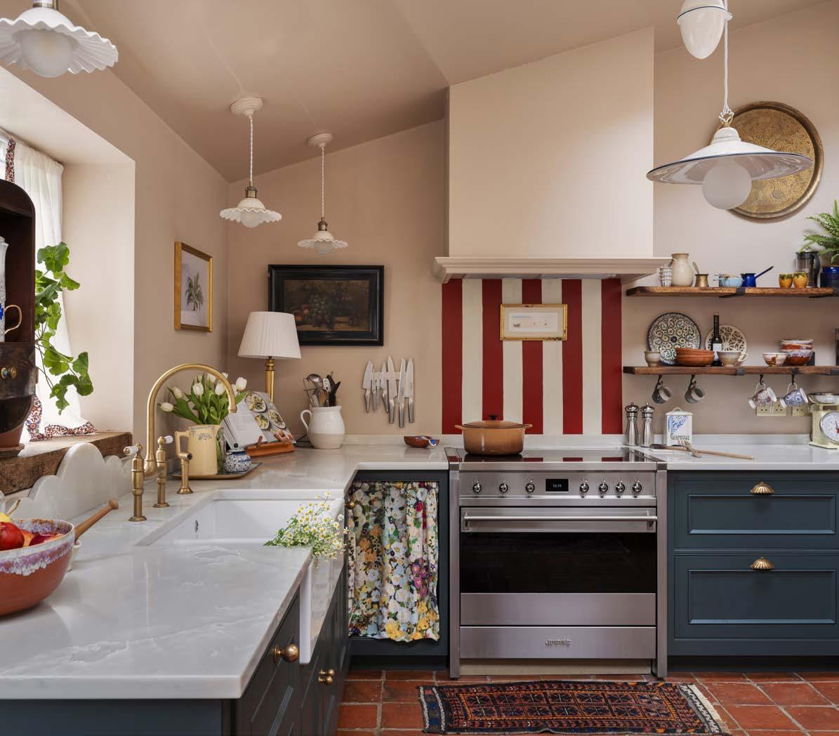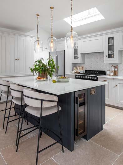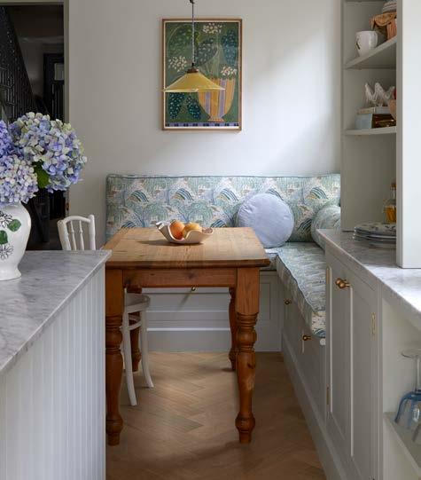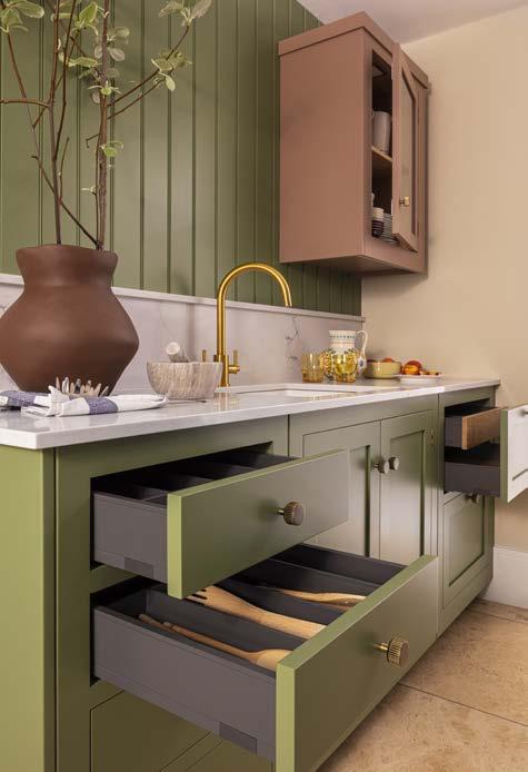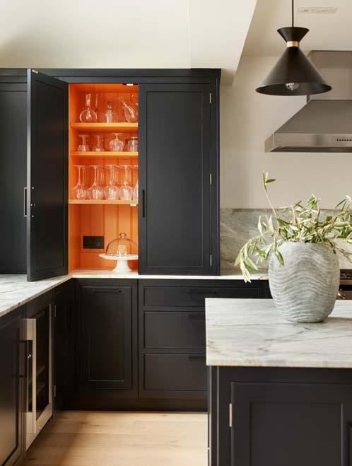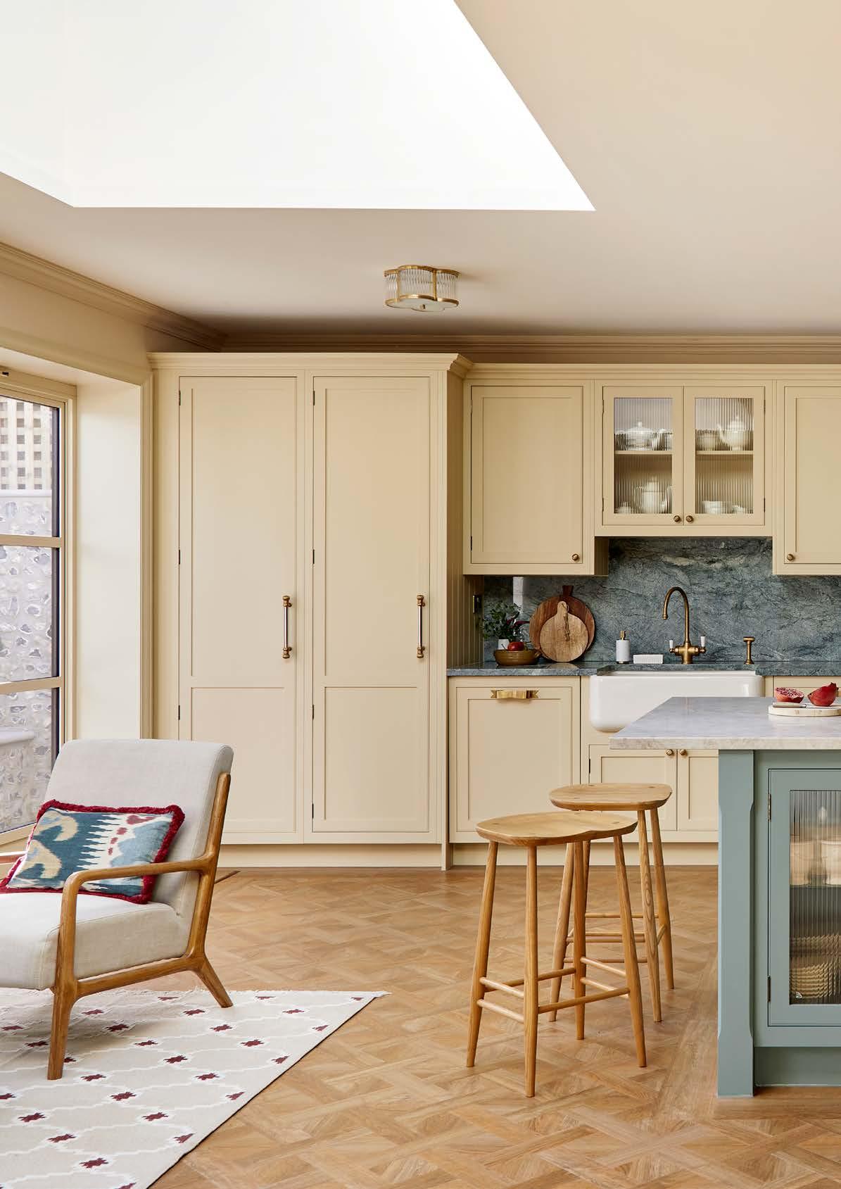 The flow of the finished kitchen lends itself to effortless entertaining. Doubling as an elegant drinks cabinet, the pantry larder is a standout feature, revealing a playful flourish of colour when opened. Meanwhile, appliances are situated on either side of the island, enhancing functionality in line with the aesthetically balanced design.