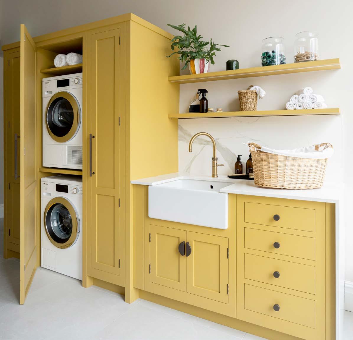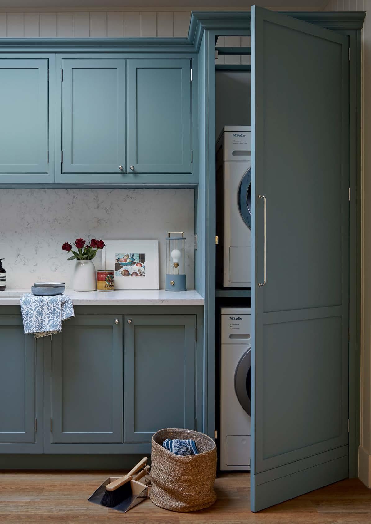 Choose from bespoke cabinetry options like housekeeping larders, open dressers, and hidden bins. Stack appliances to save space, add a sink for handwashing, and include worktops for folding. With dedicated storage for laundry essentials, your utility room becomes a calm, practical extension of your kitchen.