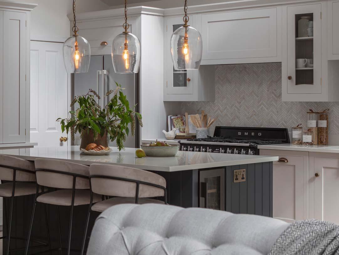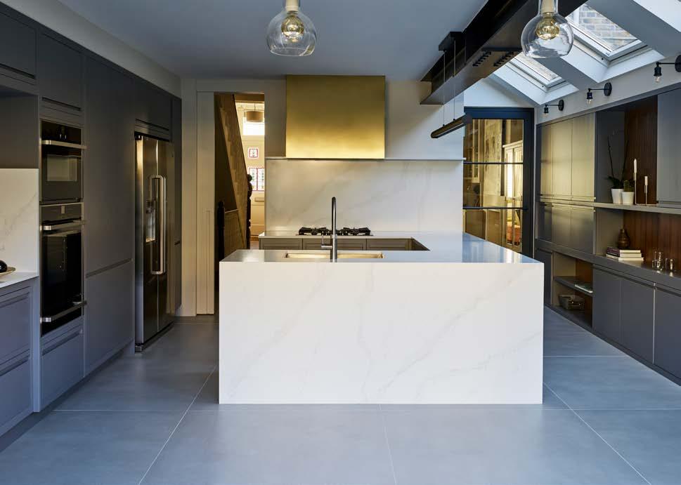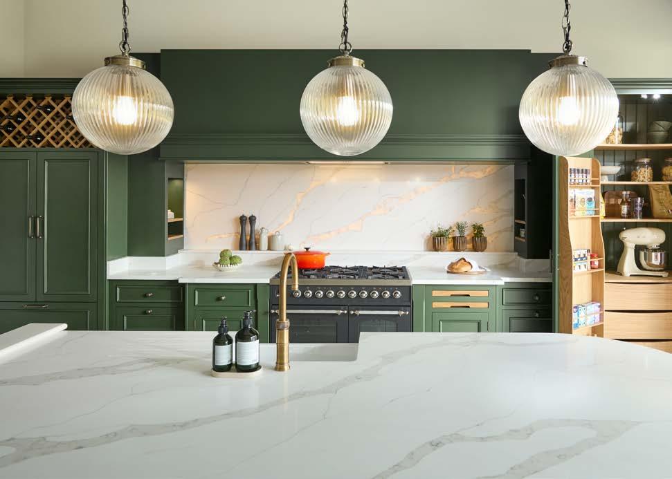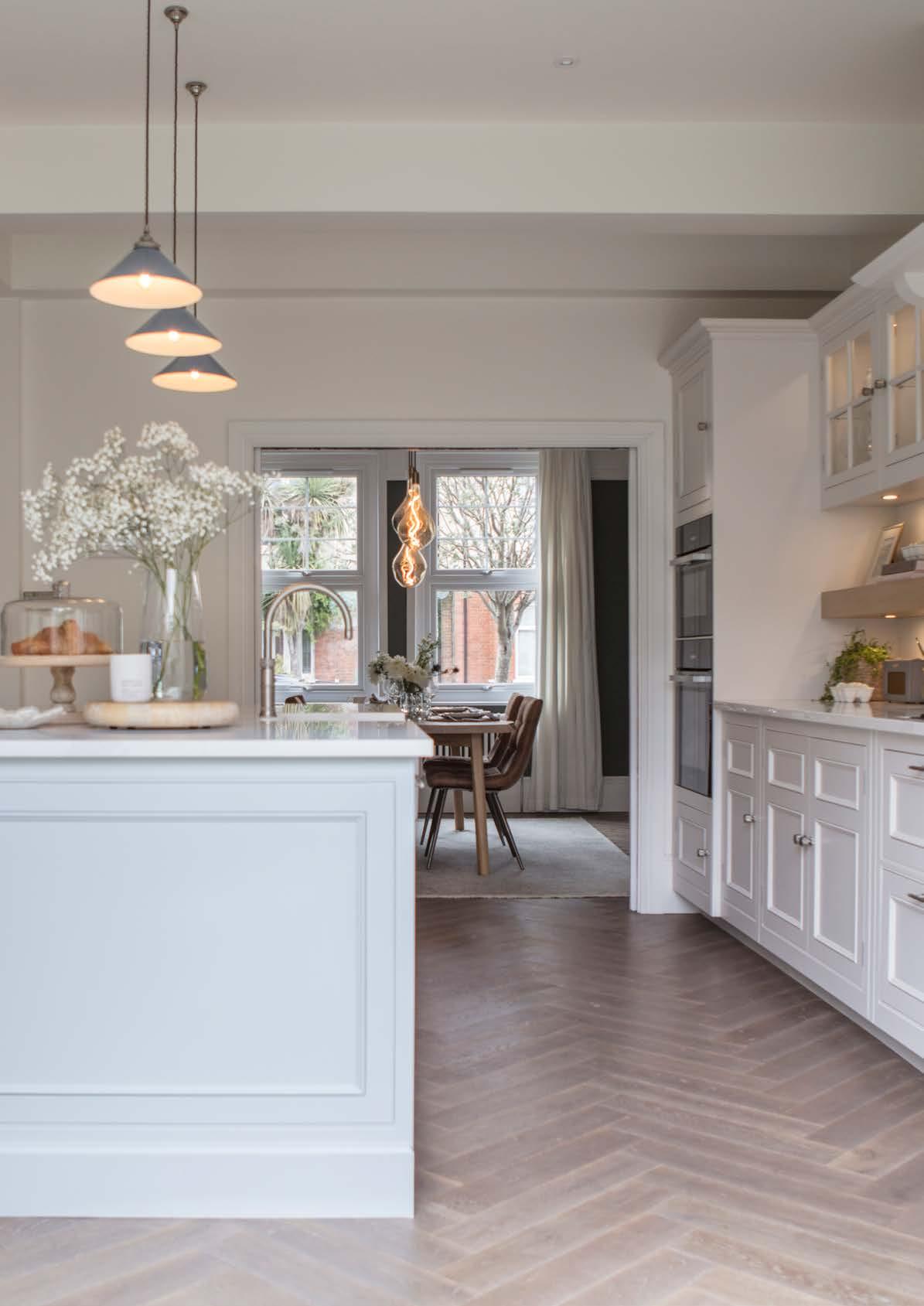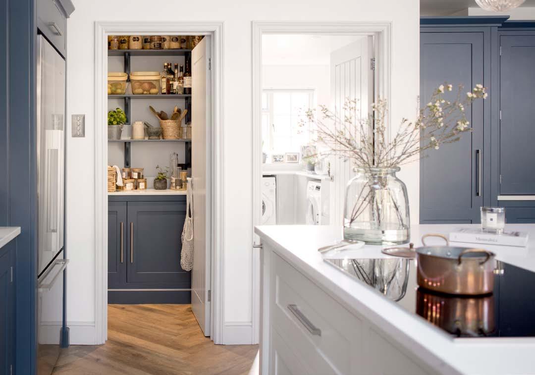 Our clients chose a polished White Attica quartz worktop, which enhances the kitchen’s bright feel by bouncing light around the room while adding a luxe sparkle. The clients also chose to implement a bespoke pantry larder to enjoy even more storage options.