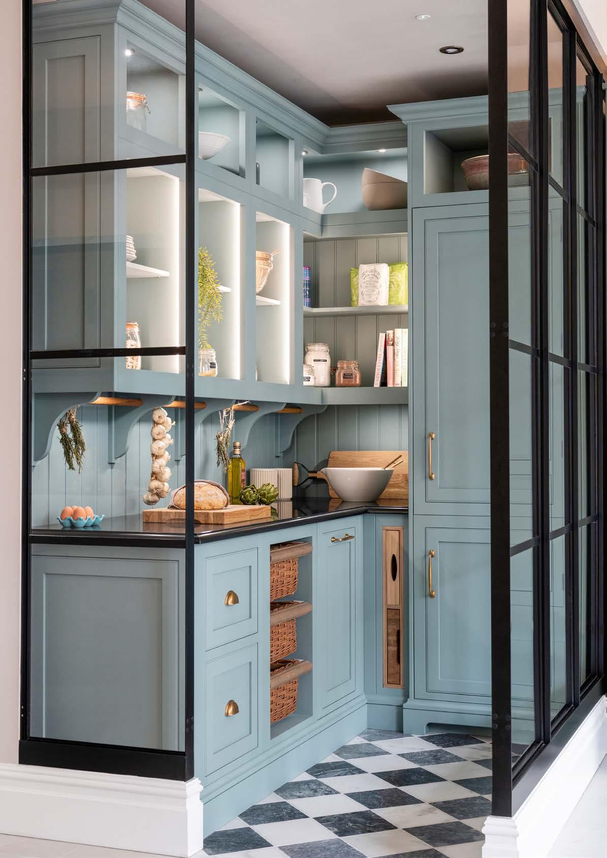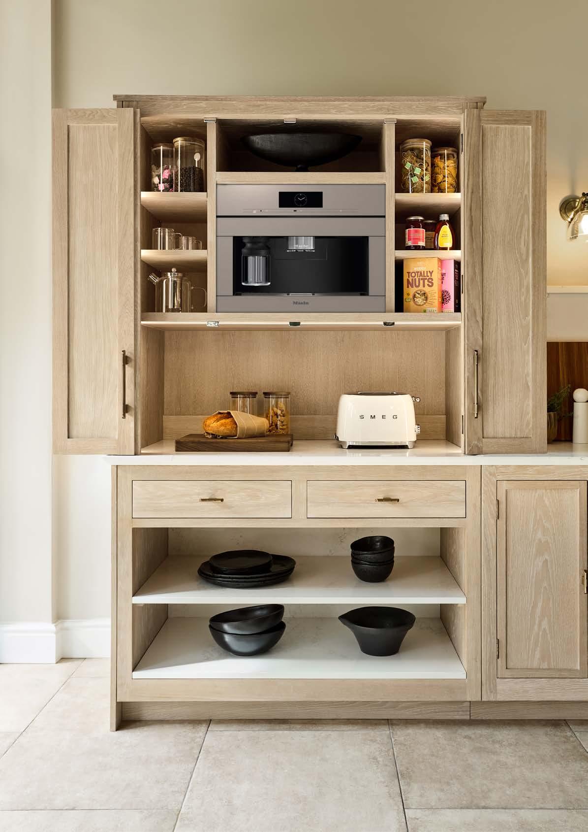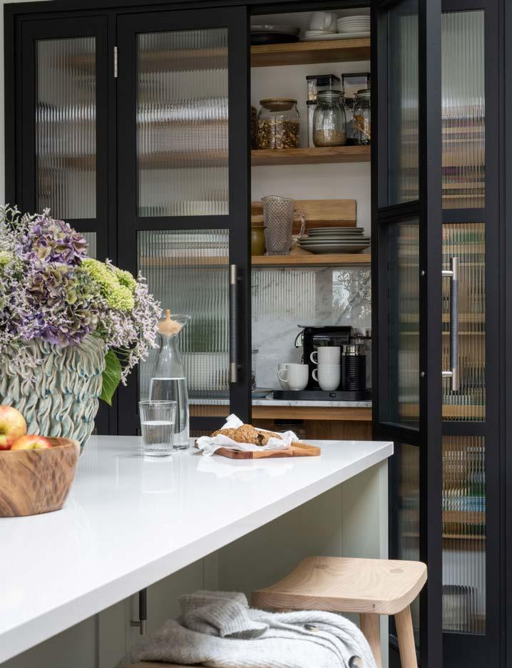 Maximise the space by ensuring that everything the pantry stores is in easy reach, whether that’s ingredients or crockery. Consider open shelves installed at useful heights, or dedicated cabinetry units with hidden plugs for countertop appliances.