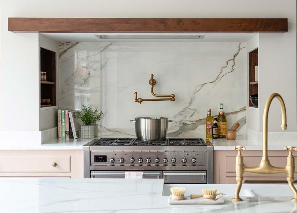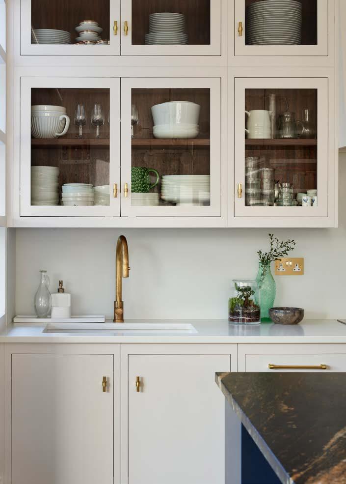 Bespoke design details abound, harmonising mixed materials, colours and textures. Shimmering with delicate metallic veining, Aurora Calacatta Gold worktops introduce a contemporary edge, balanced with the timeless detailing of antique brass handles and taps. Elsewhere, a bespoke larder with space for appliances and artfully arranged pantry essentials elevates the design’s functionality.