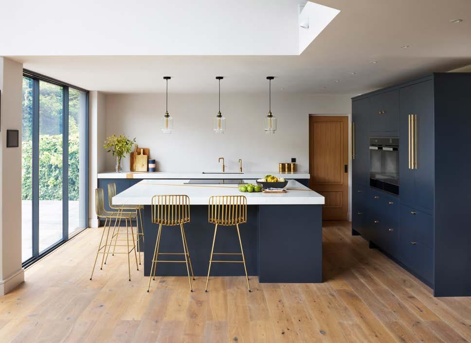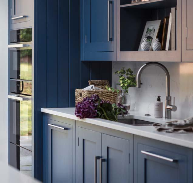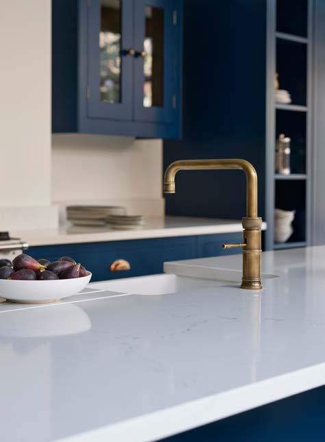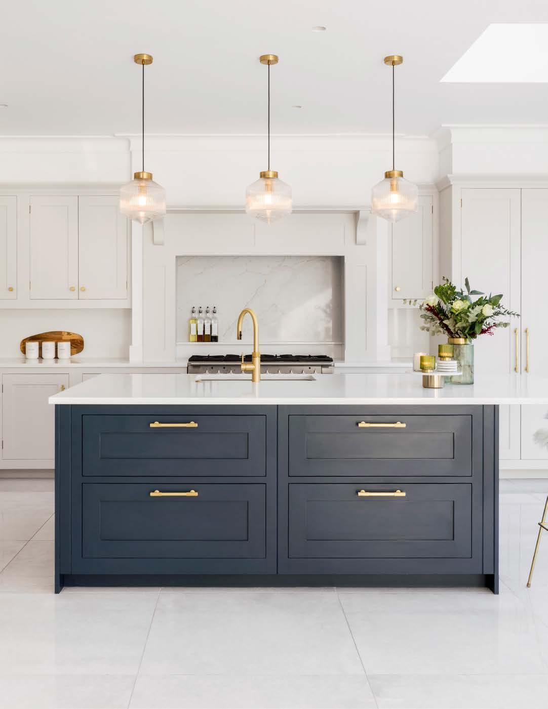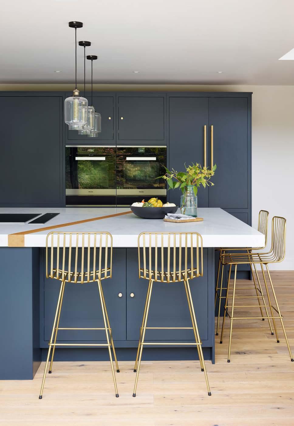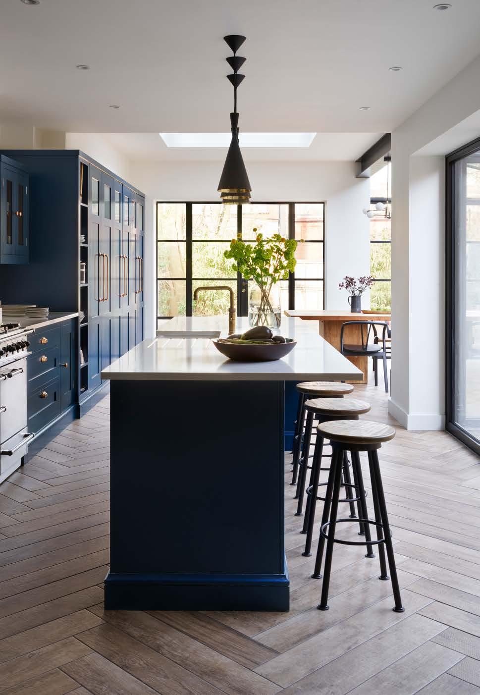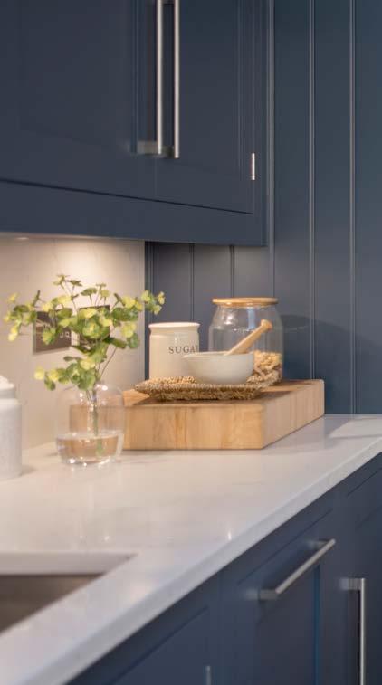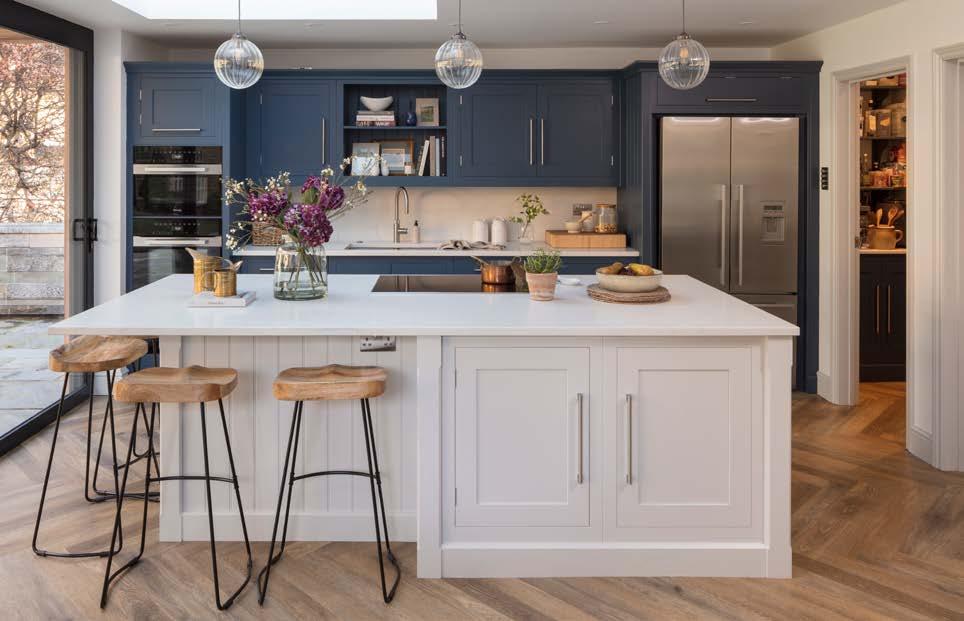 Hand-painted cabinetry in soothing Indigo, curated with a contrasting island in the lighter shade of hearthstone. This aesthetic equilibrium is emphasised by the incorporation of bright stone surfaces, which reflect light against the dark blue tones whilst adding a dimension of tactile depth.