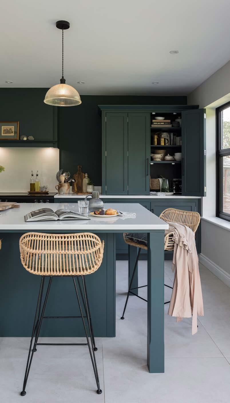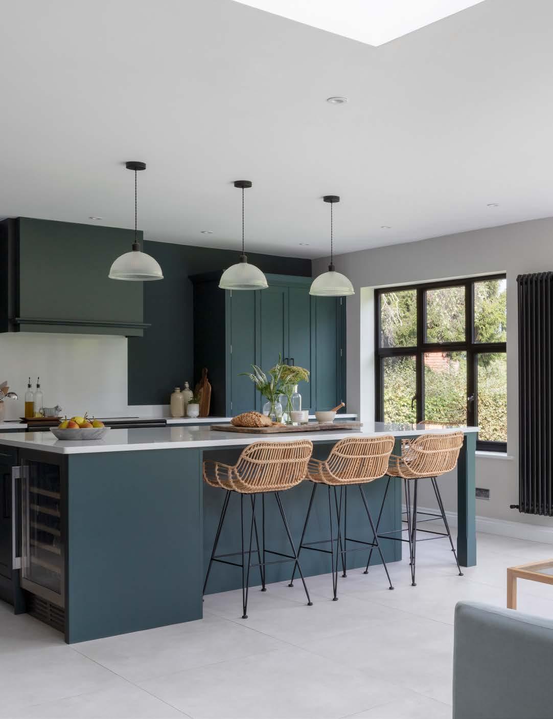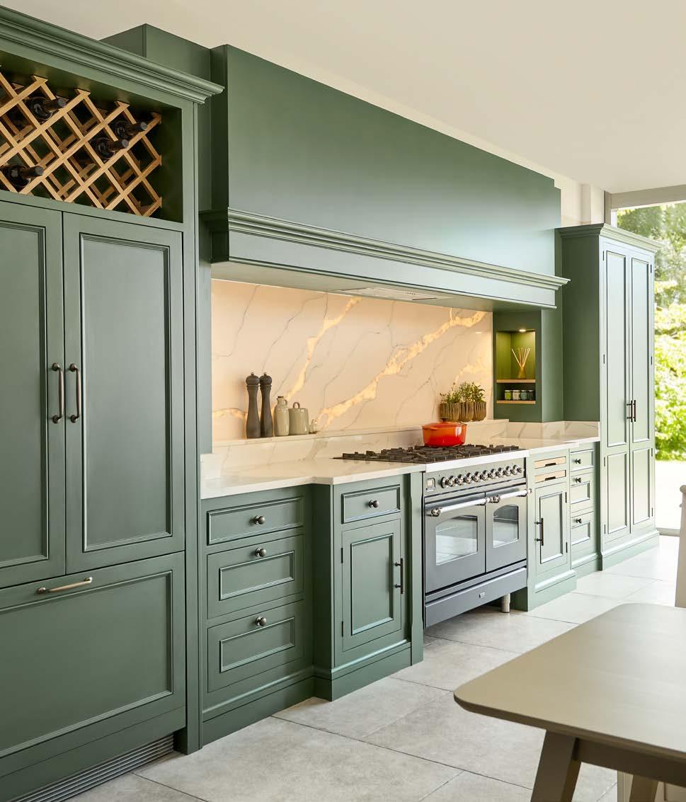 This bespoke Shaker is hand-painted in Harvey Jones Racing Green, echoing the foliage of the lush garden beyond, effectively bringing the outside in. The result is a kitchen that is bold yet timeless, luxurious yet grounded. The chosen colour adds character without overwhelming the space, complemented by natural materials and plenty of daylight.
