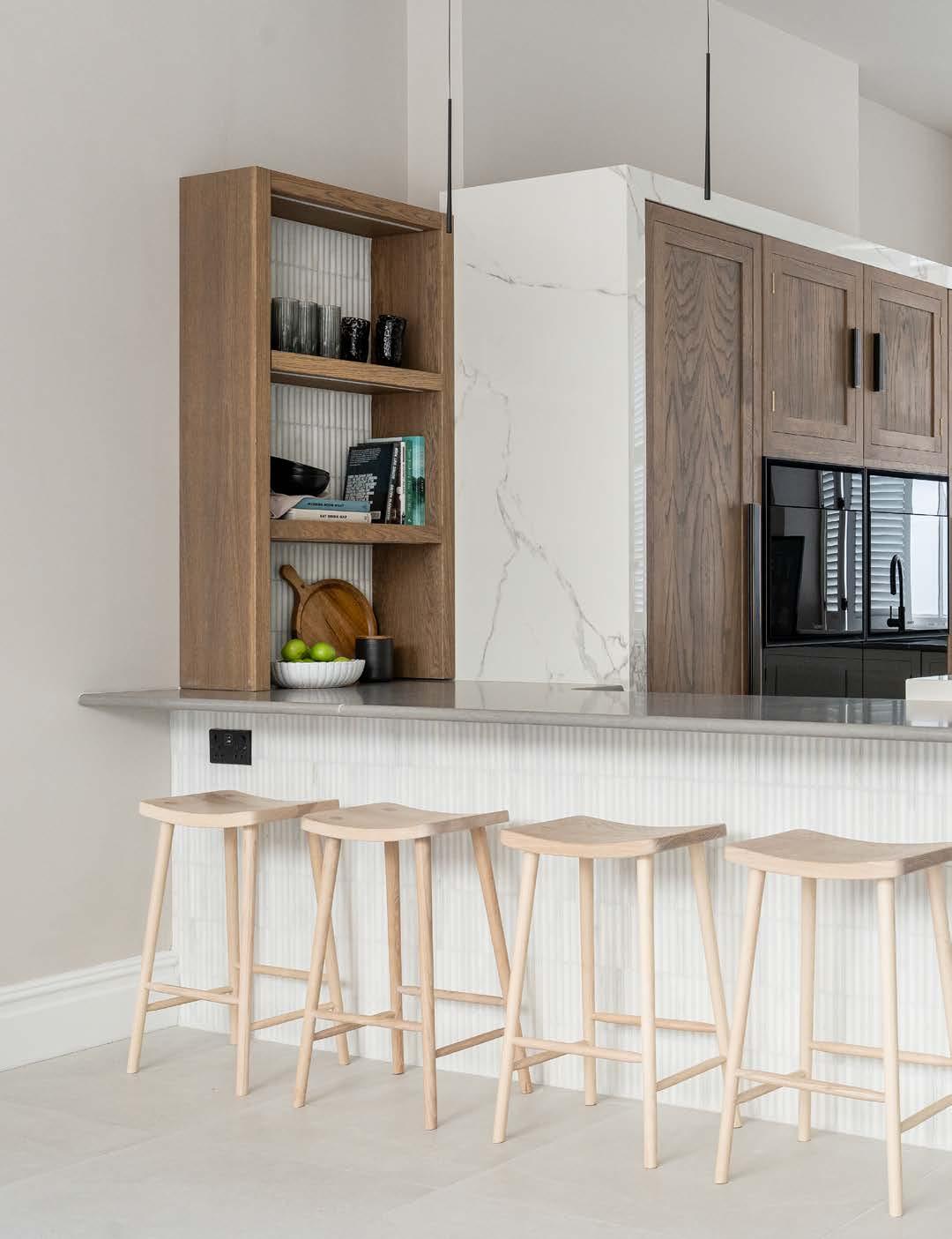 Thoughtful zoning ensures the space works as beautifully as it looks. Stacked Fisher and Paykel appliances create a clean, vertical rhythm, while the hot and wet areas are subtly divided to streamline cooking and preparation. The multi-layered island anchors the design, a sociable centrepiece for morning coffee or evening conversationbridging functionality with relaxed elegance.