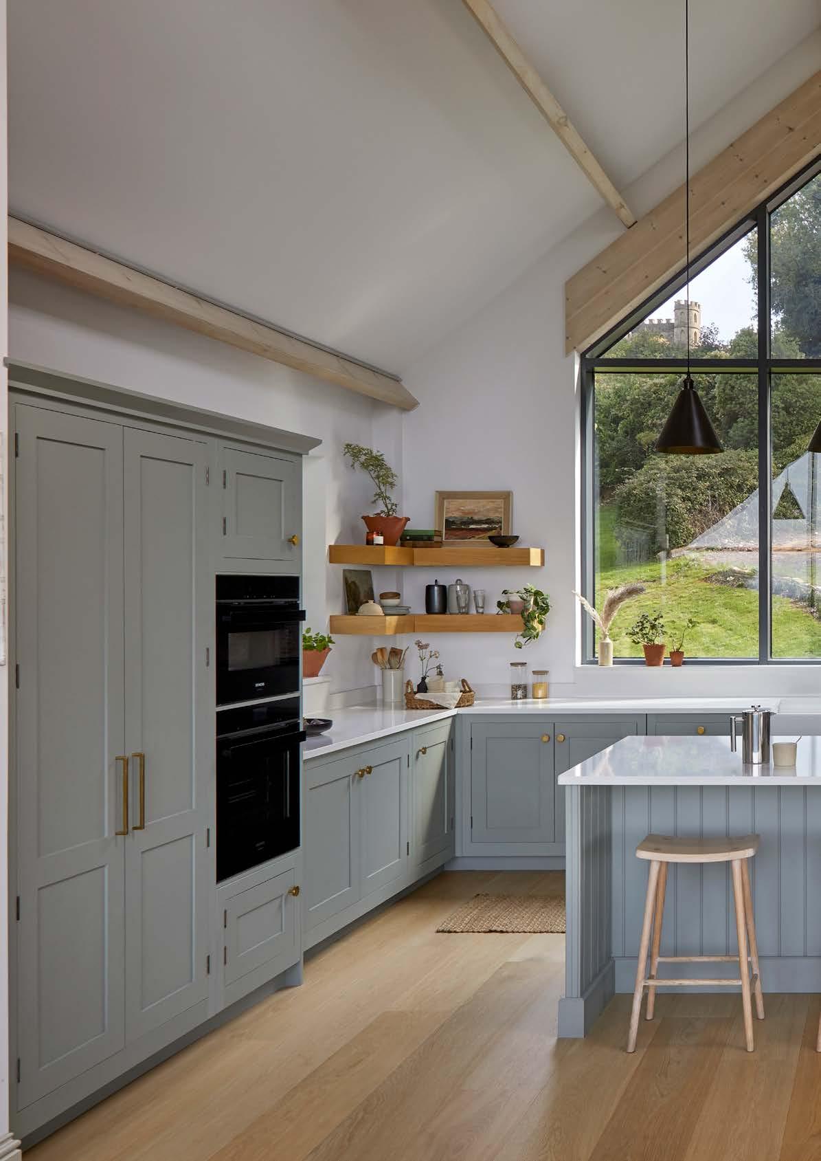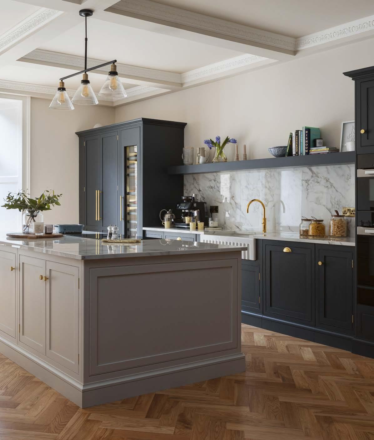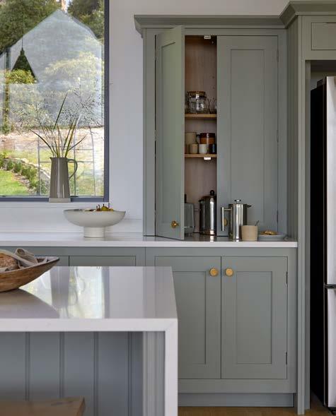Hand-painted in our elegant Earl Grey, the Shaker cabinetry brings softness and balance to this striking open-plan space. Stone worktops and aged gold handles add subtle richness, while the waterfall island anchors the room with a sculptural focal point. Minimal tall cabinetry ensures light flows freely, drawing the eye outward to uninterrupted views and inward to carefully layered design details.