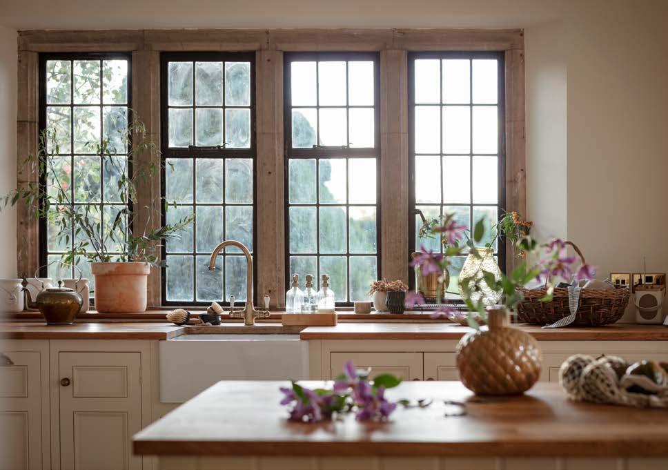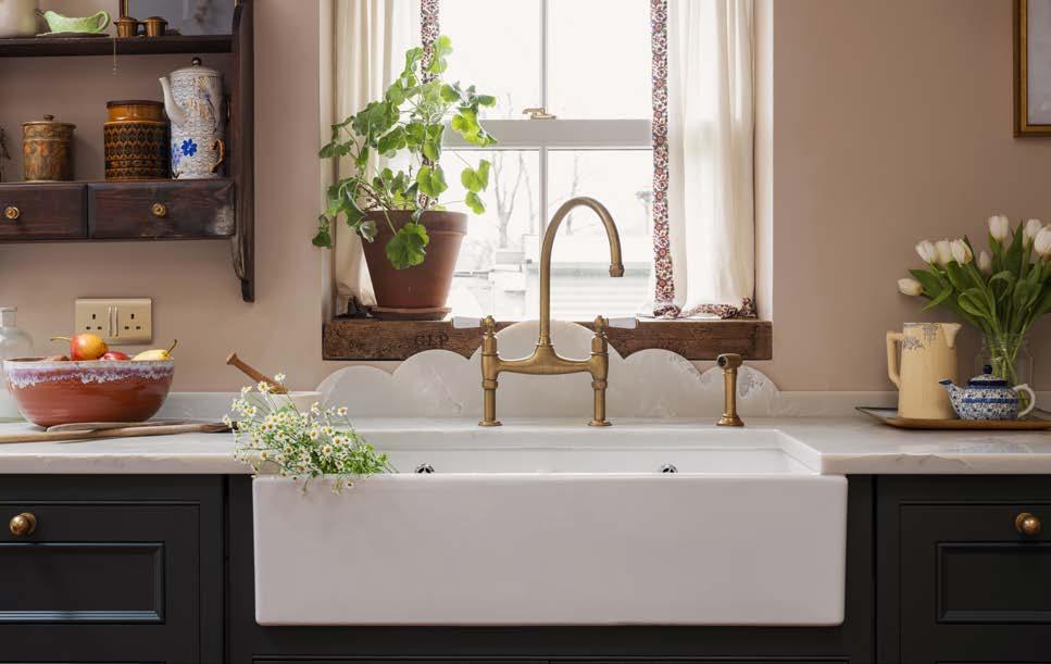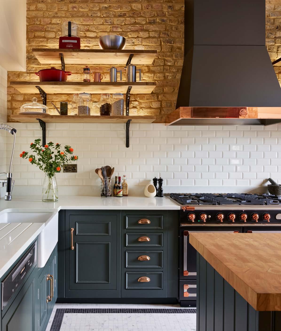 Authentic materials express the homeowner’s distinctive style. Each surface was thoughtfully selected to create a space that feels welcoming and lived-in, from linseed-oiled terracotta tiles to the hand-painted wood cabinetry. Artfully fusing with the surrounding Victorian architecture, these personal touches create the impression that the kitchen has always formed part of the building. Another standout feature is the original lintel beam, which has been repurposed into a windowsill behind the sink.