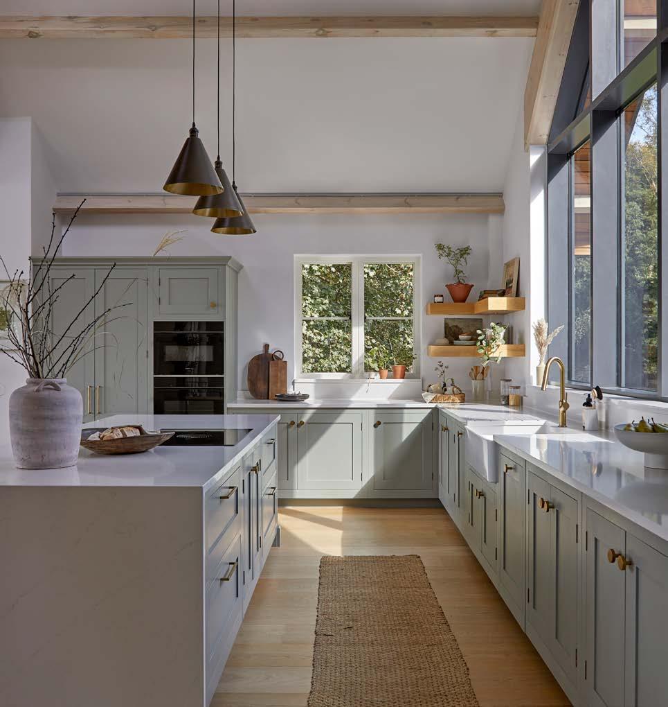 This Hampton kitchen pairs a soft sage green finish with warm natural textures, offering a serene yet distinctive backdrop to daily life. Open shelving introduces a relaxed, styled look, while vintage-inspired hardware and subtle brass details bring warmth and personality to the space.
