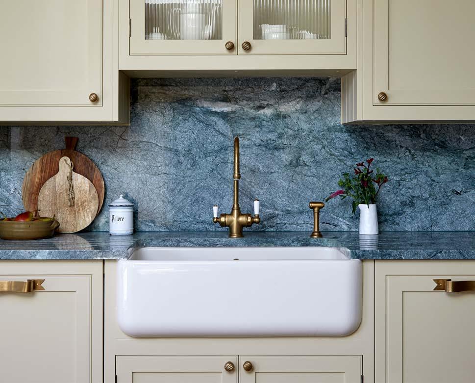 Our clients chose a beautiful marble splashback to set off the space. Alongside its luxurious tactility, the green and grey tones create an aesthetically pleasing contrast with the neutral-hued cabinetry. Meanwhile, the classic butler sink – complete with elegant brass taps – harmonises with our hand-crafted furniture.
