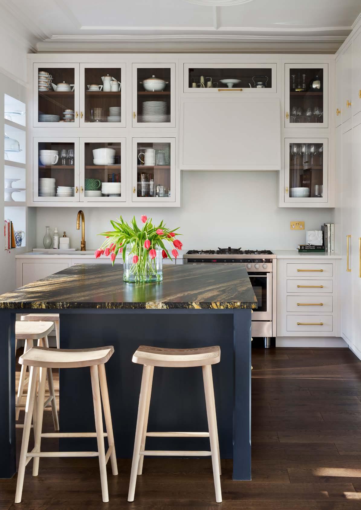 Ornate architectural features elevate an open-plan layout, where light pours in from the charming courtyard space beyond. Subtle contrasts in tone and texture make for an undeniably refined allure, juxtaposing darkly distinguished cabinetry painted in Raven with a lighter-hued island.