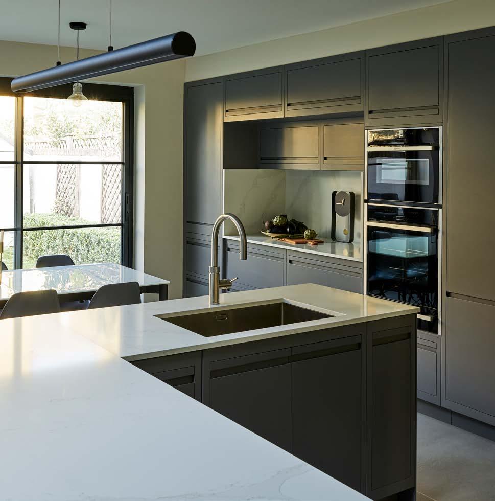 The homeowners chose minimalist bar handles to heighten their serene, pared-back aesthetic. Little details make daily rituals as easy as possible, such as a Quooker tap offering instant hot water for morning cups of tea.