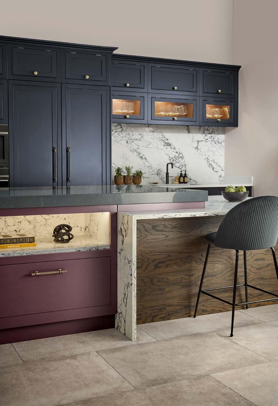 This sophisticated Arbor and Linear kitchen celebrates contrast through confident use of colour and material. Deep indigo cabinetry is paired with Mulberry undertones, veined marble and warm oak to create a layered aesthetic that feels both modern and enduring.