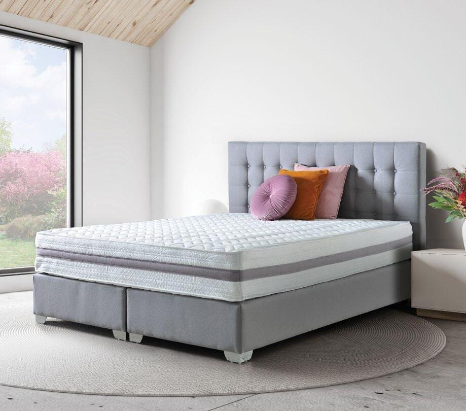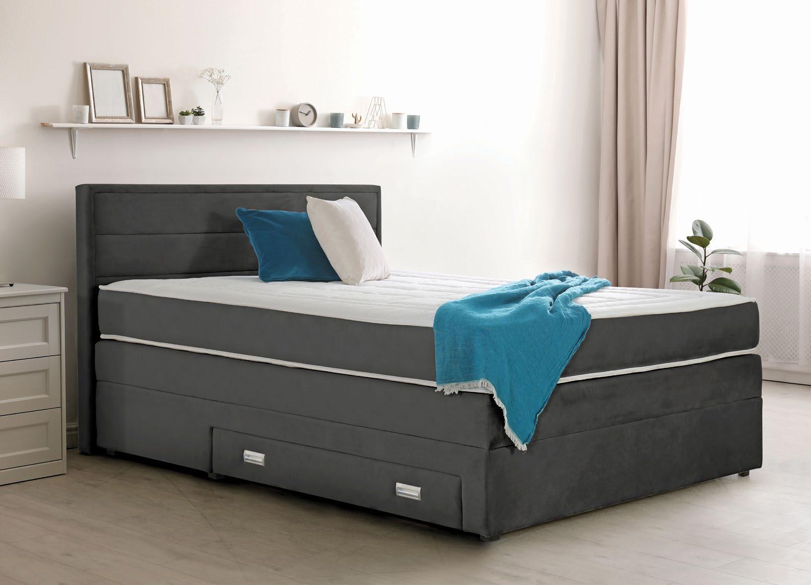 Boxspring postelja LIBRA, 160x200cm celotna postelja z vzmetnico, BONEL vzmetenje, 2x predal, blago siva
