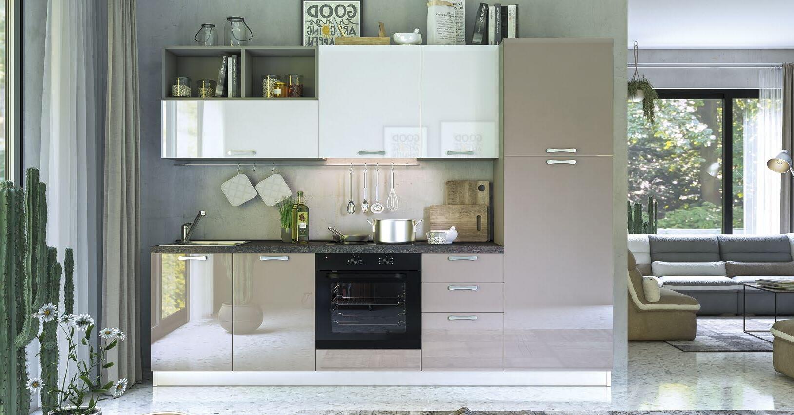 Celotna kuhinja YORK, 255x216x60cm, leva ali desna postavitev, z aparati, z ročaji, bela visok sijaj /taupe visok sijaj, taupe visok sijaj/bela visok sijaj,