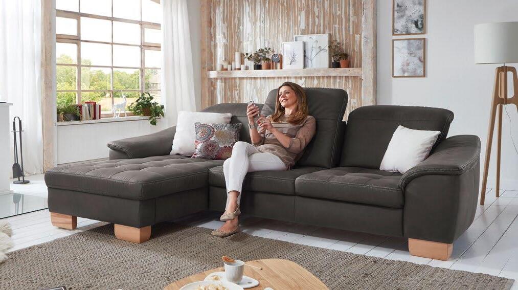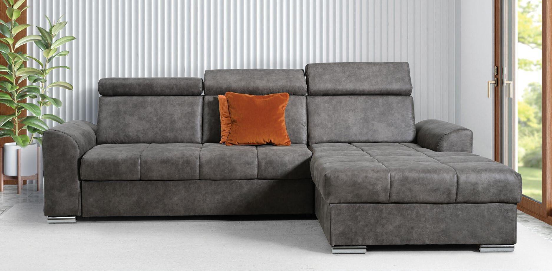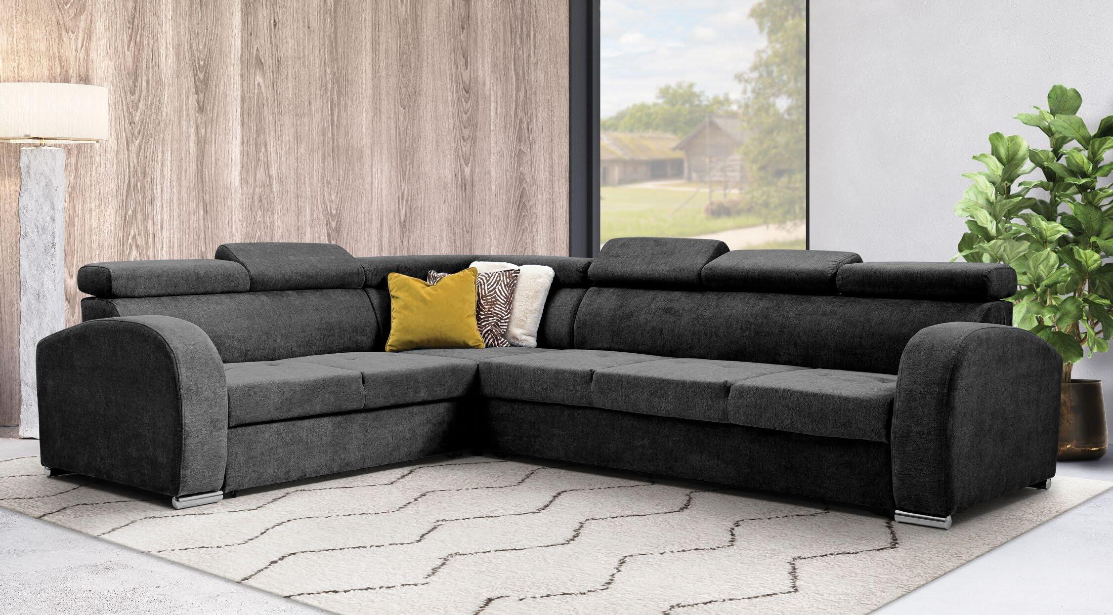 garnitura FARREL, 302x210cm, leva ali desna postavitev, ele. pomično sedišče, 4x nastavljiv vzglavnik, blago temno siva ali