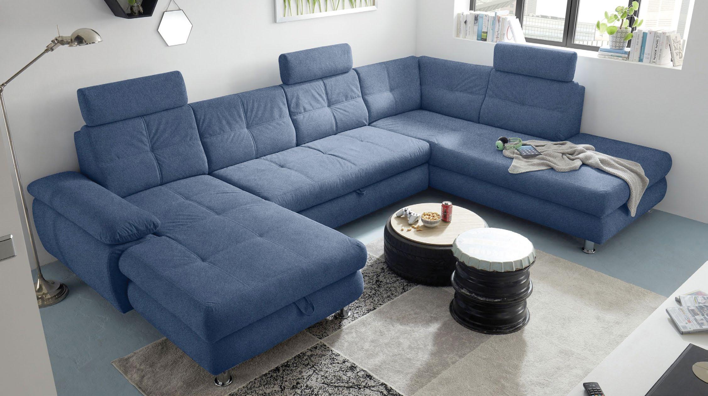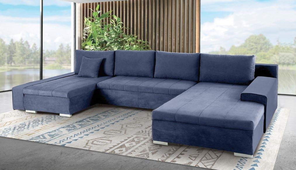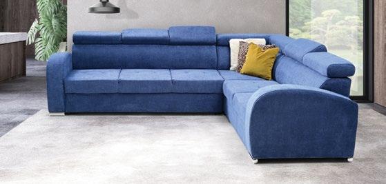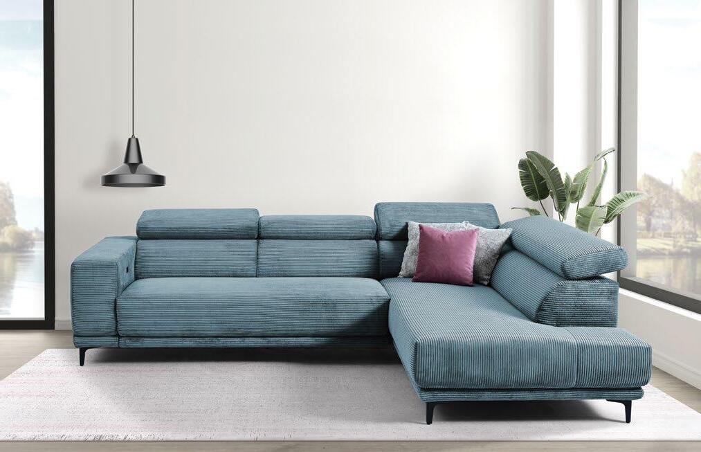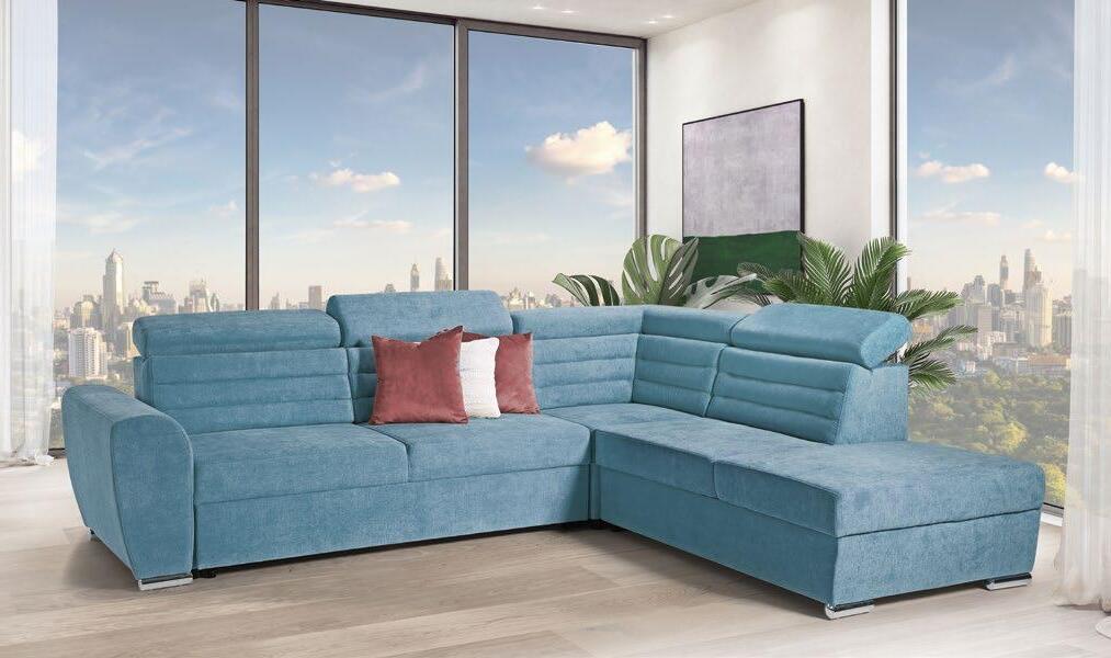 Kotna sedežna MELANI, vzmeteno 296x180cm, leva ali desna postavitev, ležišče, predal, 3x nastavljiv vzglavnik, blago antracit ali modra