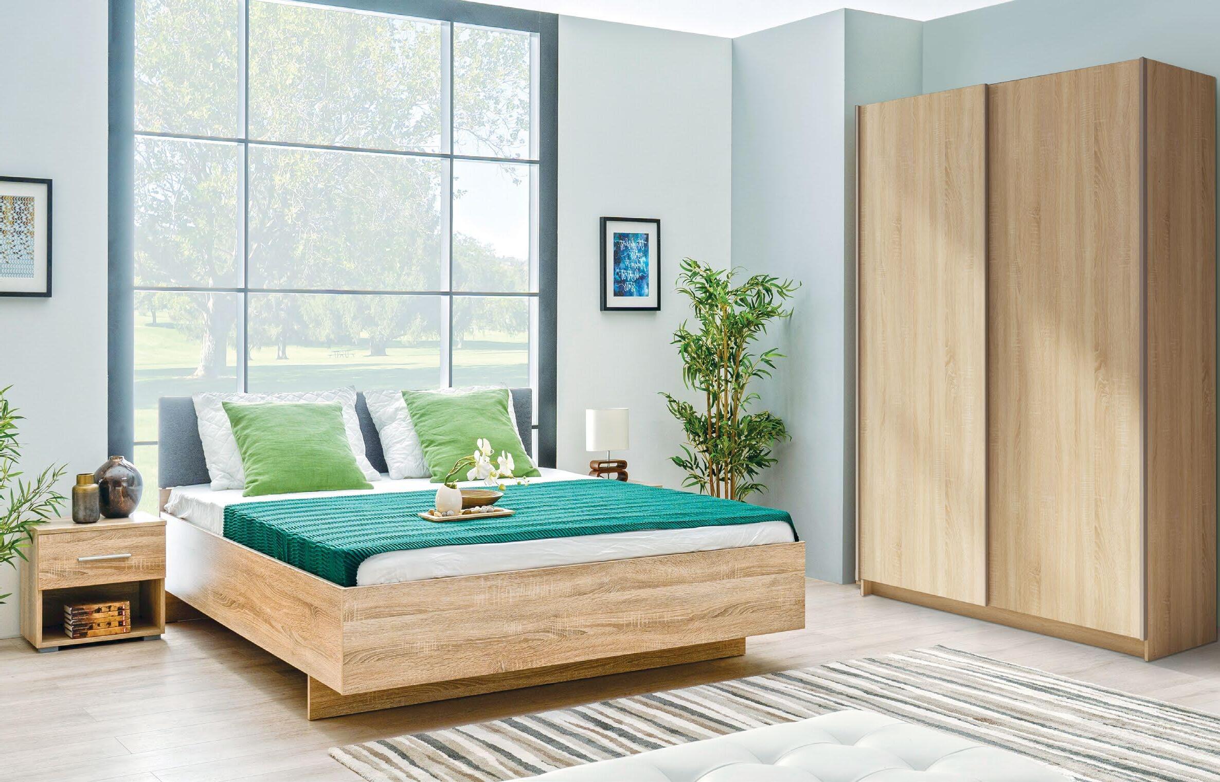 €699 Celotna spalnica GOZO posteljni okvir RITMO 160x200cm, 2x nočna omarica RITMO 45x43x34cm, garderobna omara GOZO 180x198x60cm, sonoma hrast €349 €499