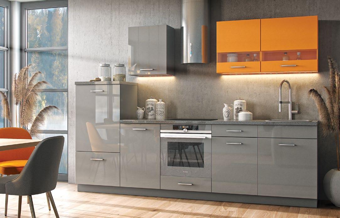 €899 Blok kuhinja BERLIN, širina 280cm leseni del, MDF, siva visok sijaj ali bela visok sijaj