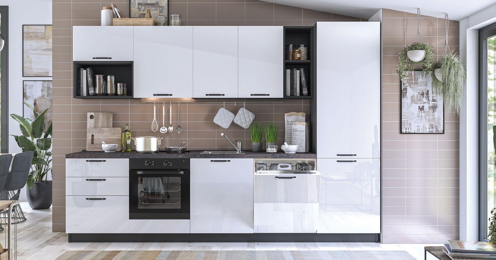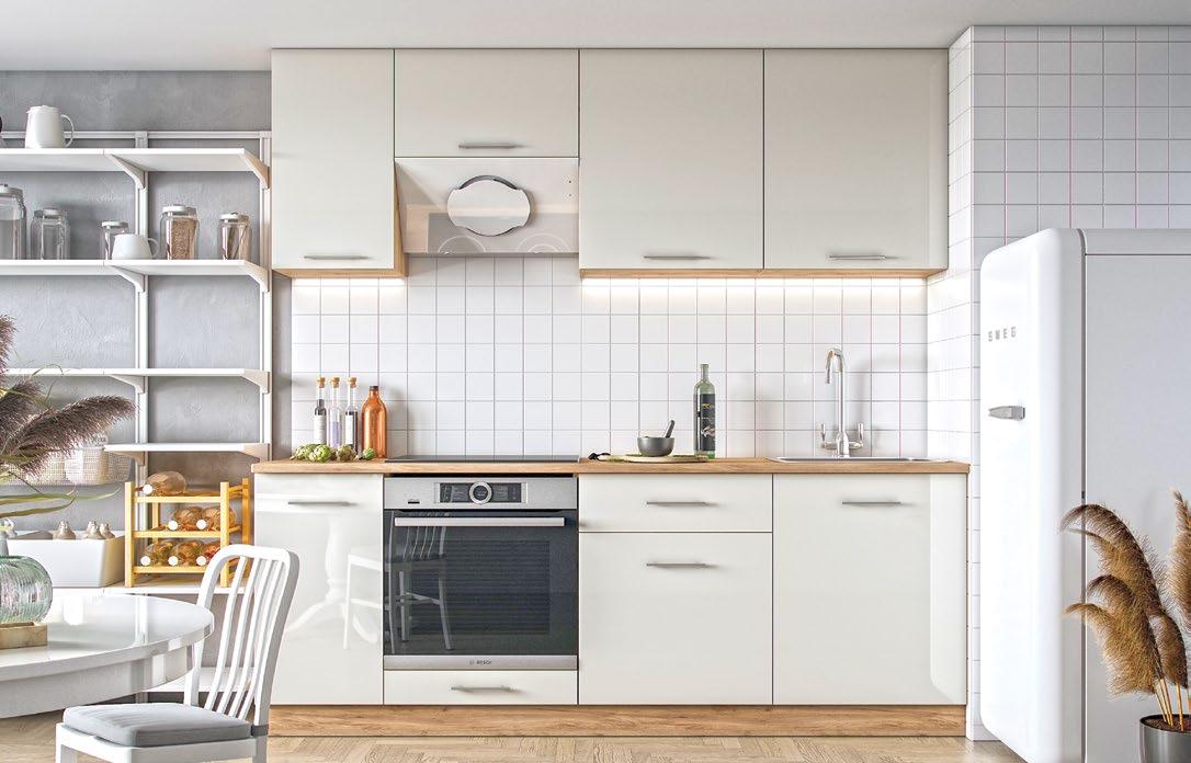 €1.199 Blok kuhinja LAGUNA, širina 330cm leseni del, MDF, bela ali jasmin, visok sijaj