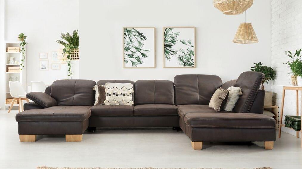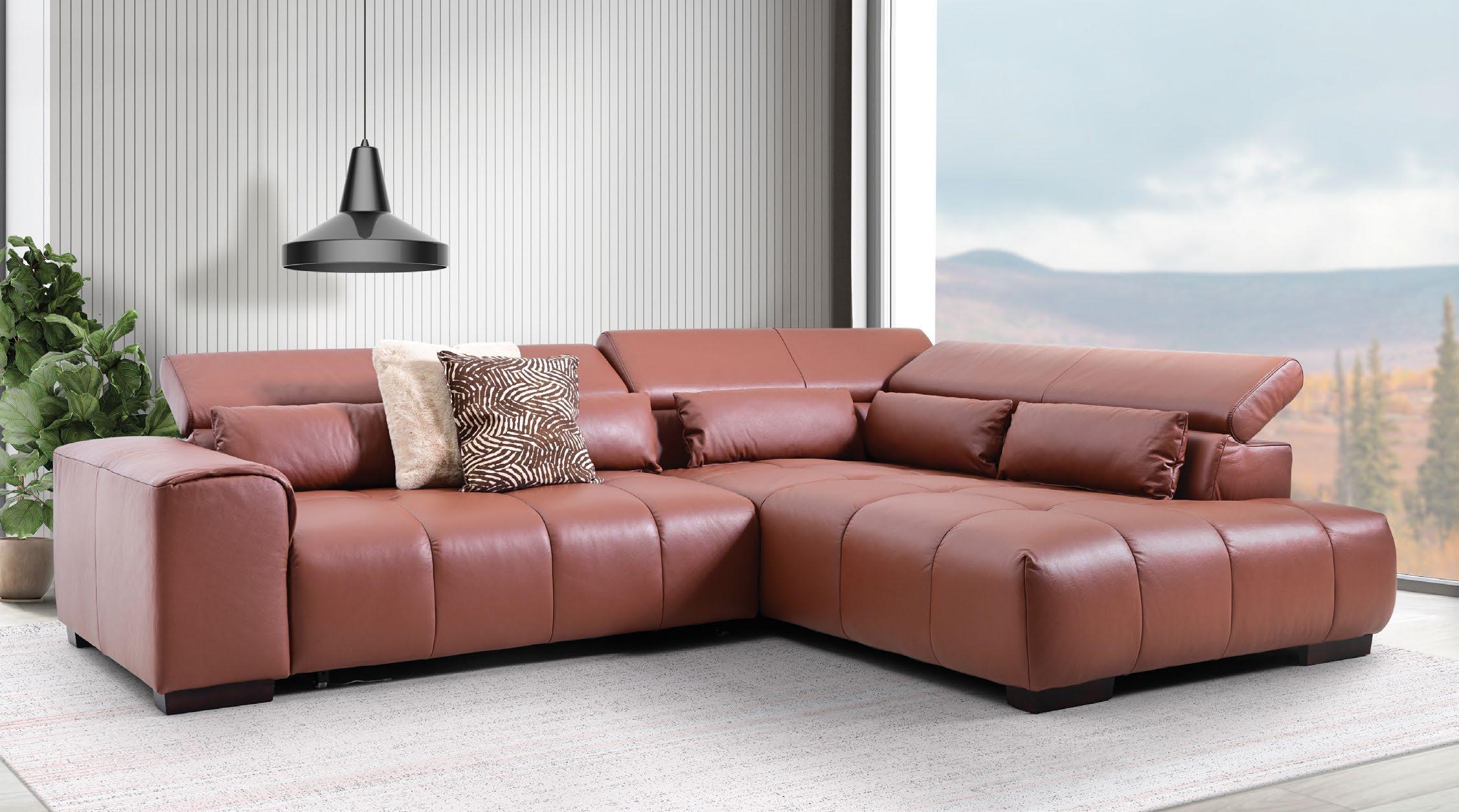 Usnjena kotna sedežna POSITANO, vzmeteno, 309x230cm, leva ali desna postavitev, ležišče, 3x nastavljiv vzglavnik, 5x ledvena blazina, usnje/um.usnje MIX