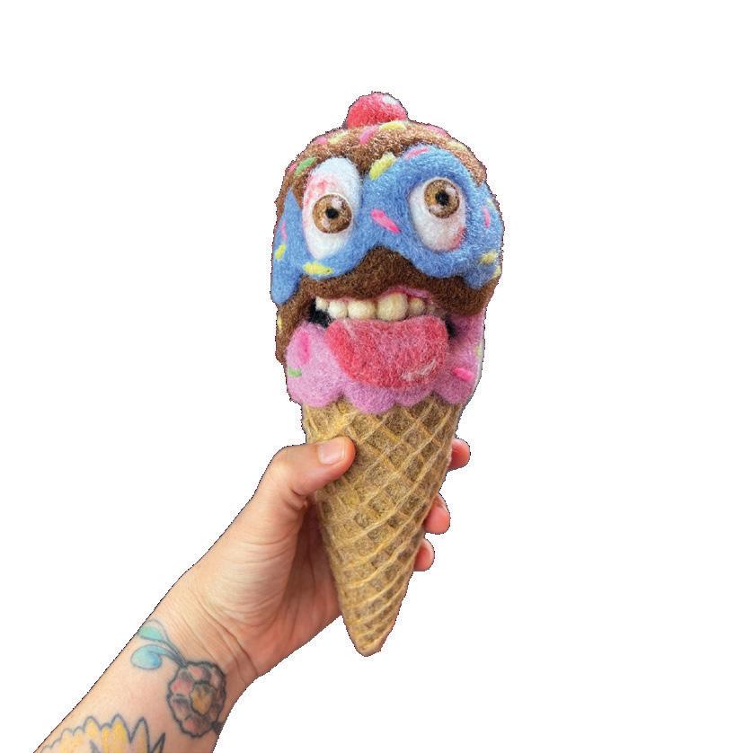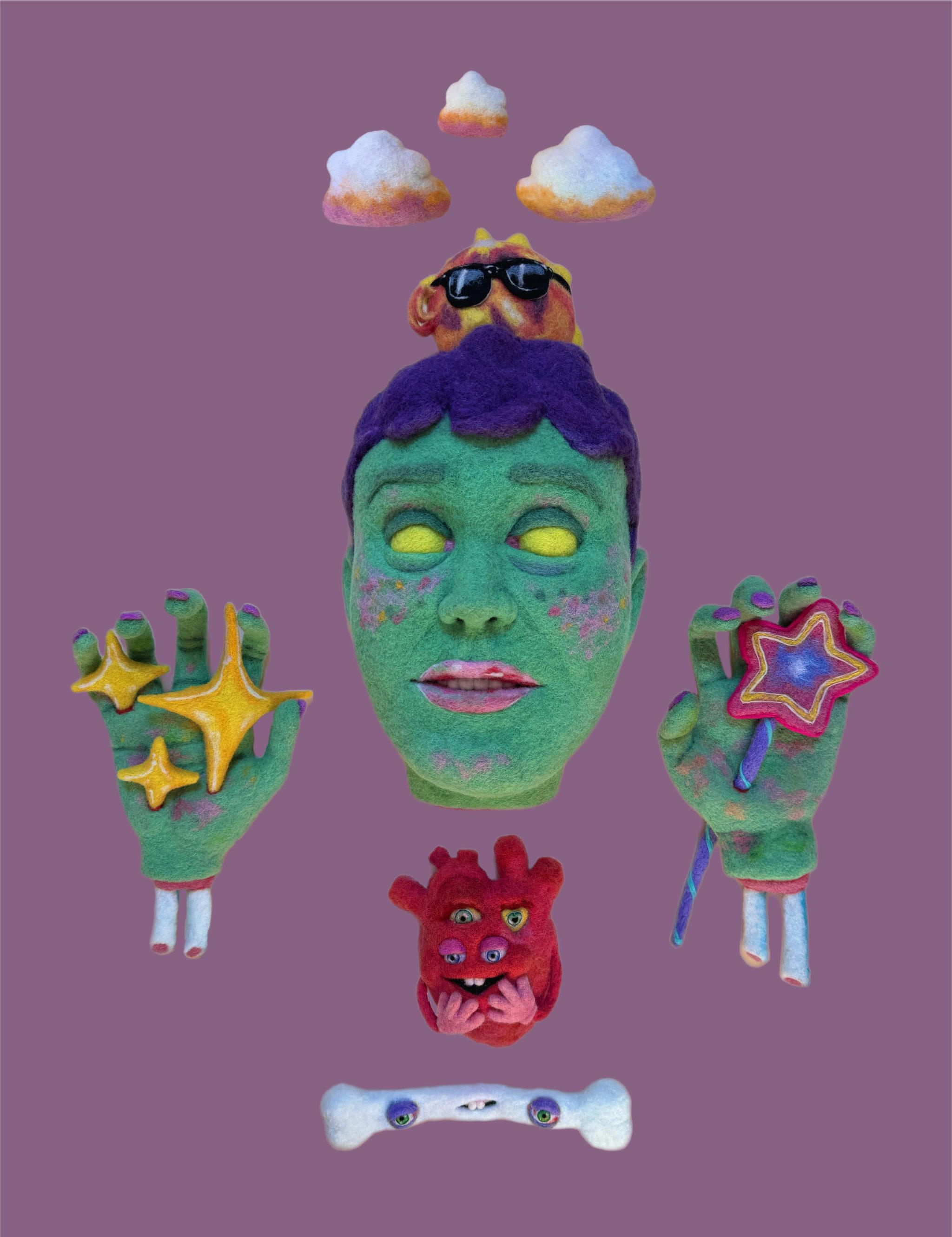 Audrey Montoya is a Albuquerque based artist who has been making needle felted monstrosities for the past several years. These monsters are created in reaction to the current state of everything; that bad haircut she had in the 8th grade; and the way lucky charms are slimy and crunchy at the same time. These soft sculptures take the form of anthropomorphic clouds and iconic charms and shapes. Realistic detail and cartoon abstraction make unsettling yet relatable monsters. Montoya received her BFA in studio art from the University of New Mexico.