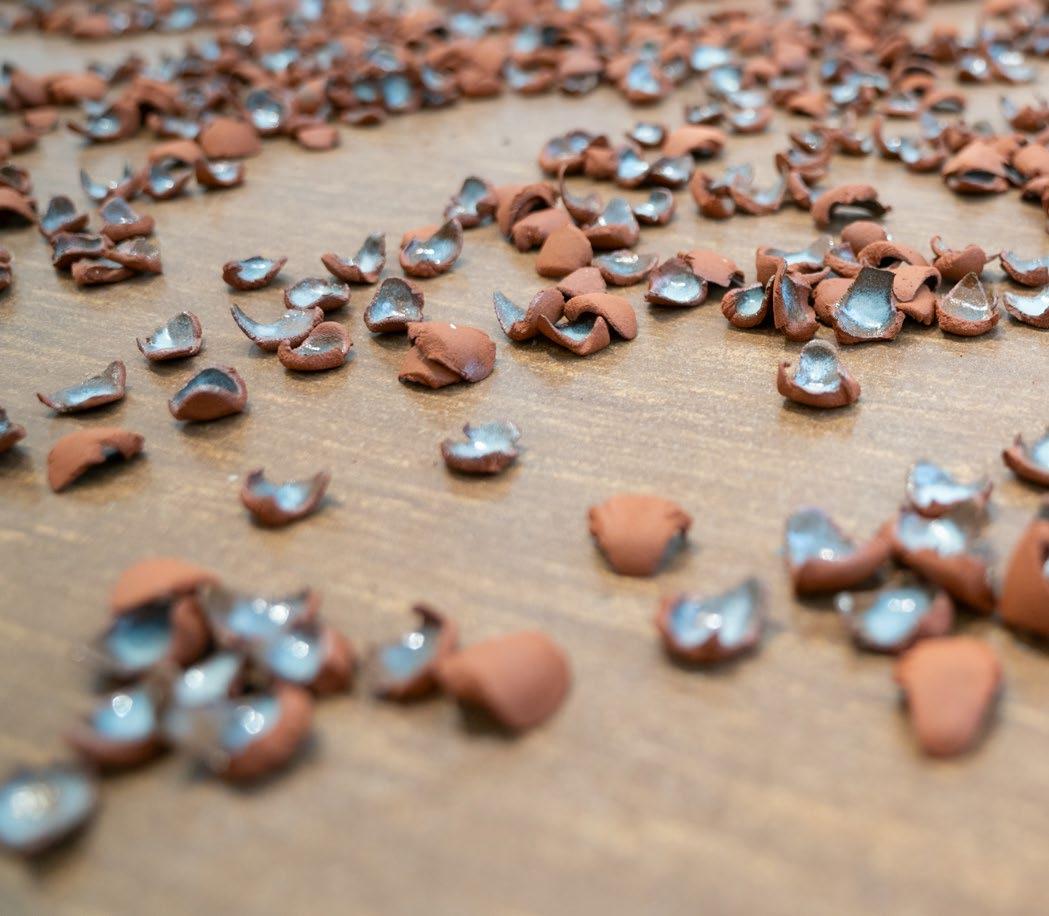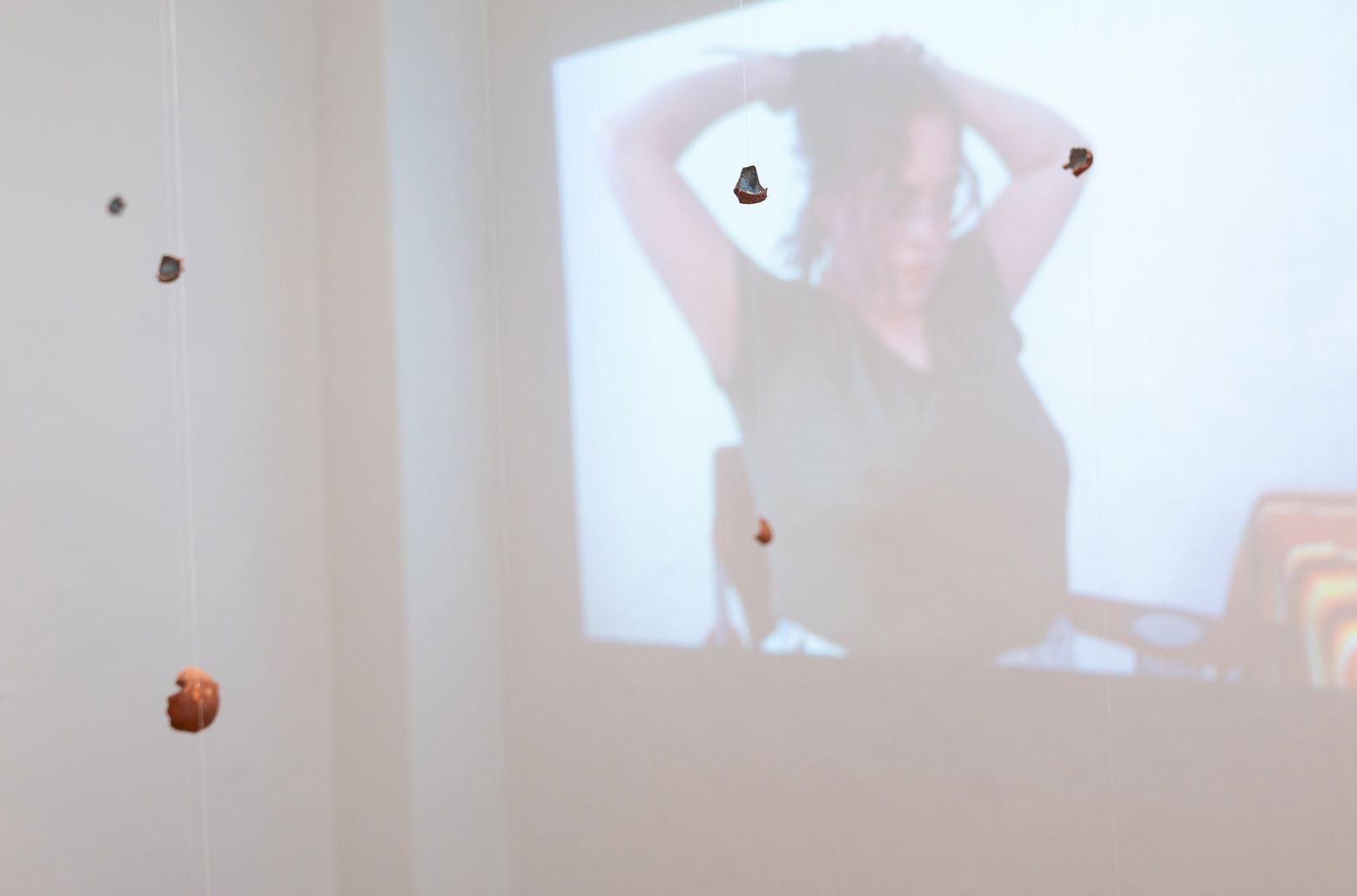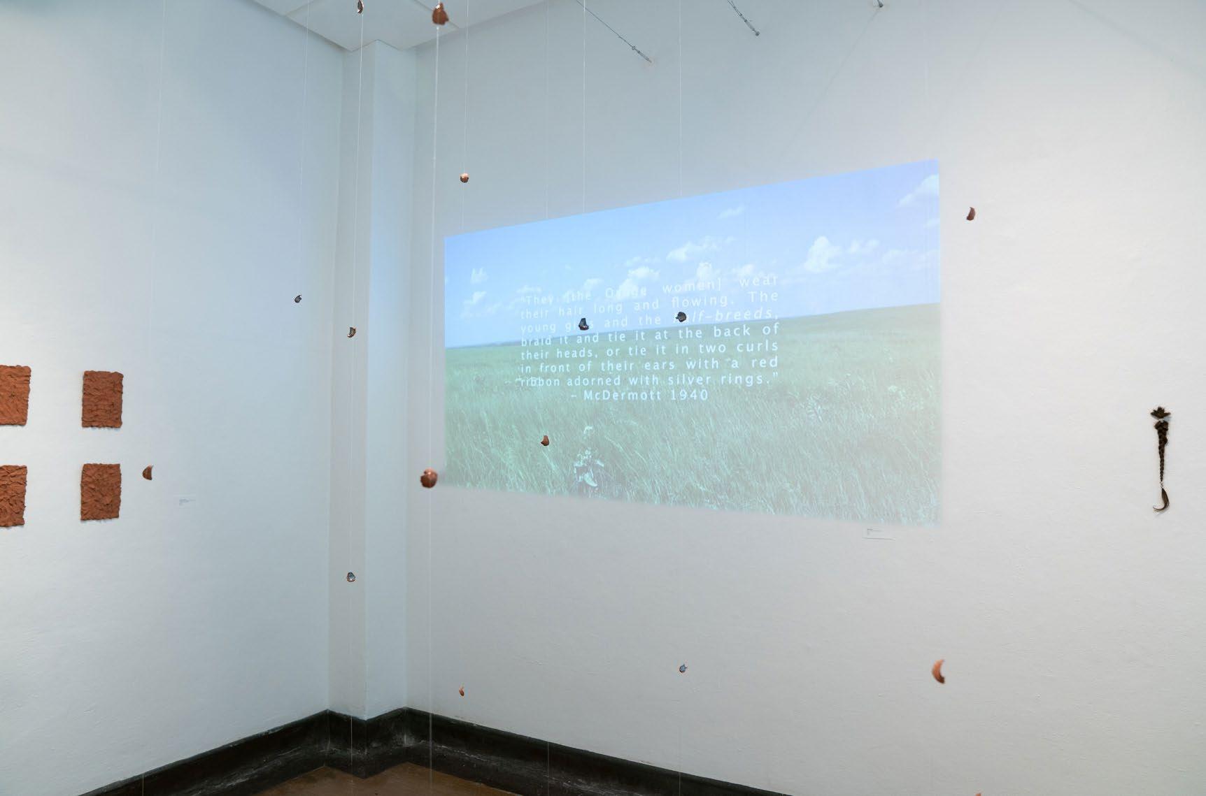 In Cortney YellowHorse-Metzger’s solo exhibition, Theh-wah-ho^ Pah-hun^-leh Kah-xah Be (Keep Respect for Your People First), we see similar themes of identity, physicality, and place. She combines ceramic and video performance to create an exhibition that offers vulnerability and introspection with power and confidence. Clay harvested from her home lands becomes a conduit to connect with her heritage and her people. The centerpiece, and anchor of the exhibition, a ceiling to floor installation of beautiful cascading bits of fired clay, perfectly showcases the power of Cortney’s practice. Her work, while incredibly personal, is curated with clarity and precise intention.