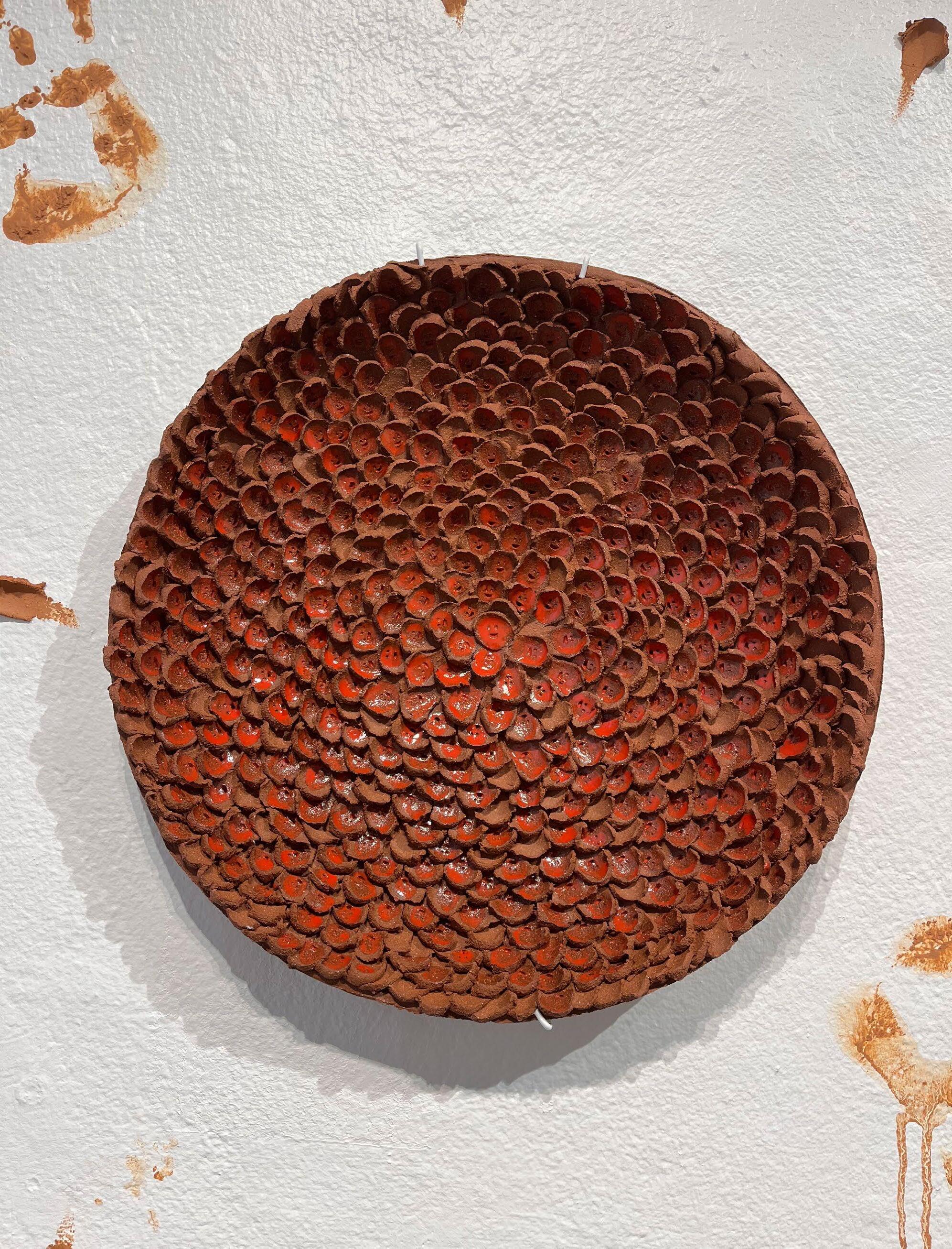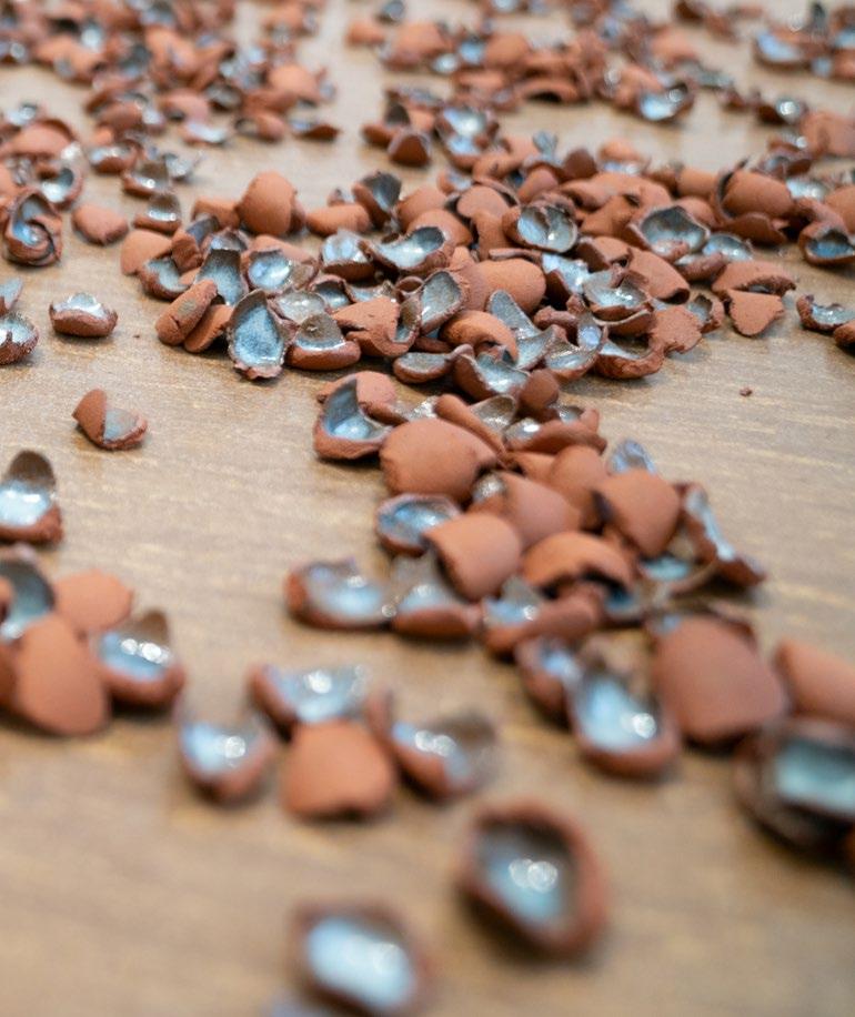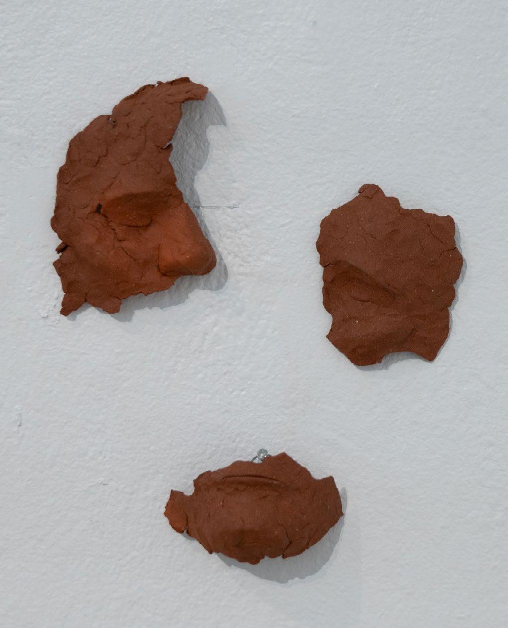 In Cortney YellowHorse-Metzger’s solo exhibition, Theh-wah-ho^ Pah-hun^-leh Kah-xah Be (Keep Respect for Your People First), we see similar themes of identity, physicality, and place. She combines ceramic and video performance to create an exhibition that offers vulnerability and introspection with power and confidence. Clay harvested from her home lands becomes a conduit to connect with her heritage and her people. The centerpiece, and anchor of the exhibition, a ceiling to floor installation of beautiful cascading bits of fired clay, perfectly showcases the power of Cortney’s practice. Her work, while incredibly personal, is curated with clarity and precise intention.