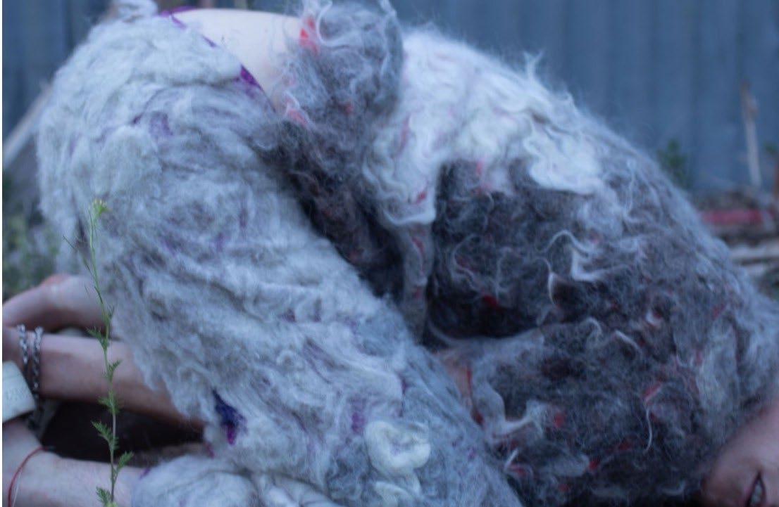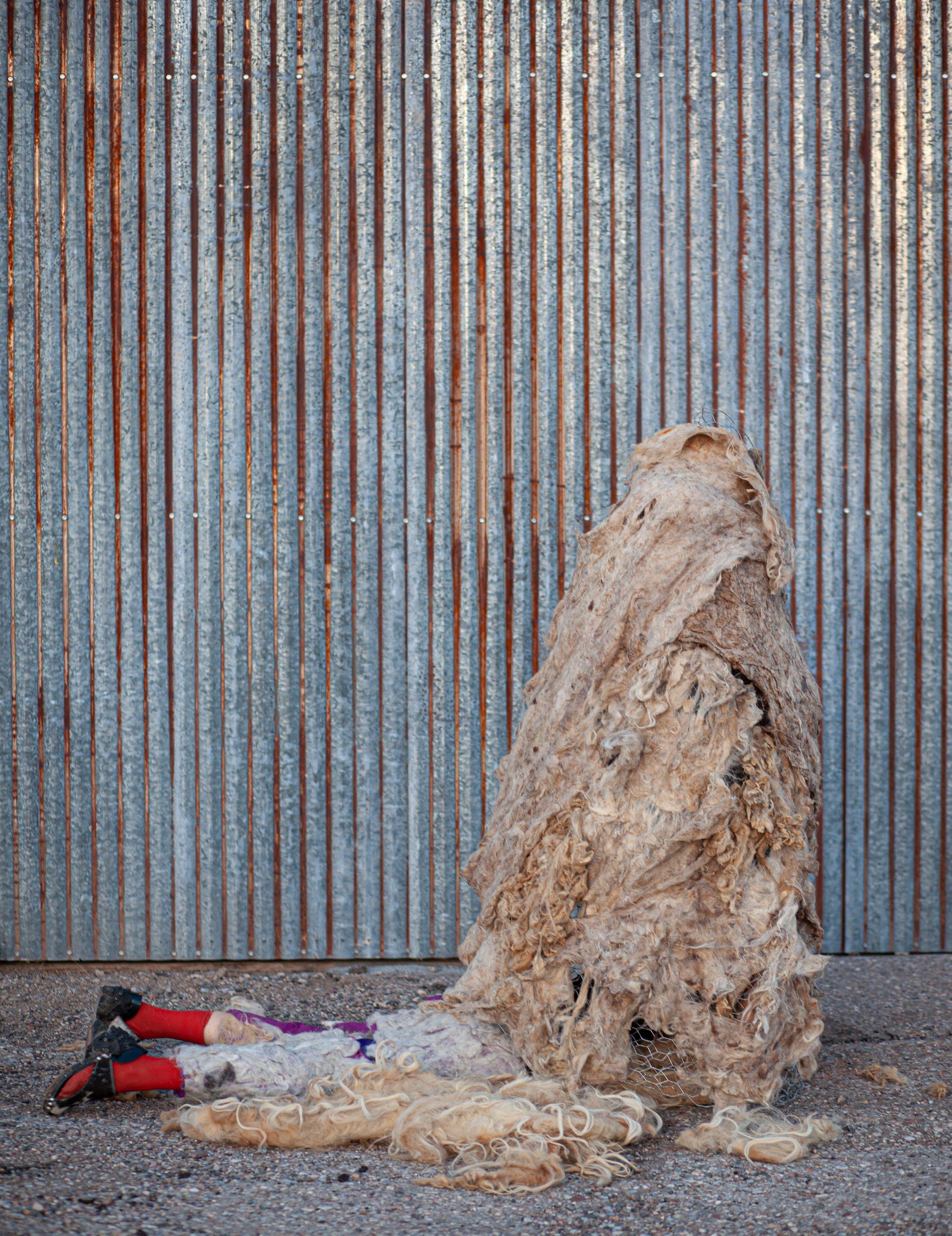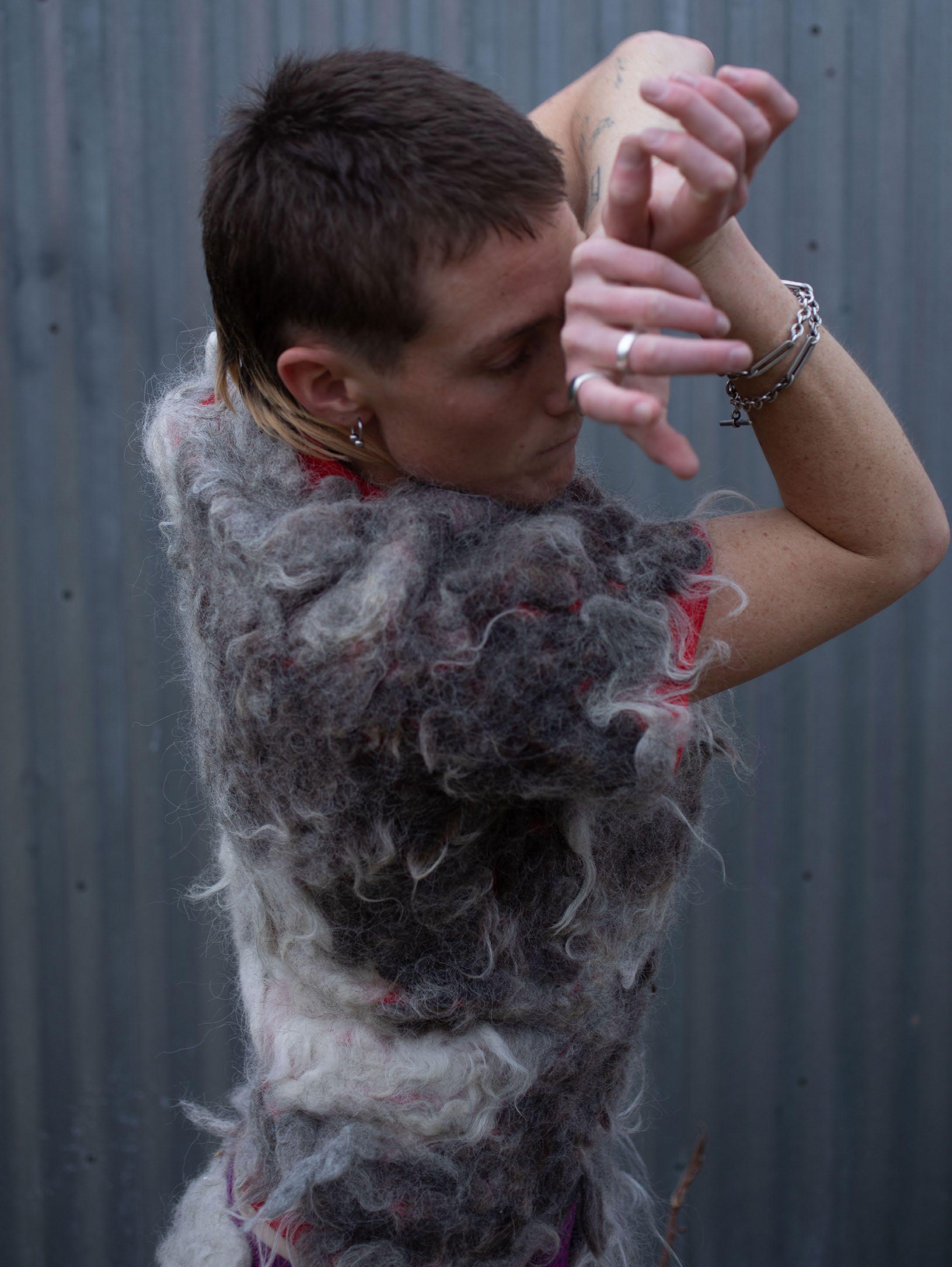 Row Särkelä makes costumes and performances that are playful, kinky, creepy, and sometimes disgusting. Costume and adornment are gateways for experimentation and ritual, rather than products to purchase. Bodies can enter Särkelä’s needle-felted garments and feel tightly animal, interacting with the barnyard/graveyard/compost scent of the raw churro fleece. Bodies can enter Särkela’s larger-than-life sculptural environments constructed from fleece and discarded chicken wire and embrace the body’s capacity to shed, disintegrate, and slither. The garments’ tightness allow the ribs to feel their edges against the animal feeling of the felt, while the looseness of the massive sculptural form allow breath to navigate the gap between body and costume. The tight and loose spaces (outfit/habitat) embrace the repulsive and alluring in order to facilitate different forms of discomfort and pleasure, expand the breath in different directions, & break habitual patterns of moving and storytelling. Särkelä’s work emanates a death clown energy.