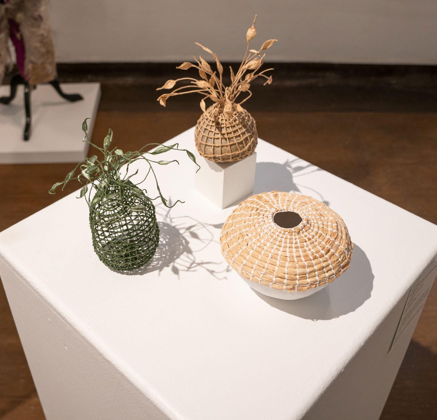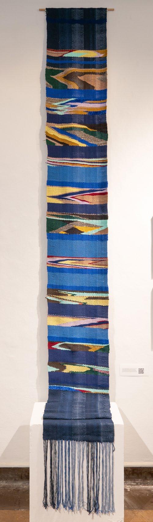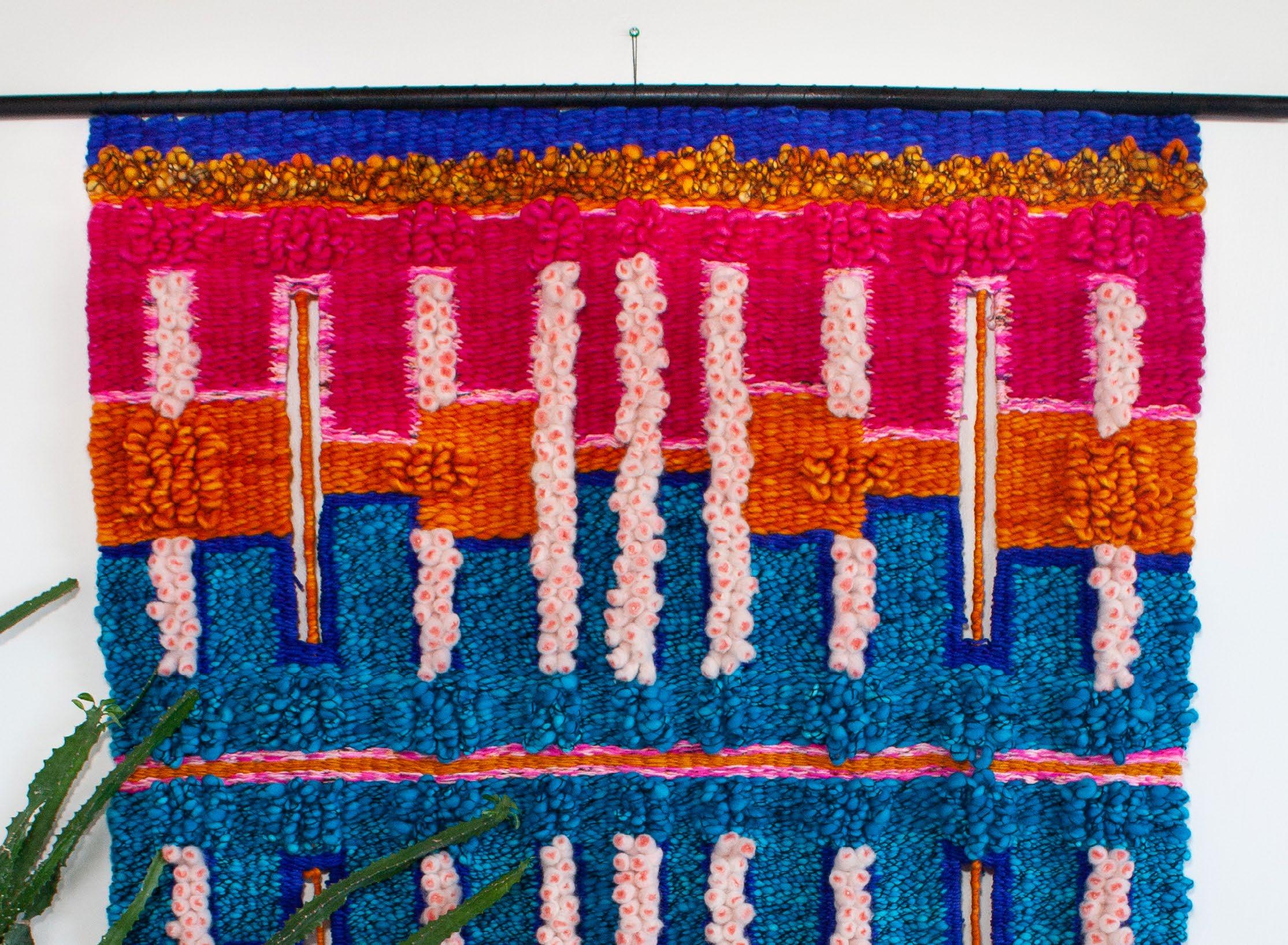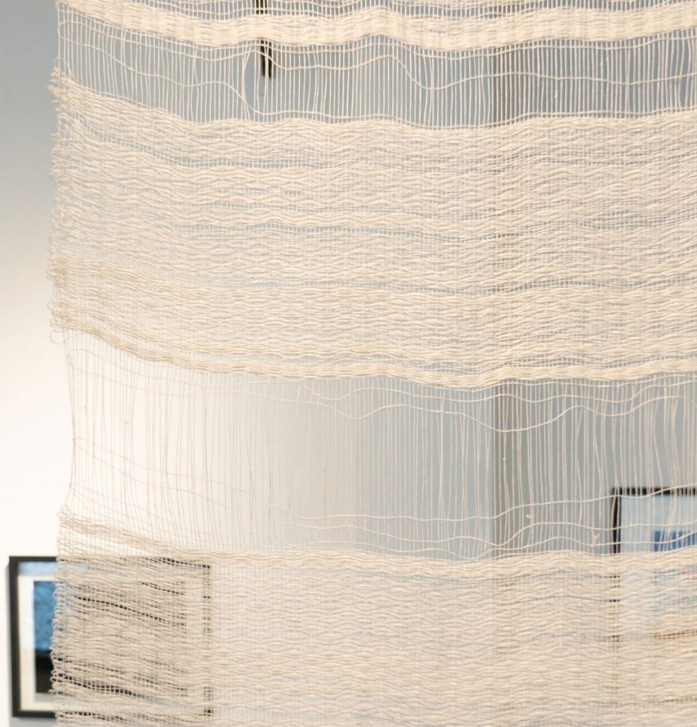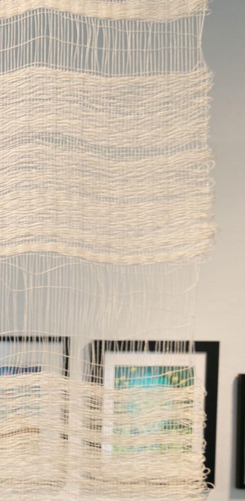 With small vessels, Carrie Botto creates cocoons of wonder. Her sculptural weavings are delicate yet strong, especially evident in the pieces that grow like tenderlas of vine around rock. A lifesize cocoon by Row Särkelä hangs from the ceiling nearby, offering a literal space for visitors to tuck away and hide. Row’s practice blends performance and textile arts, exploring transformation and adornment. Leigh Oviatt weaves works that are alive with movement, texture and color. Her work is warm in both the figurative and literal sense. The rhythmic pattern of her weavings and their plush presence radiate with a frequency that evokes meditation and joy.