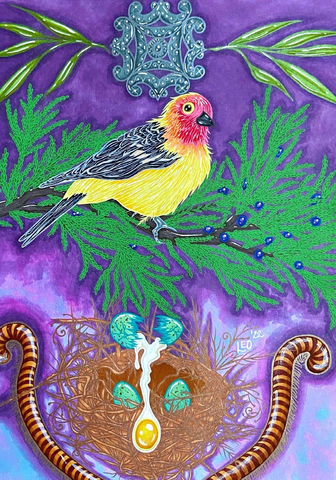 Leviathan O’Neil offers whimsy, intimacy, and truth in his semi-autobiographical illustrations. With mastery of his mediums, he creates lush and surreal renderings that are lovingly detailed with imagery from the natural world, creating deep personal symbology. Monika Guerra’s self portraits in oil create ”different planes of existence.” With their larger than life scale and deeply intentional rendering, her paintings command strength. They occupy this world, while simultaneously pulling the viewer into another.