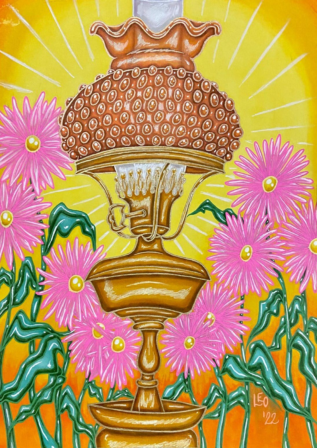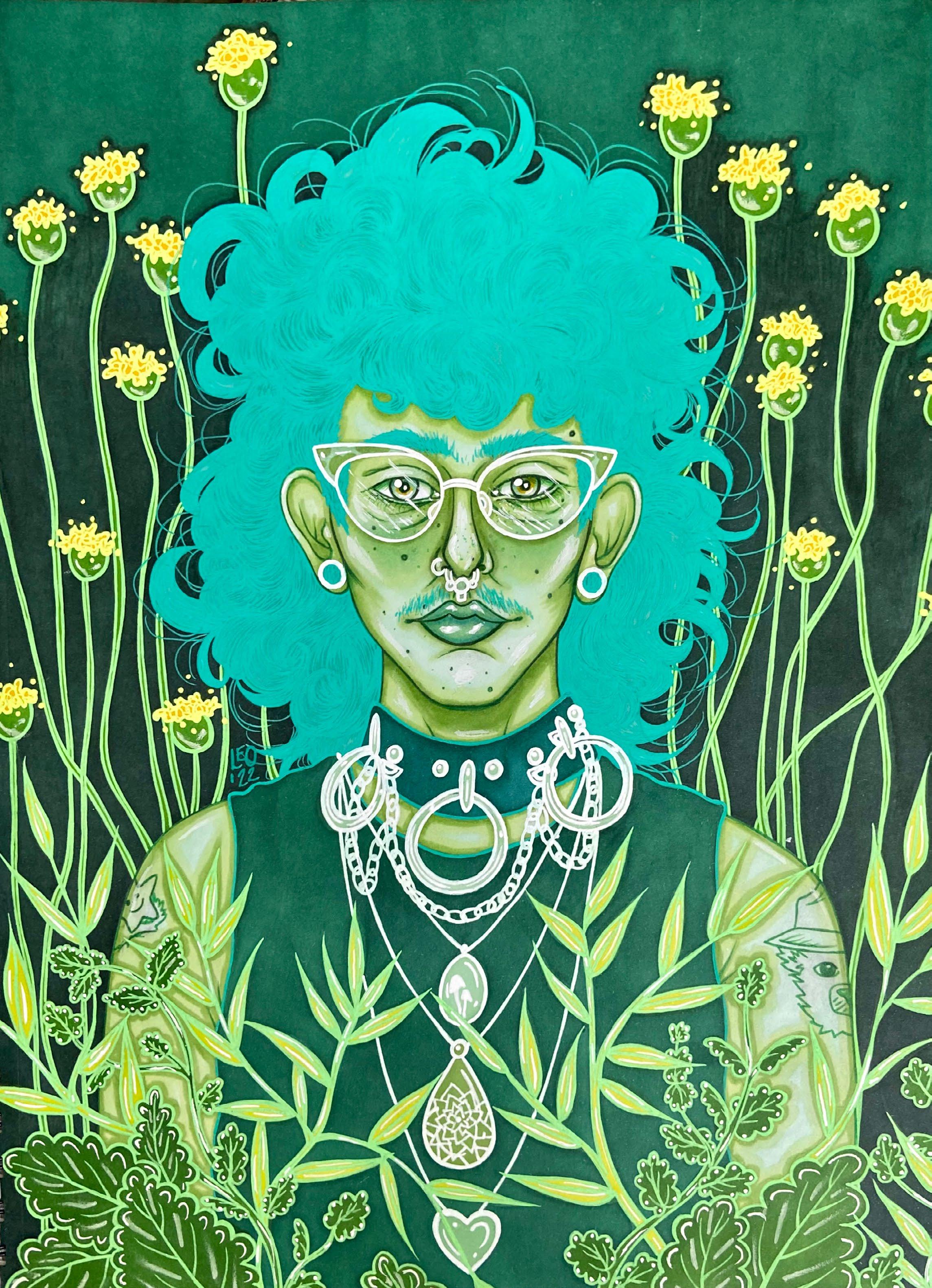 Born and raised in Albuquerque, New Mexico, Leviathan O’Neil’s body of work is informed by the New Mexican landscape and life in Albuquerque. They are trans-masculine and use he/him and they/them pronouns. The driving force behind his artistic practice is healing in many forms: identity, processing trauma, and grappling with spirituality. They want to break the cycle of generational trauma, using art as a tool. He was born with a cleft palate, originally turning to art to express what couldn’t be said aloud. Art remains a lifeline throughout struggles with mental health and healing. Leviathan has had a deep appreciation for plants, animals, and nature from a young age. They are always eager to learn more about herbalism, ethical harvesting methods, and all things environmental. This love of nature shines through in the use of plant symbolism within their artwork. Lately, he has been focused on resiliency through grieving.
