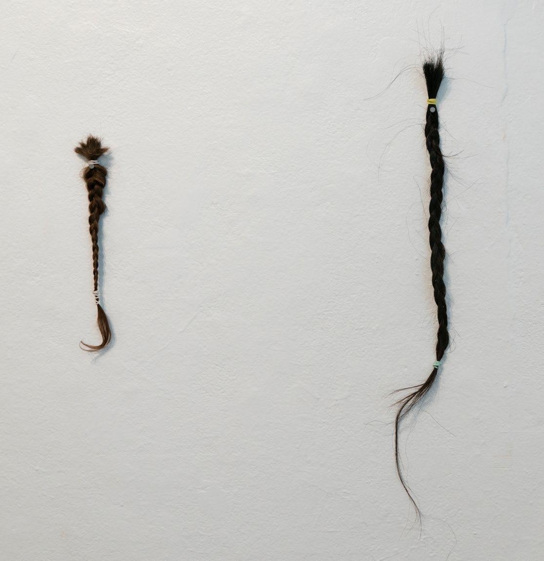 Theh-wah-ho^ Pah-hun^-leh Kah-xah Be addresses ideas of cultural identity and connection to those that came before. As a registered Osage citizen and daughter of a white cowboy father, Yellowhorse-Metzger confronts the pain of colonization while paying respect to her ancestors. Letting the clay speak for itself by keeping most of it unglazed she opens a dialog with the clay and her hands. She purposefully leaves each finger print in the clay to strengthen the connection to the material. Using the handprint, a symbol that when worn on Osage regalia means friendship, Yellowhorse-Metzger invokes reciprocity with her ancestors. The cutting of her braid is a rejection to the term “half breed” or mixed blood and is a way of healing her own personal pain tied to those words. Comparing her braid to that of a horse tail she hopes to create a conversation about blood quantum and the hurtful history of otherness. But is also a nod to the deep history that horses have played on both sides of her family.