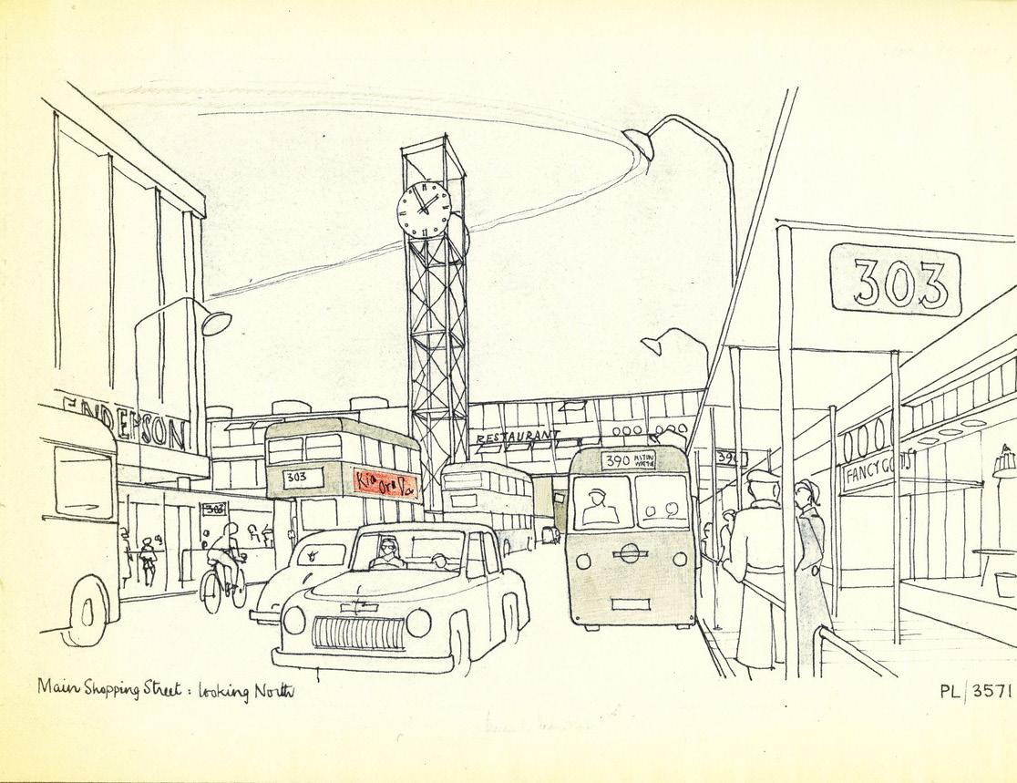 pedestrian-only shopping centre of its kind in the country. Others quickly followed and nowadays traffic-free shopping is the norm, but back in the 1950s it was a truly radical idea. New town residents fought hard to make it a reality as opposition from the Ministry of Housing and Local Government and retailers led to arguments at the Development Corporation over which model to adopt: the more traditional high street or the pedestrianonly version favoured by the lead architect and his team. By September 1953, the Corporation’s architects were